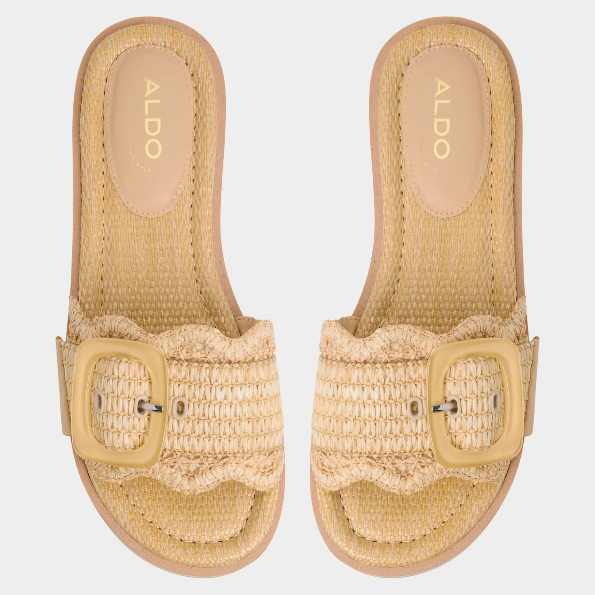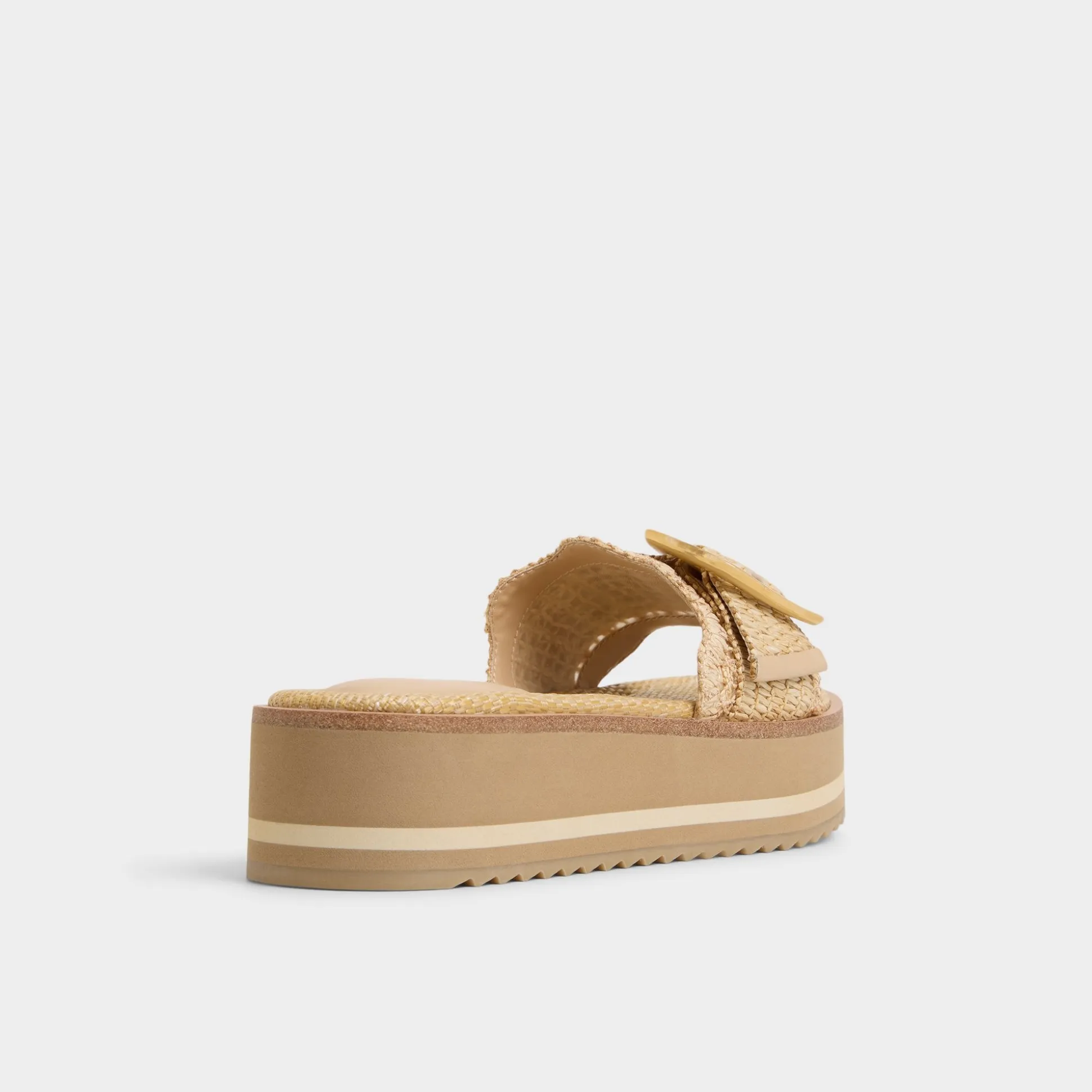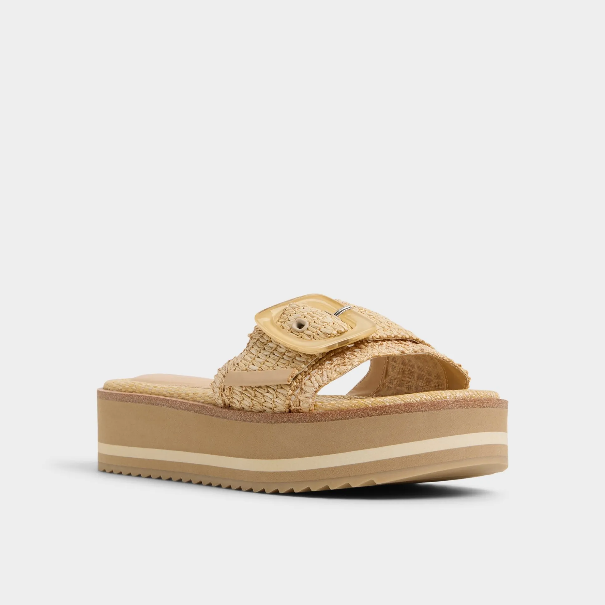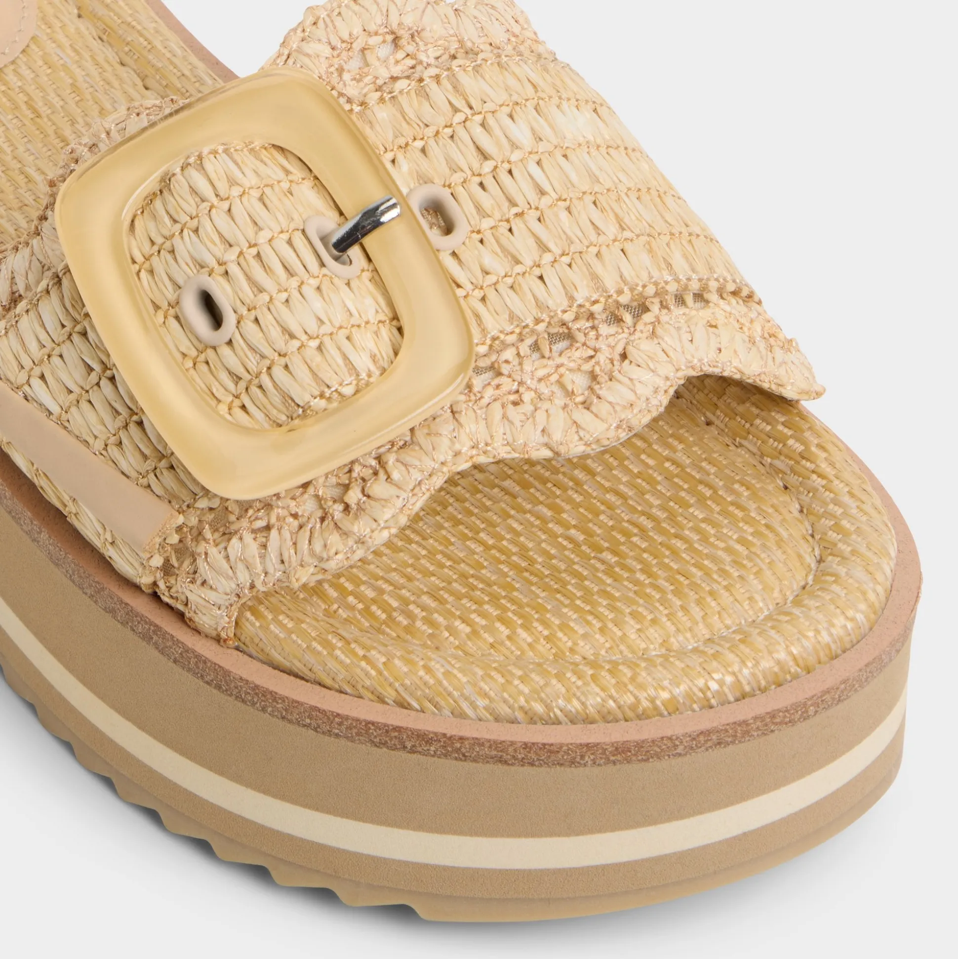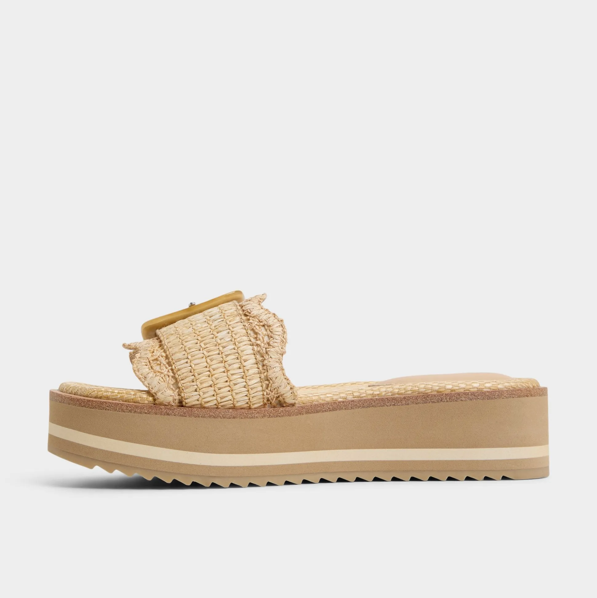 Chunky striped flatform soles give you festival-height without wobble while scalloped raffia strap crowned by oversized buckle brings beachfront texture and all-day cushy support straight to city sidewalks. Pair wide-leg linen for market strolls or ground slinky midi when patio cocktails drift toward impromptu rooftop gigs.