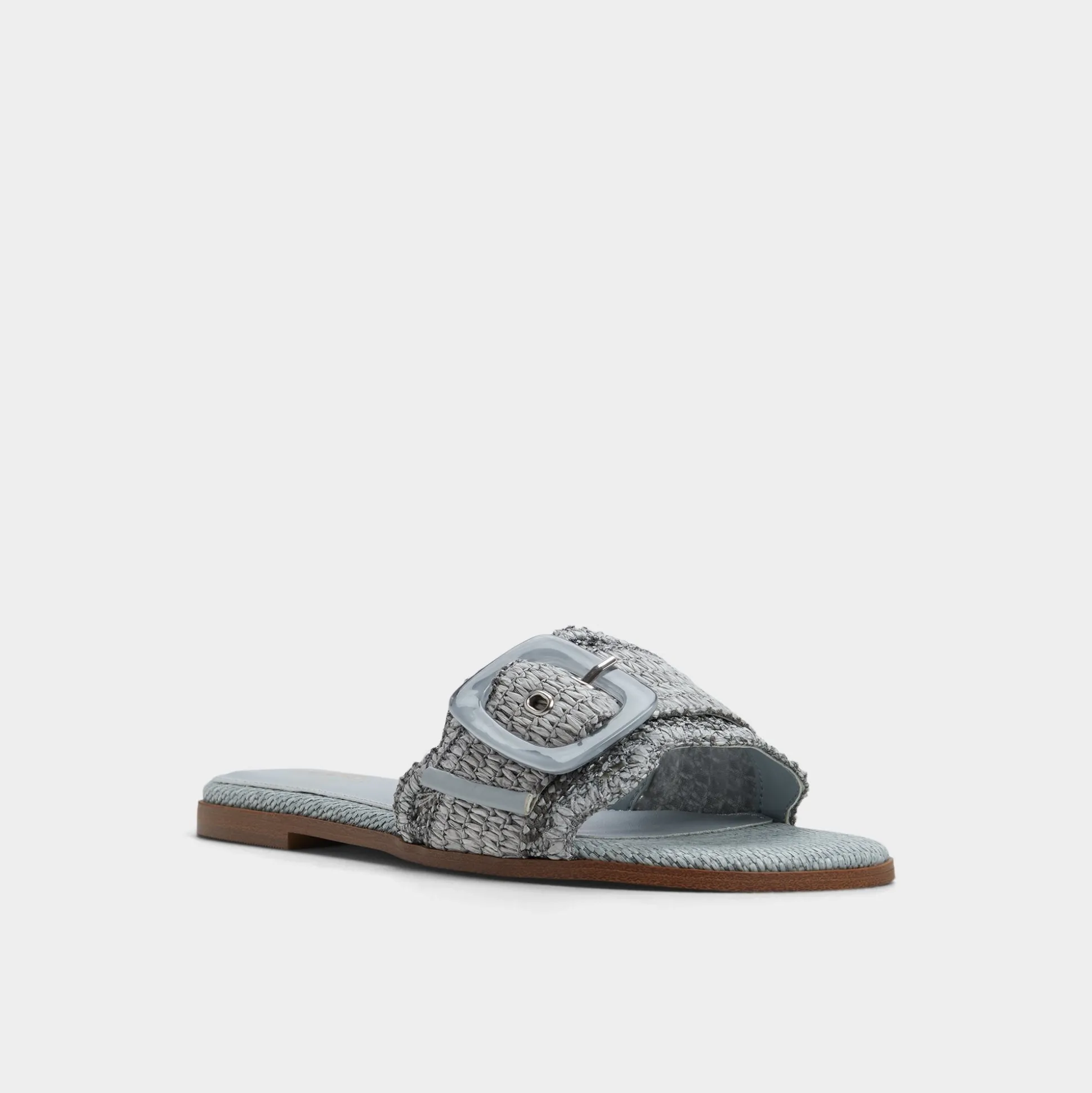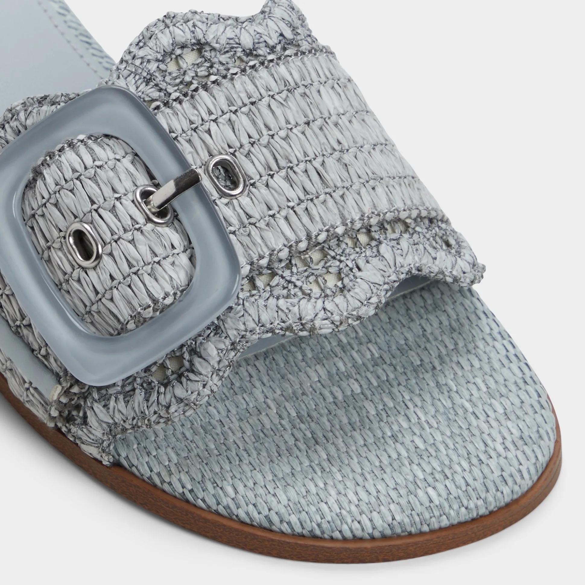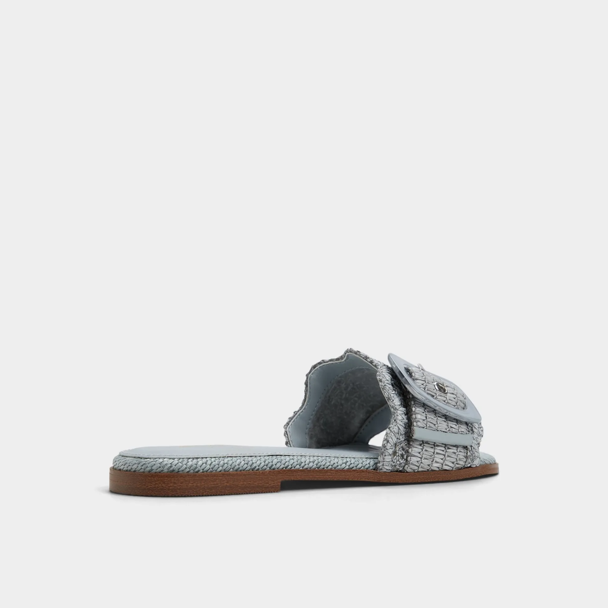 Sky-blue raffia wraps a breezy slide, crowned by an oversized buckle and a cushioned footbed that keeps every sidewalk dash feeling grounded and polished. Pair cropped denim for brunch hops, or slip beneath a gauzy midi when sunset picnics drift toward spontaneous boardwalk strolls, letting this easy, sun-ready slide do the heavy lifting.