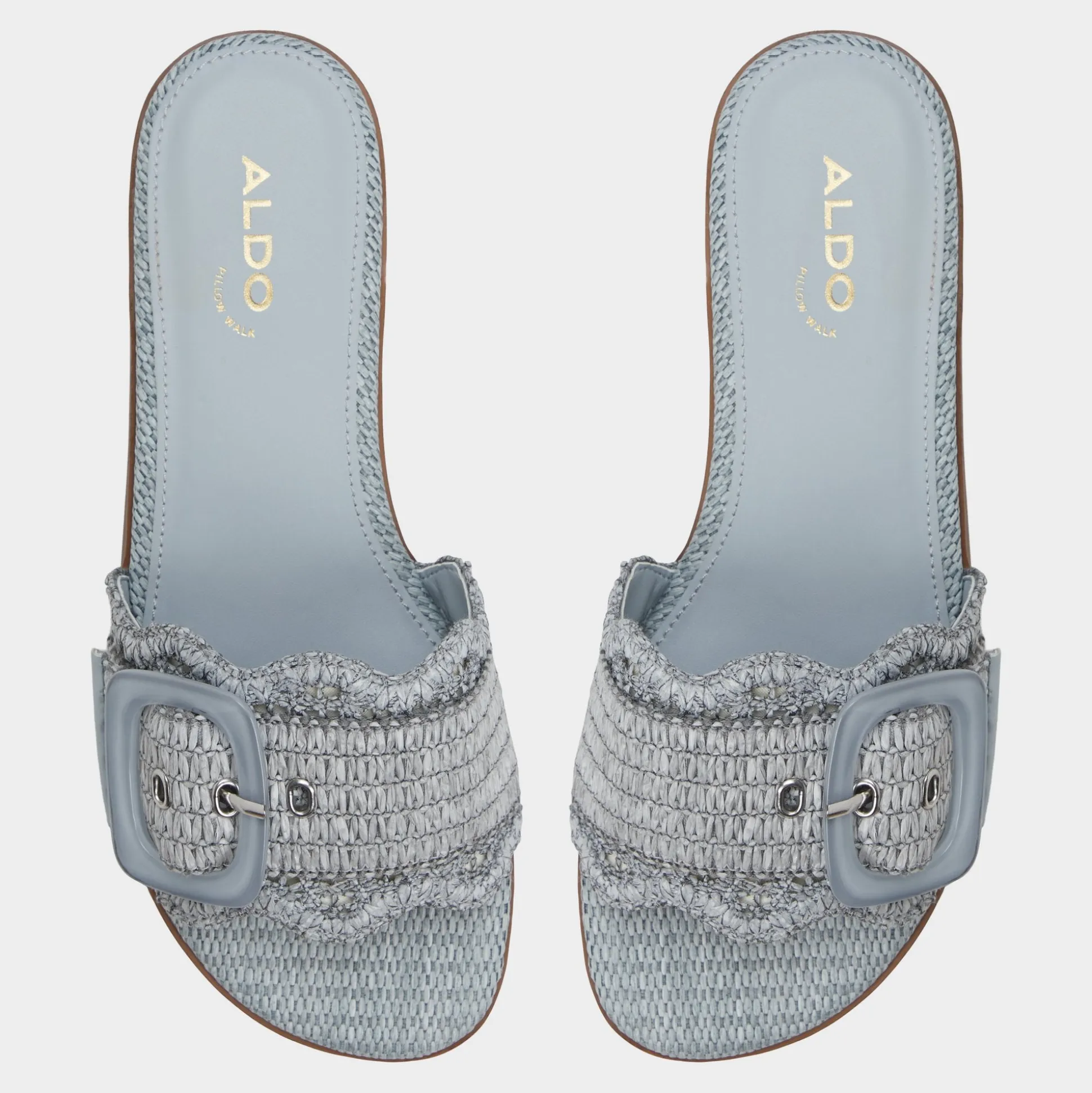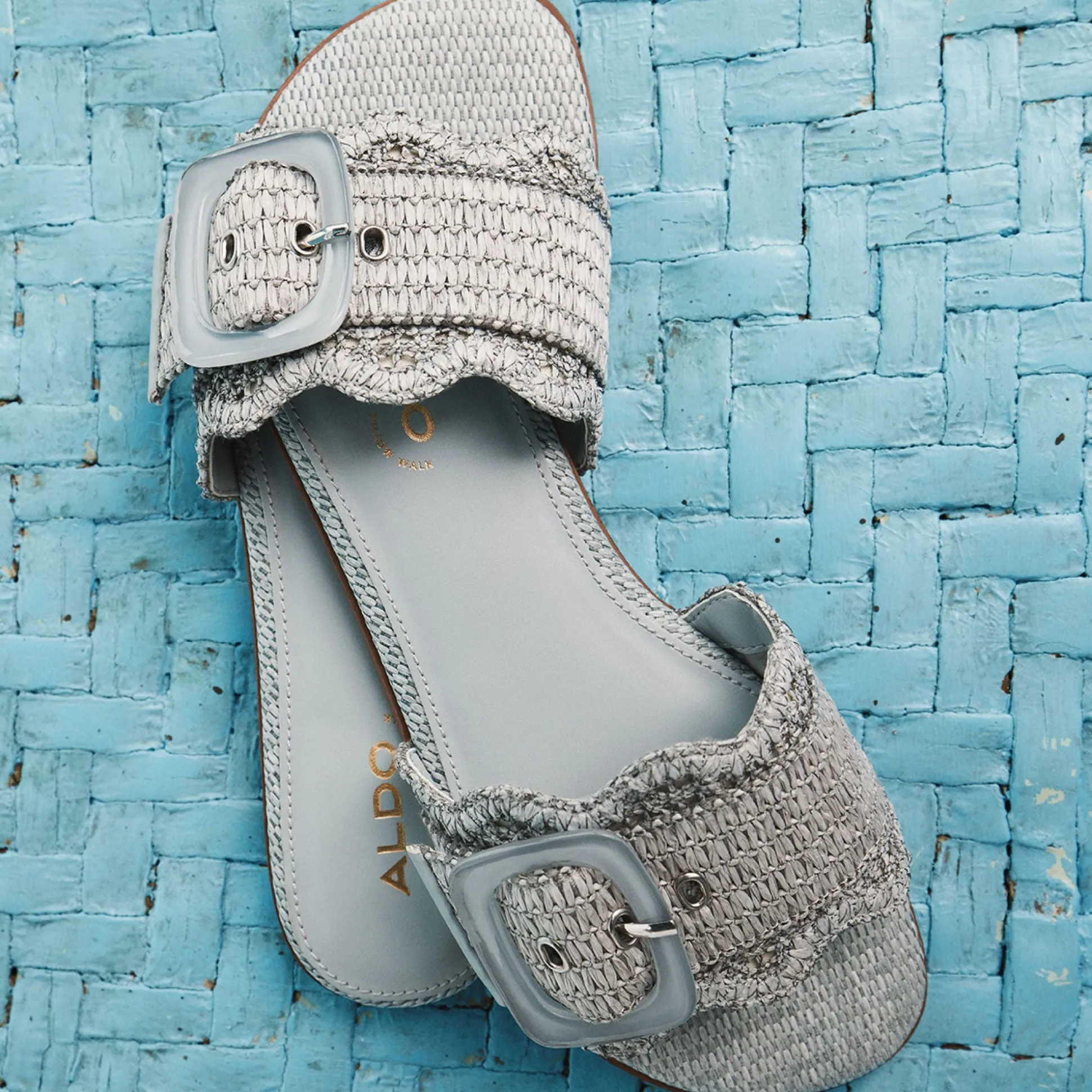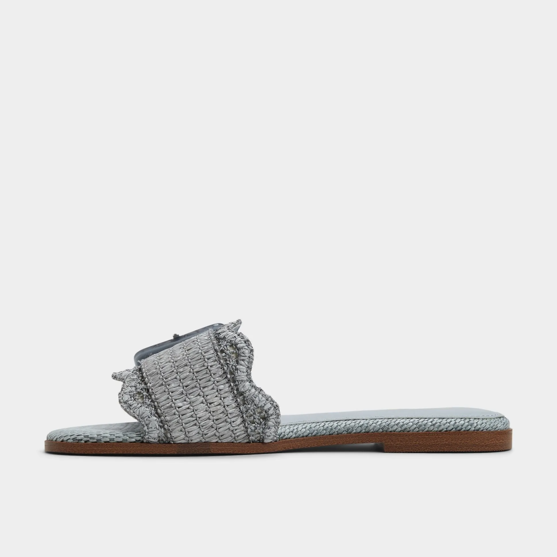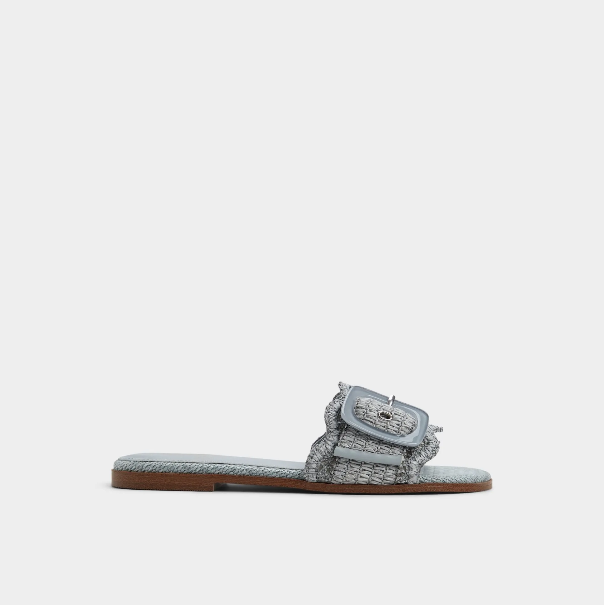 Sky-blue raffia wraps a breezy slide, crowned by an oversized buckle and a cushioned footbed that keeps every sidewalk dash feeling grounded and polished. Pair cropped denim for brunch hops, or slip beneath a gauzy midi when sunset picnics drift toward spontaneous boardwalk strolls, letting this easy, sun-ready slide do the heavy lifting.
