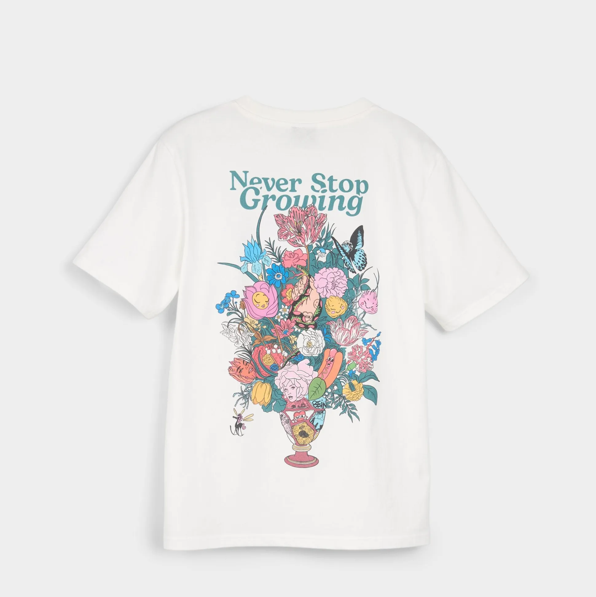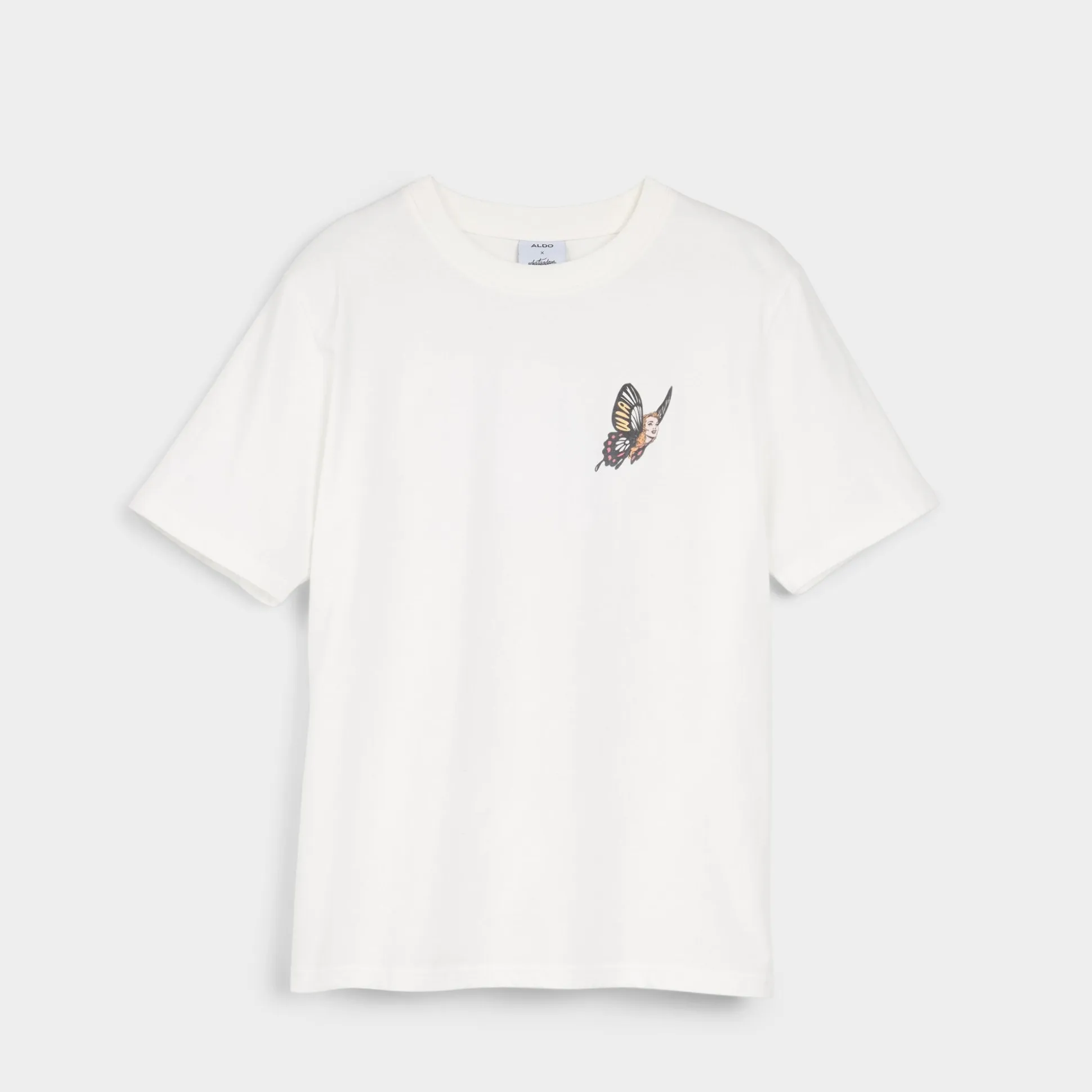 The classic white tee, brought to you by prolific street artist Whatisadam. The butterfly motif from his capsule collection adorns the front of this graphic piece, while the back explodes into a whimsical, pop art expression of the ever-evolving nature of life.