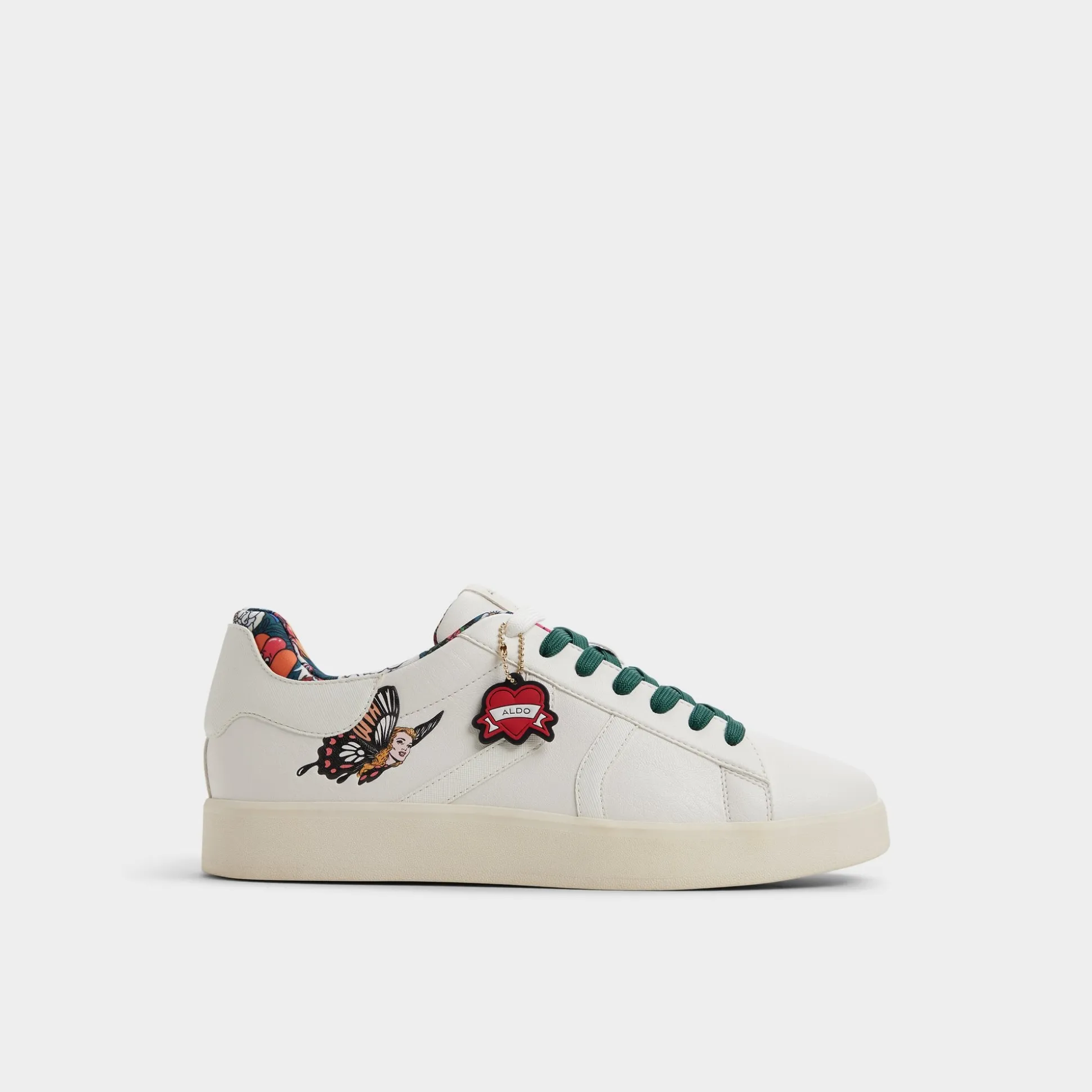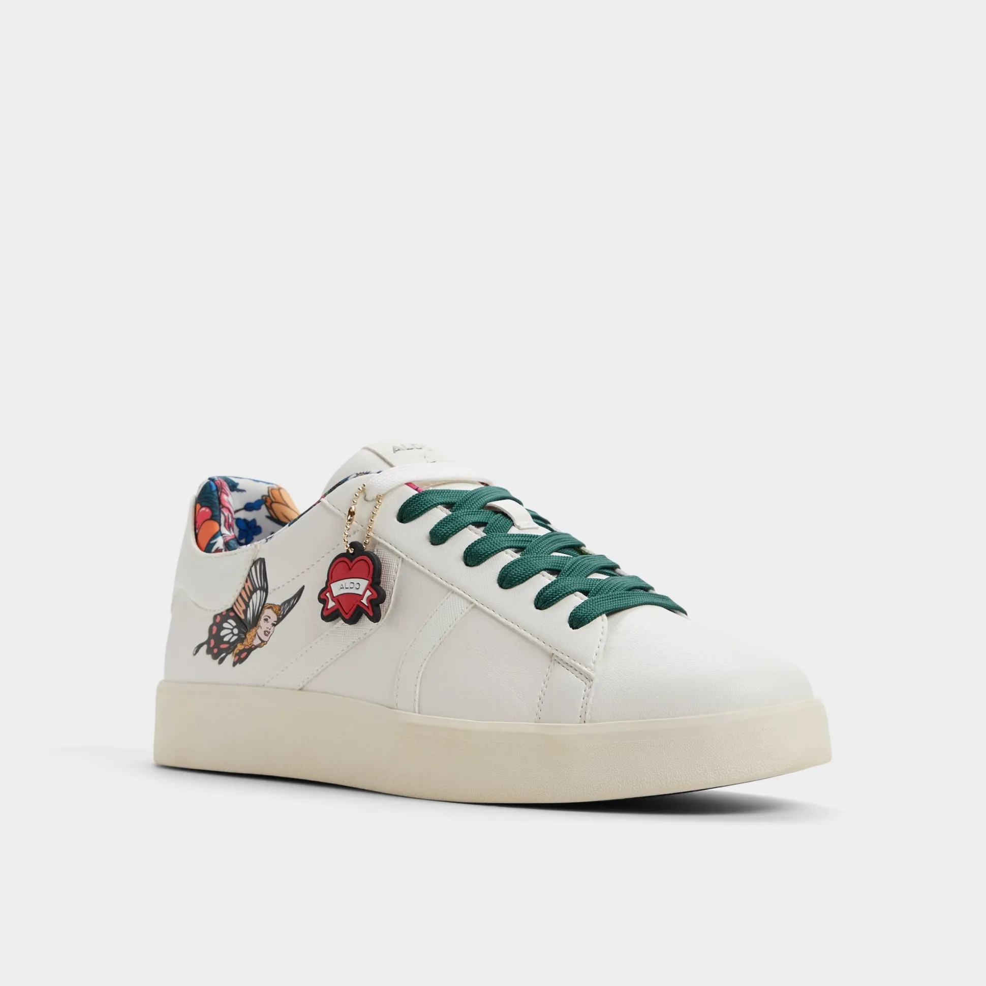Tattoo-inspired butterfly designs cover white synthetic leather, accented by a small enamel embellishment, while a soft lining and lightweight cupsole keep every step easy from dawn commutes to night strolls. Pair distressed jeans for concerts or roll with tapered joggers on weekends—the artistic touch keeps conversations going.
