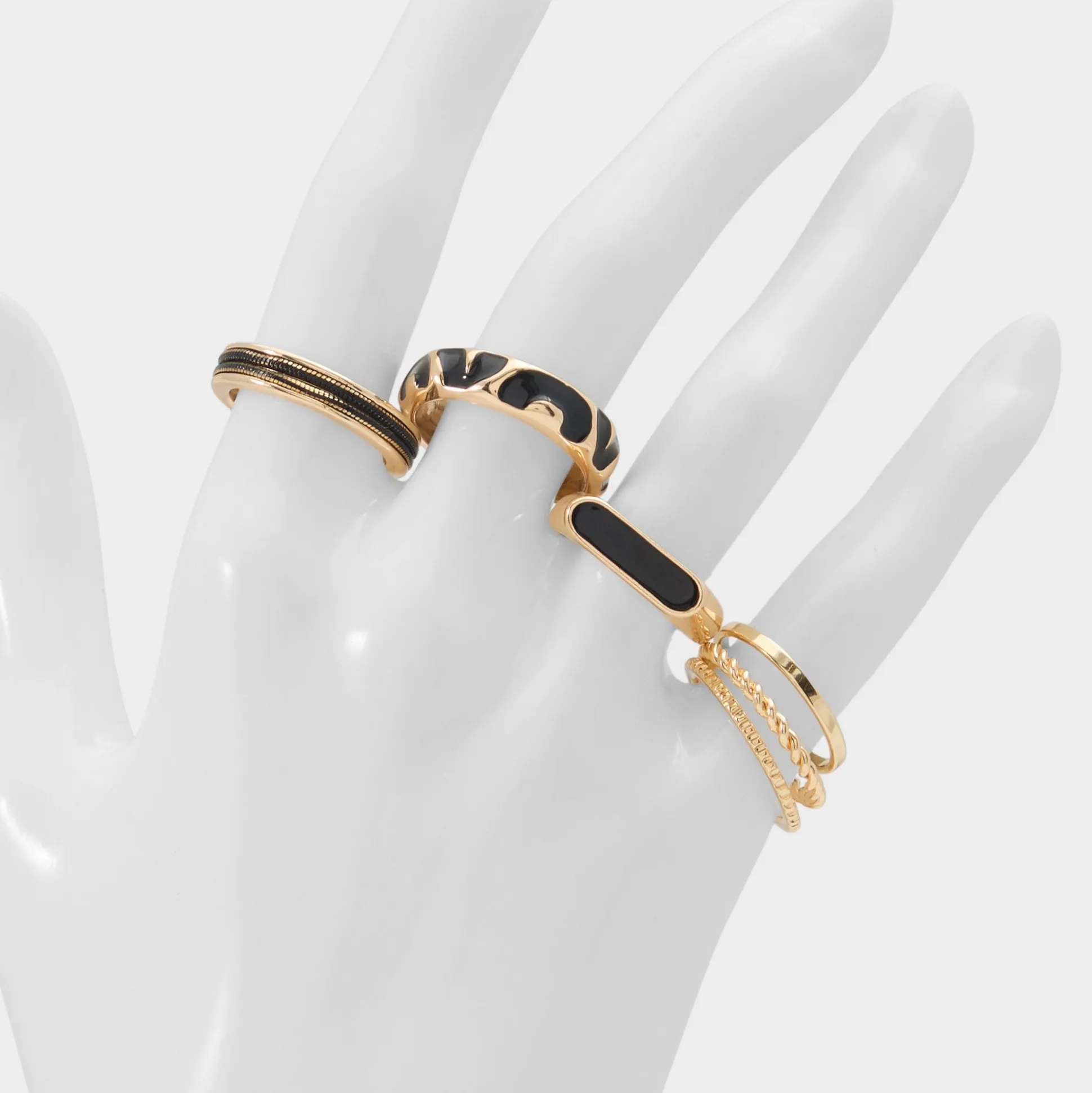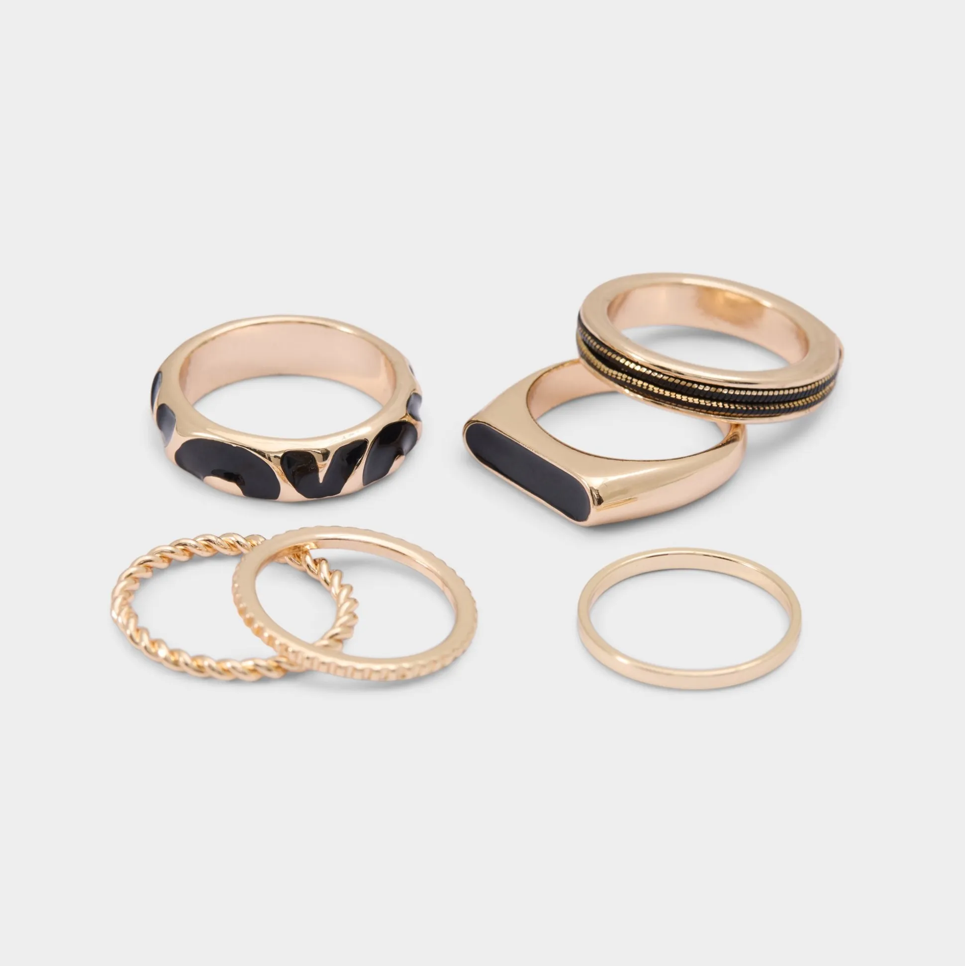 Black enamel waves meet polished gold in bold signet rings, rope twists and smooth bands within this six-piece stack that lets you mix textures across fingers. Wear the full set around campus study hours with lattes or split them between friends-night cocktails to crown glossy nails.