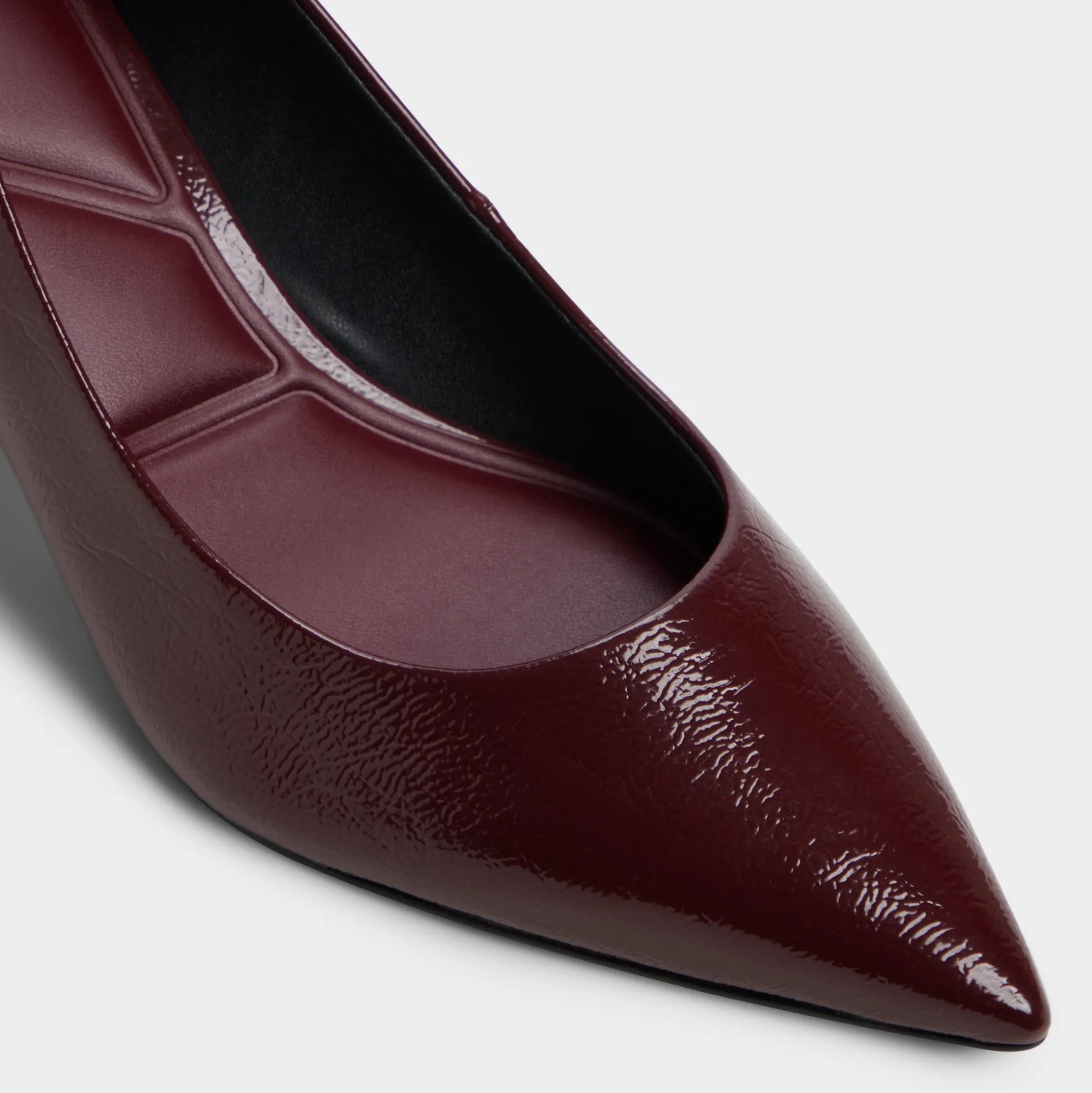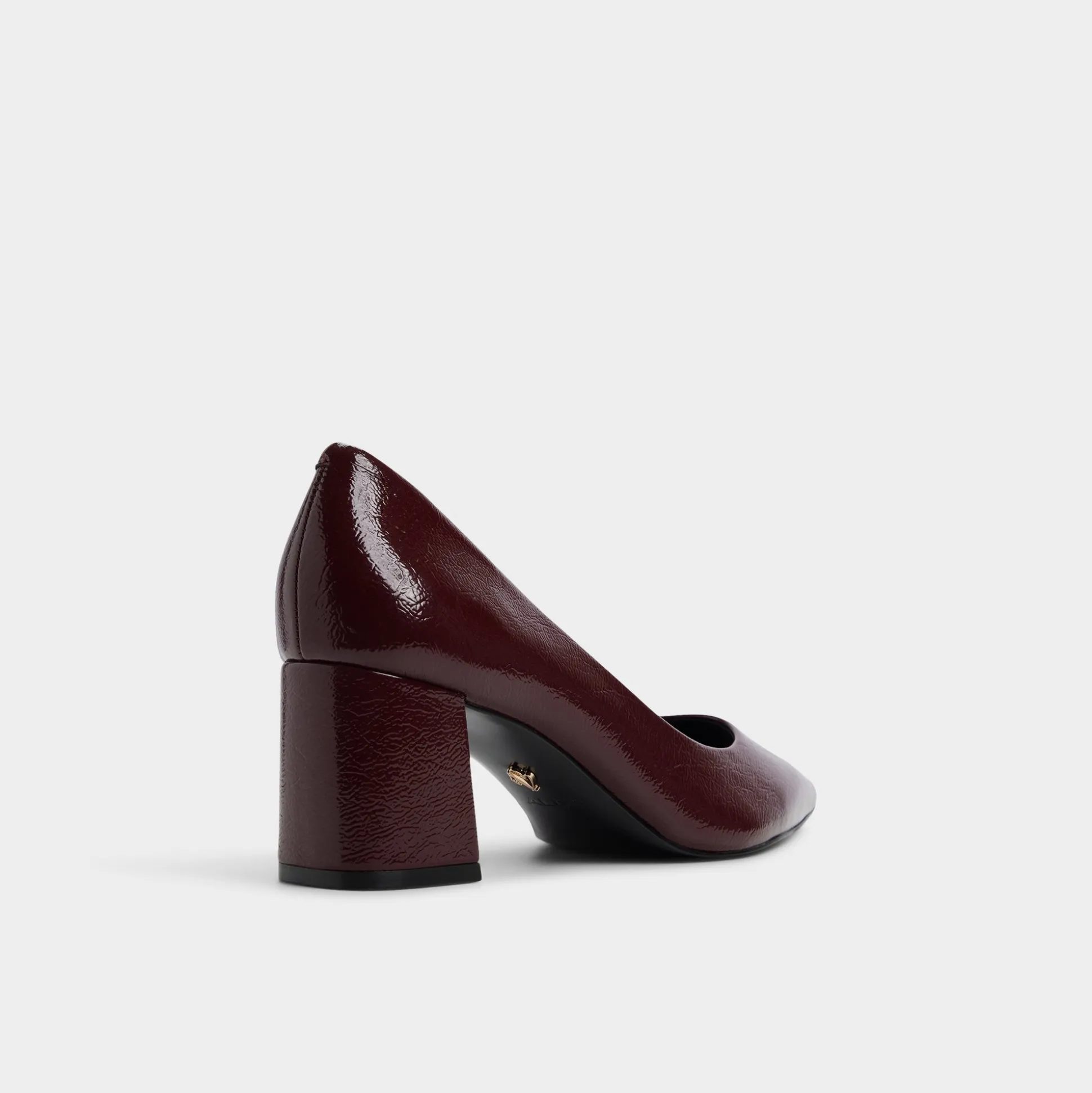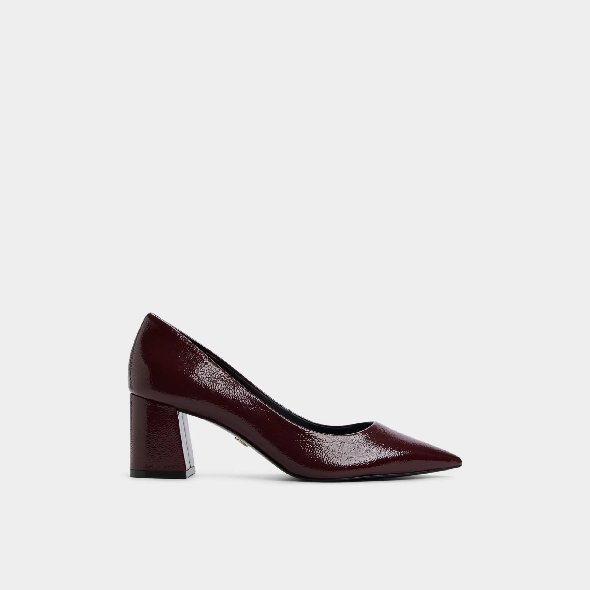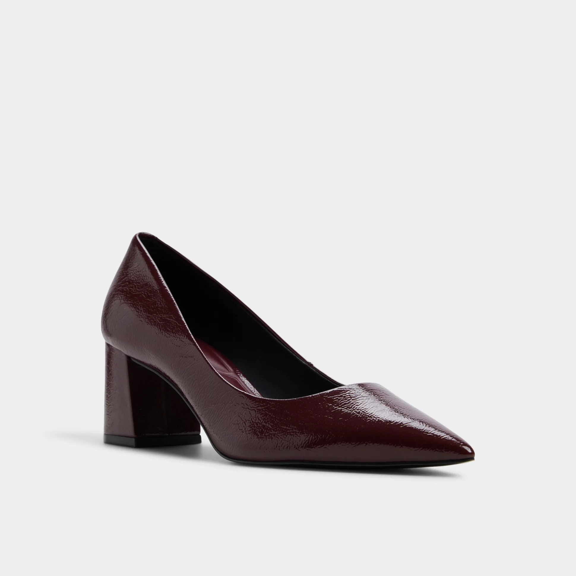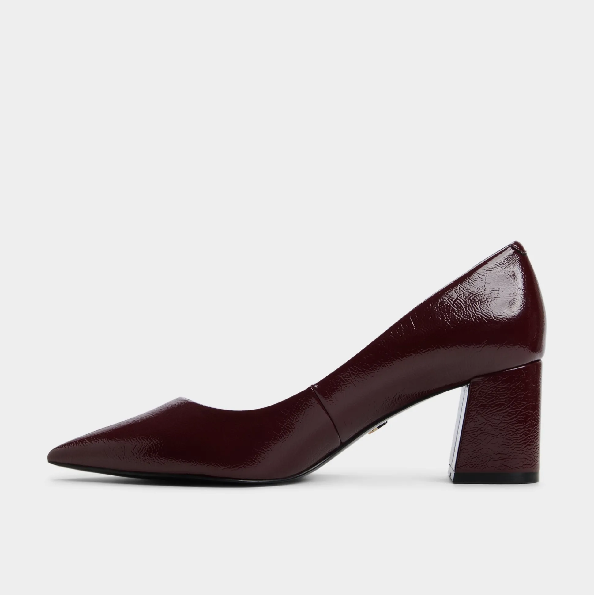 Deep burgundy patent catches the twilight glow while sculpted block heels steady every stride, turning this point-toe pump into a confidence boost that feels equal parts gallery opening and corner-office upgrade. Ground pinstripe suits for pitch mornings or slip under satin wrap dresses once wine-bar plans unfold.