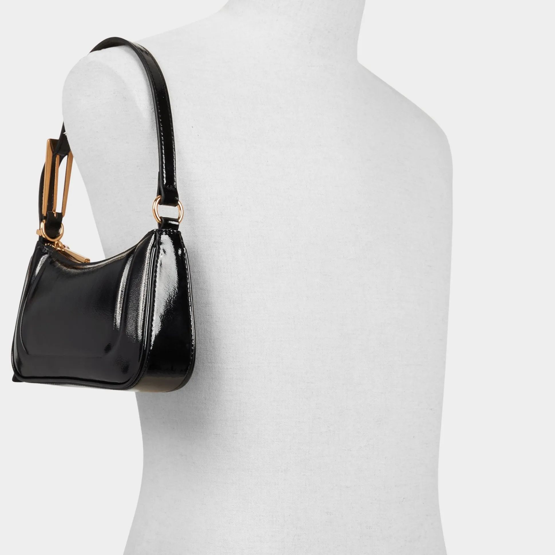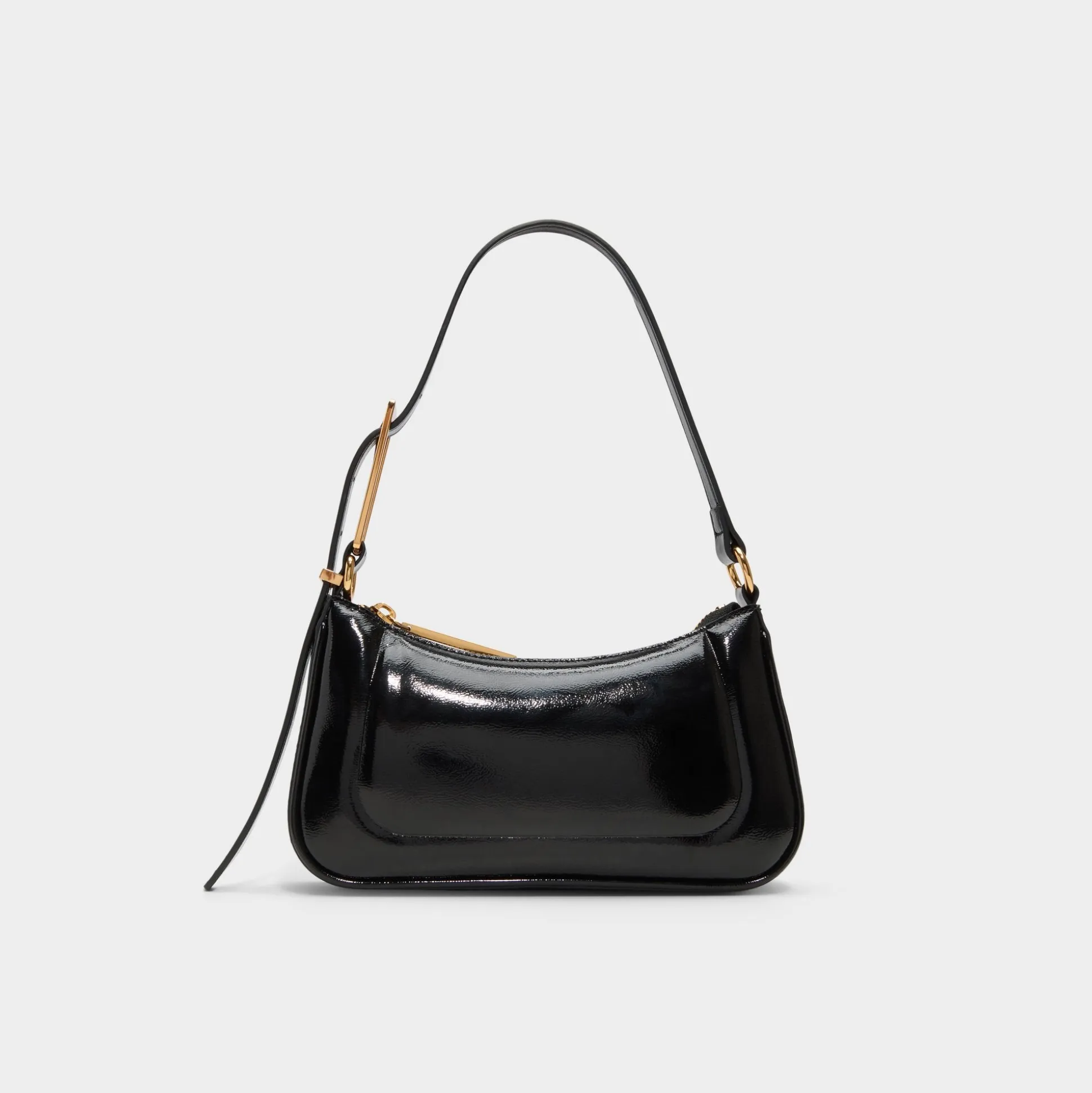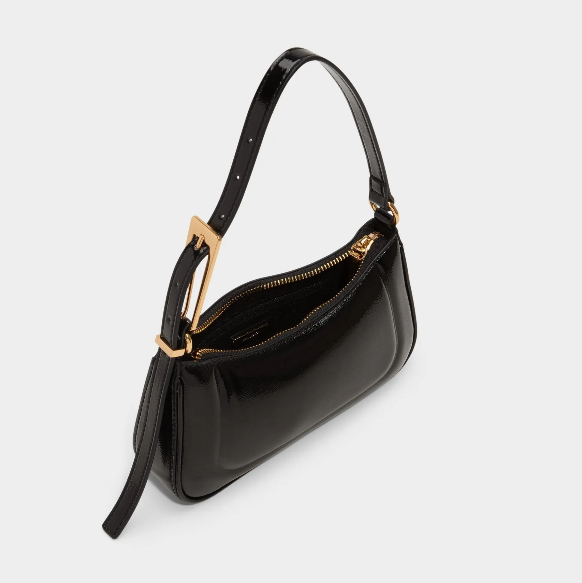 Glossy black patent catches every streetlight and makes this sleek baguette bag glow, with a clip-off shoulder strap that lets you switch from clutch to cross-body in a heartbeat anywhere. Carry it with a slip dress for rooftop dates, or sling it with jeans for coffee runs, finishing outfits with quiet shine.