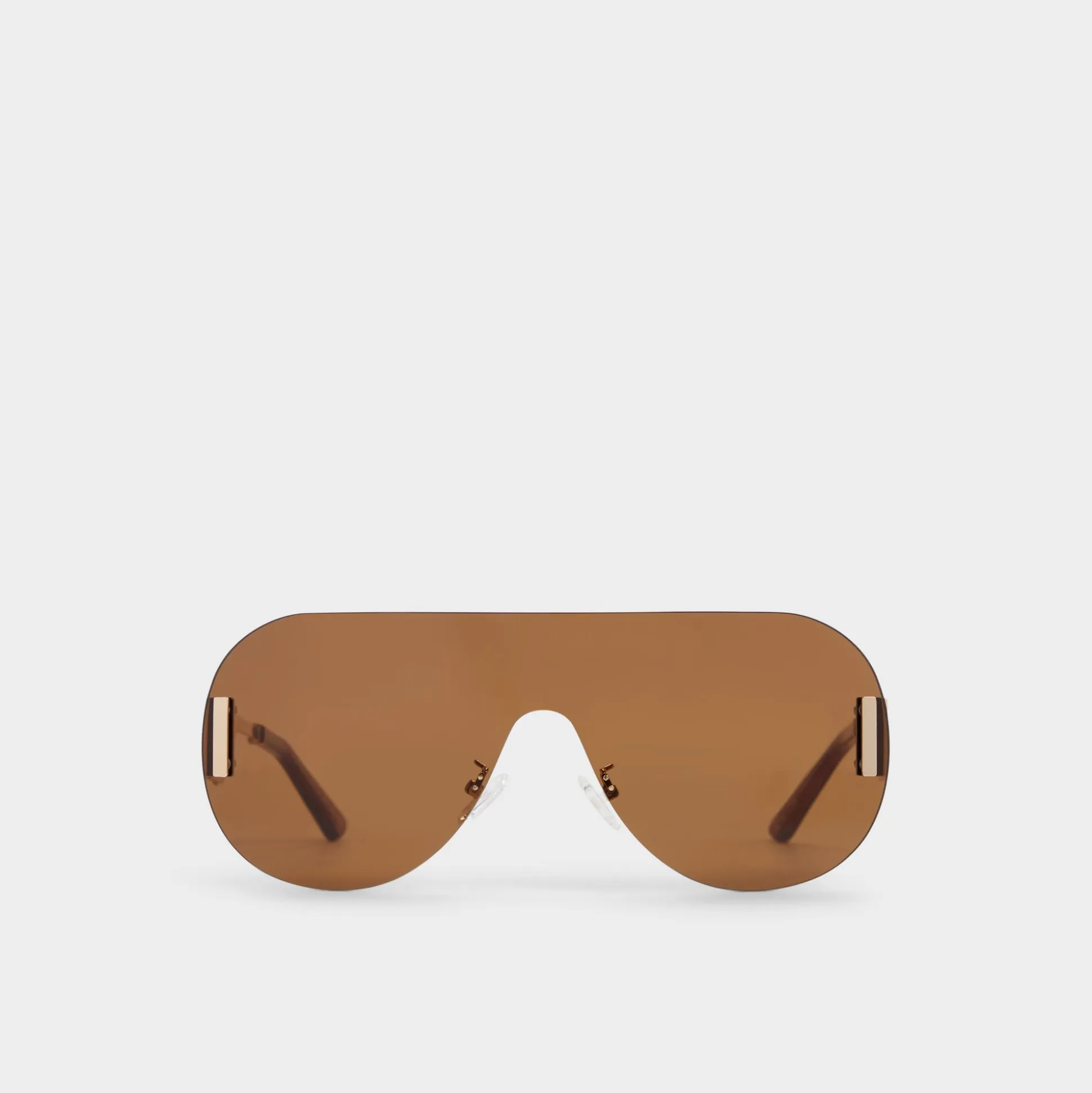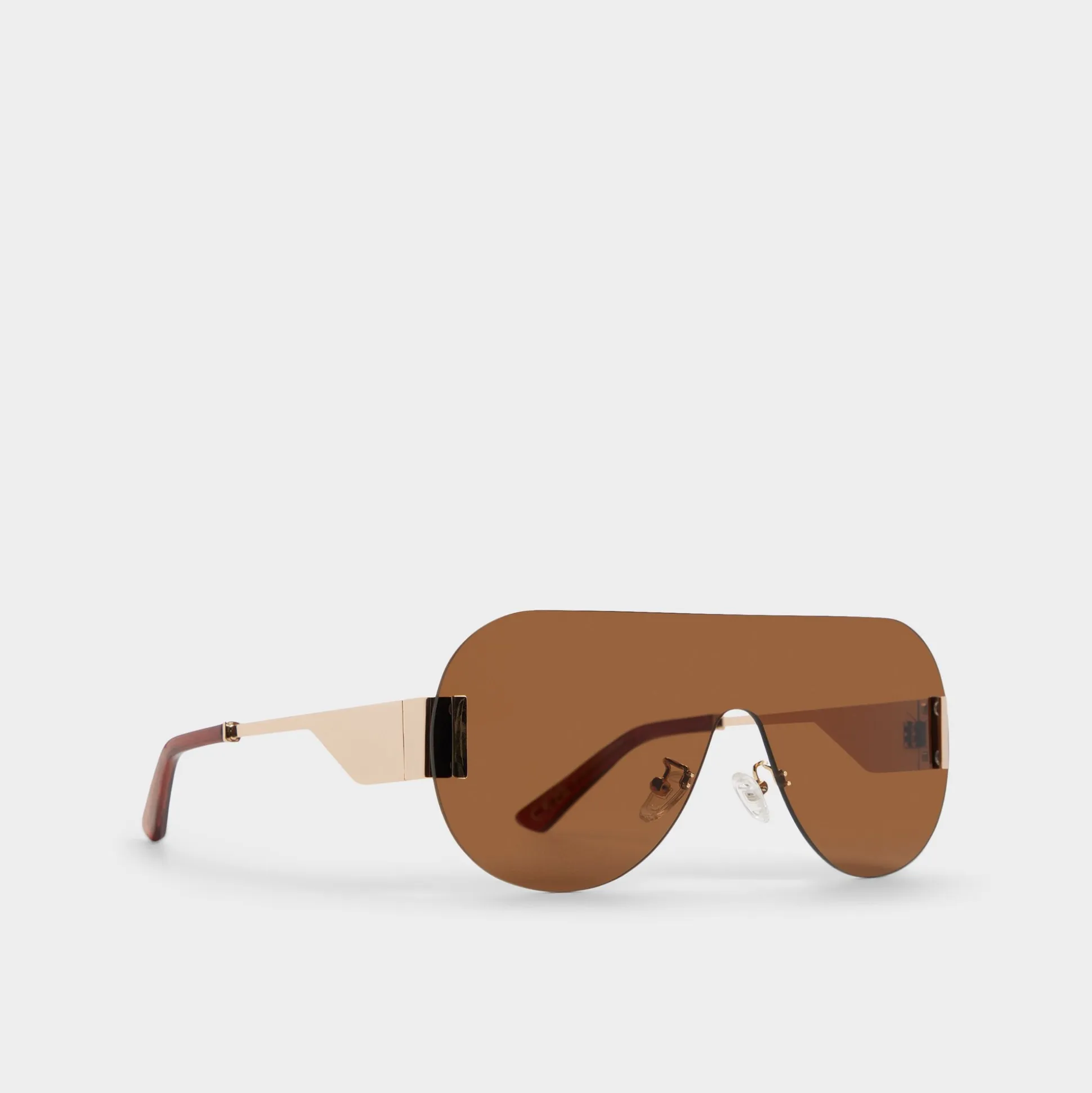 A single shield lens shines in warm bronze, edged with slim silver hardware and comfy nose pads that keep the futuristic visor style light from morning errands to evening hangs. Frame a sleek jumpsuit at rooftop drinks or sharpen bike shorts and an oversized blazer on city detours, sealing off-duty edge.