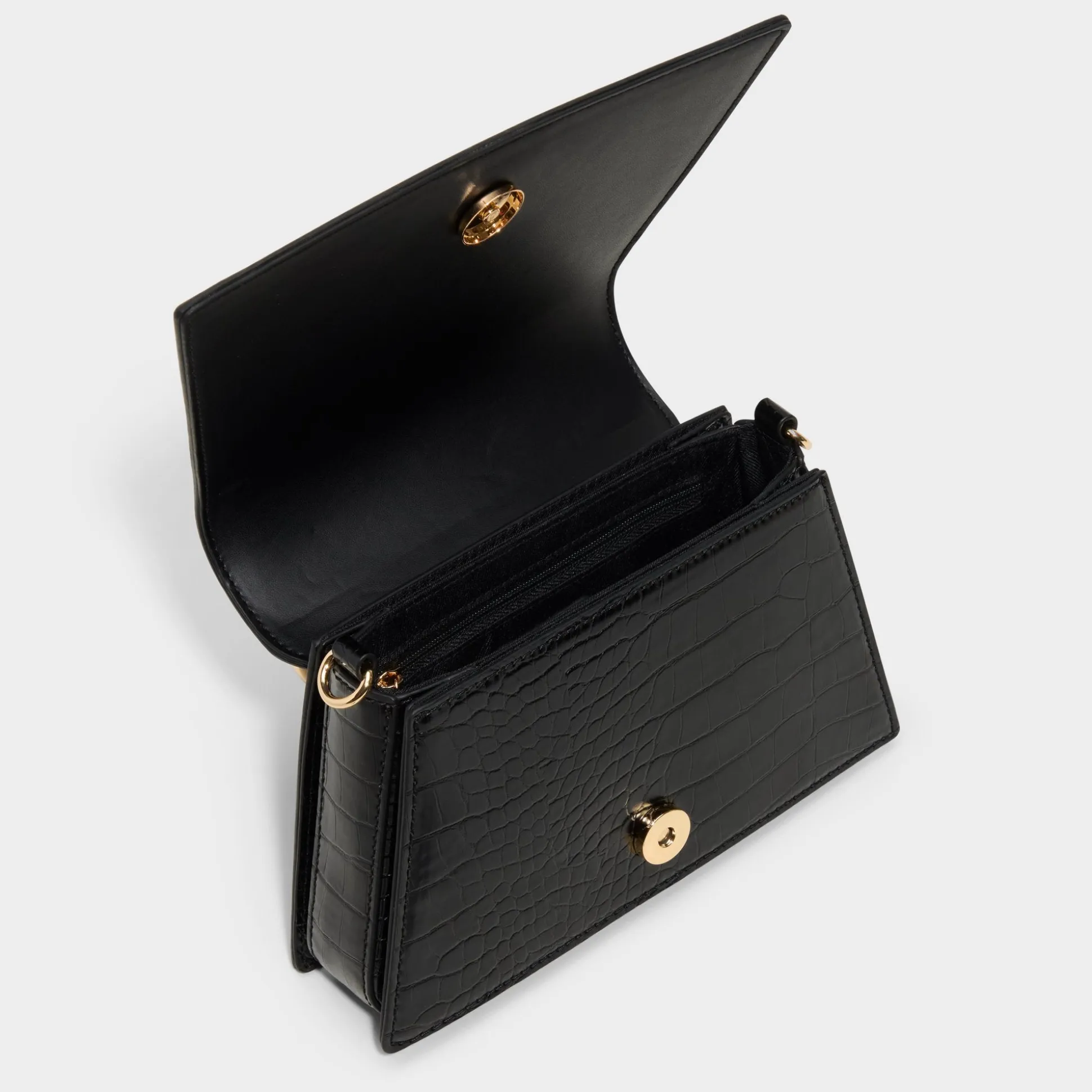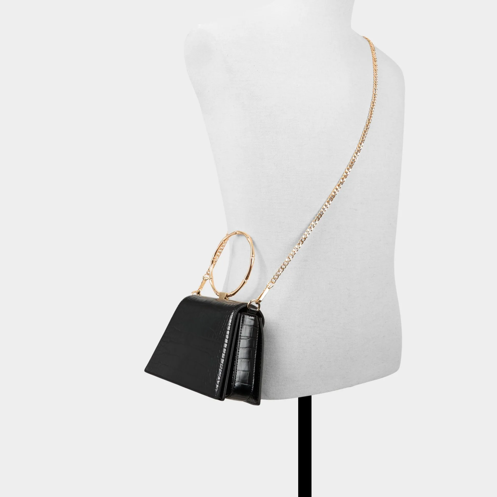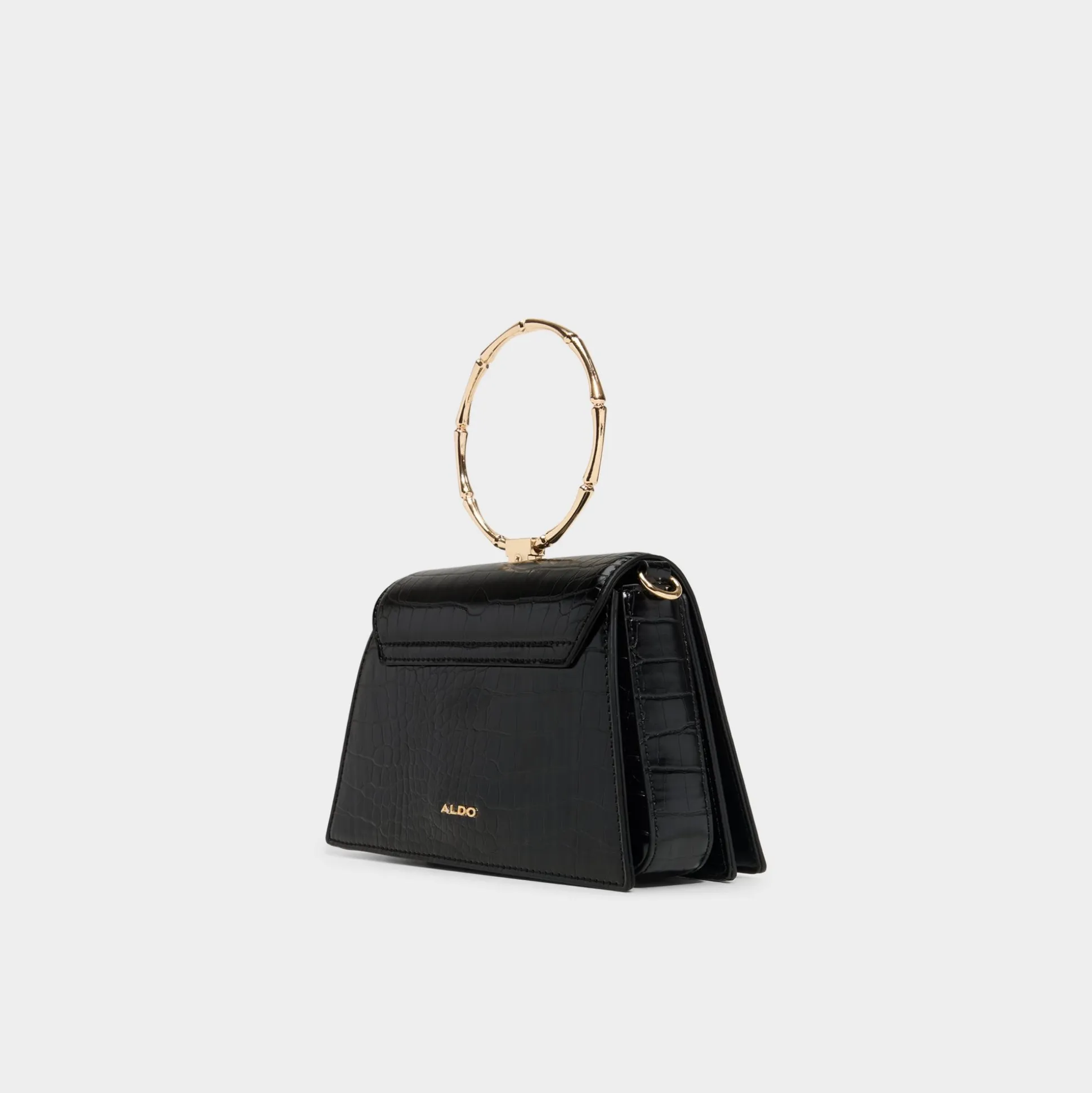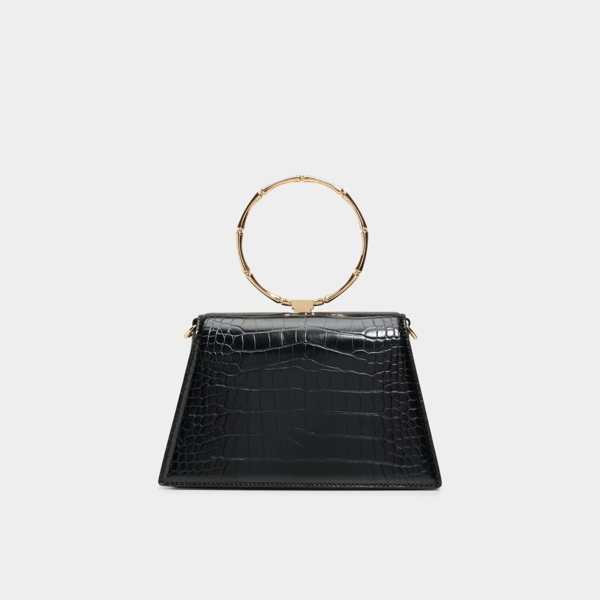 Croc-embossed trapeze silhouette with ornate ring handles makes this bag feel like wearable jewelry, while transforming top-handles snap into a secure metal frame for effortless carry from city errands to rooftop dinners. Carry it with an oversized blazer for city nights or sling it with dress and denim for a versatile finish to any look.