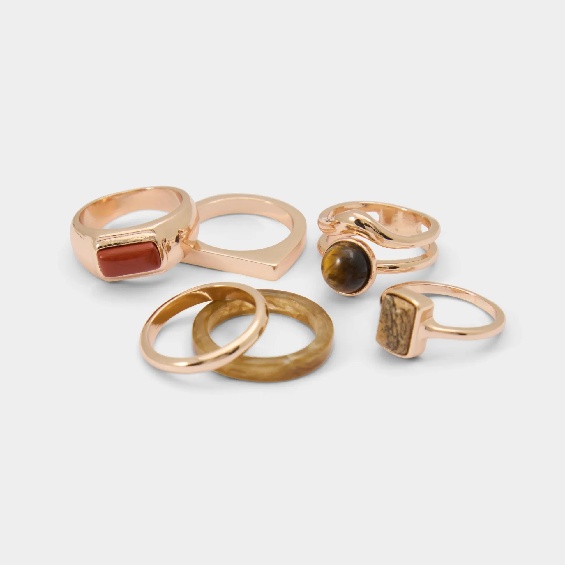 Five gold-tone rings mix sleek bands with tiger-eye and sandstone in geometric cuts, giving you a build-your-own landscape of earthy shimmer you can rearrange day by day. Stack them with a chunky sweater and wide-leg denim for coffee runs, or split them across fingers beside a slinky slip dress for rooftop dates.