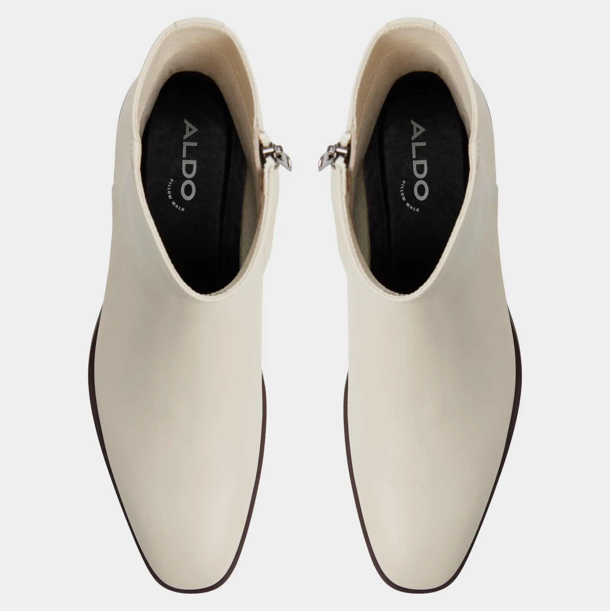Concealed side zip locks a smooth silhouette, while off-white leather wraps this ankle boot in quiet refinement, a low block heel and almond toe keep steps balanced from gallery visits to live gigs. Pair with slim black denim for launch meetings or team with cream suits at rooftop weddings—the neutral tone invites vibrant accessories.