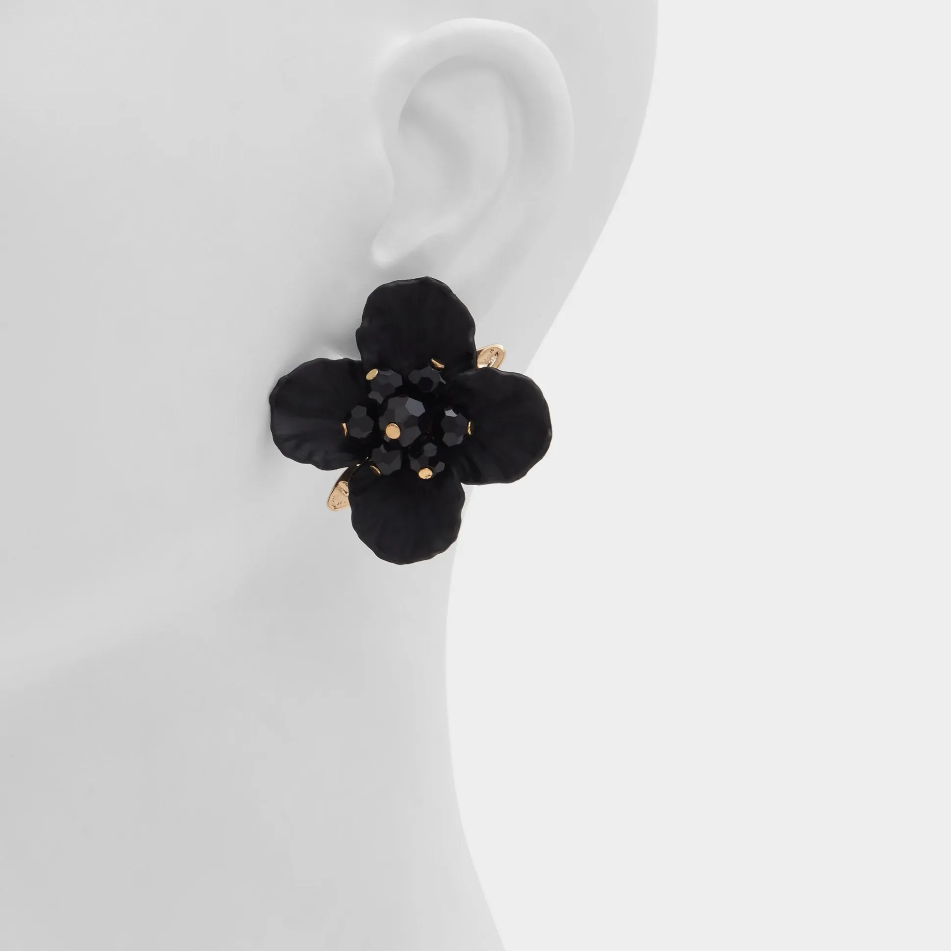 Sculpted petals in midnight acrylic bloom against gold posts, their faceted bead centers catching dance-floor light to turn these studs into corsages. Frame a sleek slip dress at rooftop cocktails or stack them with layered chains and a denim jacket on casual coffee runs.