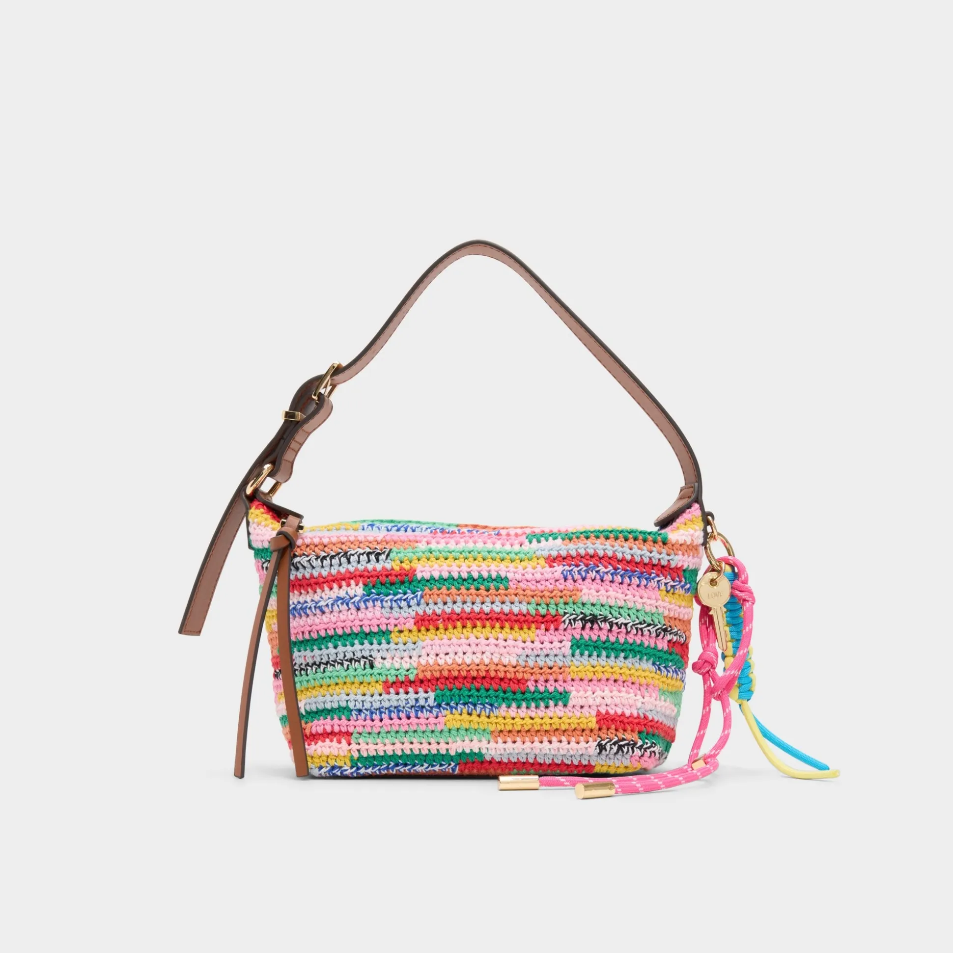 Crocheted rainbow stripes illuminate this mini hobo bag, turning beach-bar spirit into a wearable mood, with gold hardware and a braided tassel charm adding playful polish. Carry it with a breezy sundress to morning markets or sling it over cutoff shorts for sunset concerts, finishing looks with carefree ease.
