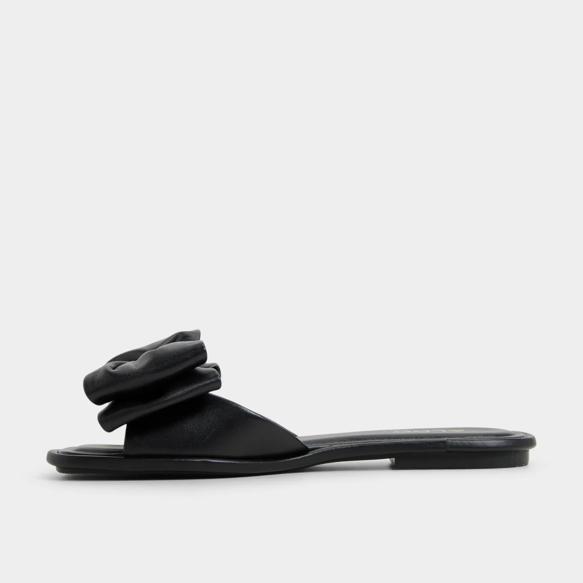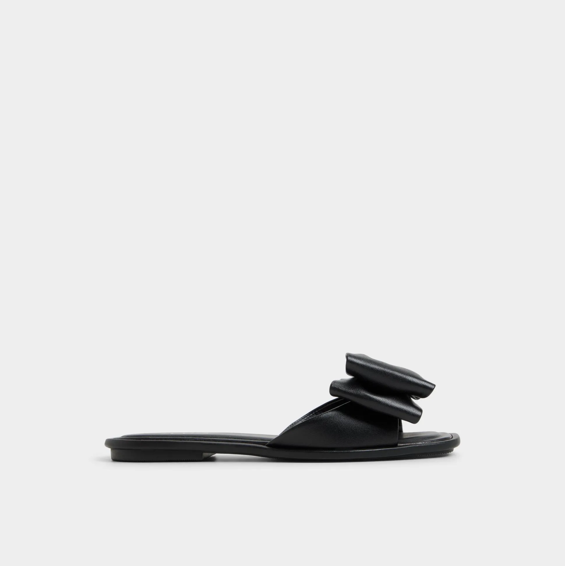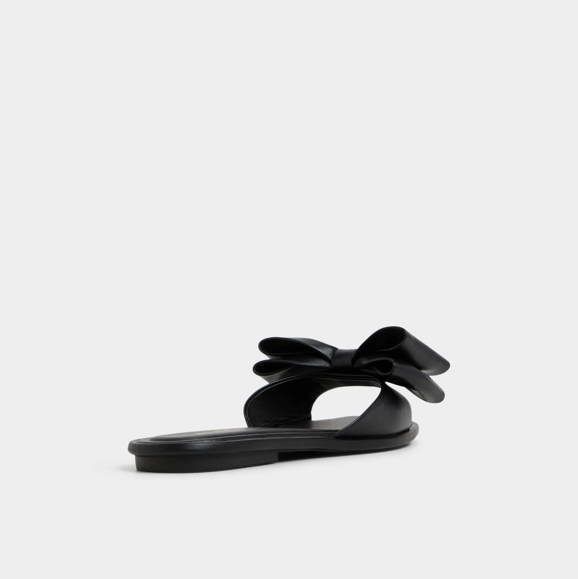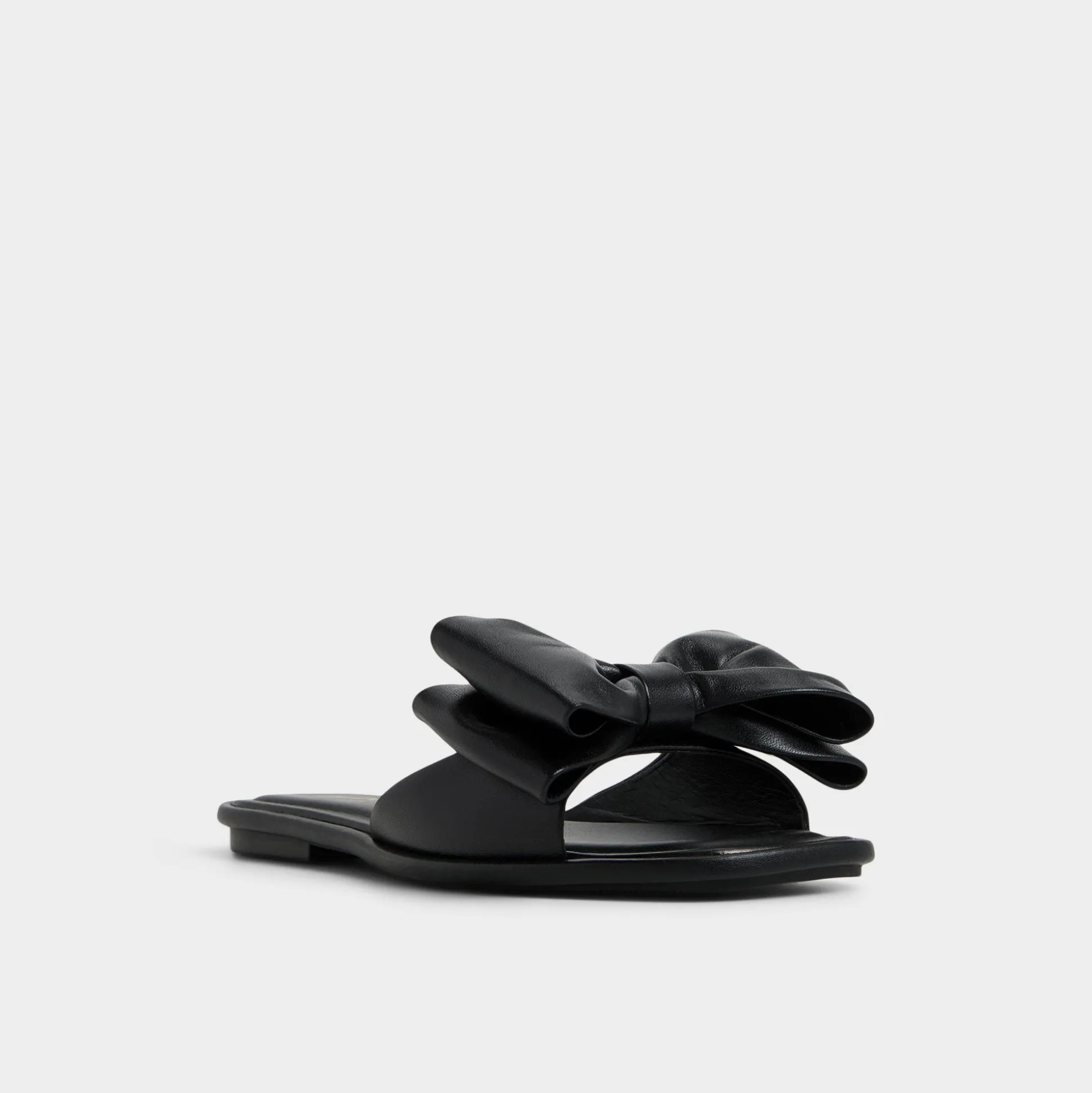 Sculptural leather bow folds like midnight origami across a sleek slide, elevating the look with a touch of after-hours polish, while a cushioned footbed keeps every casual stride comfortable from morning errands to evening streets. Pair with cut-off shorts for market detours, or swap in a satin slip skirt for seaside dinners and moonlit strolls.