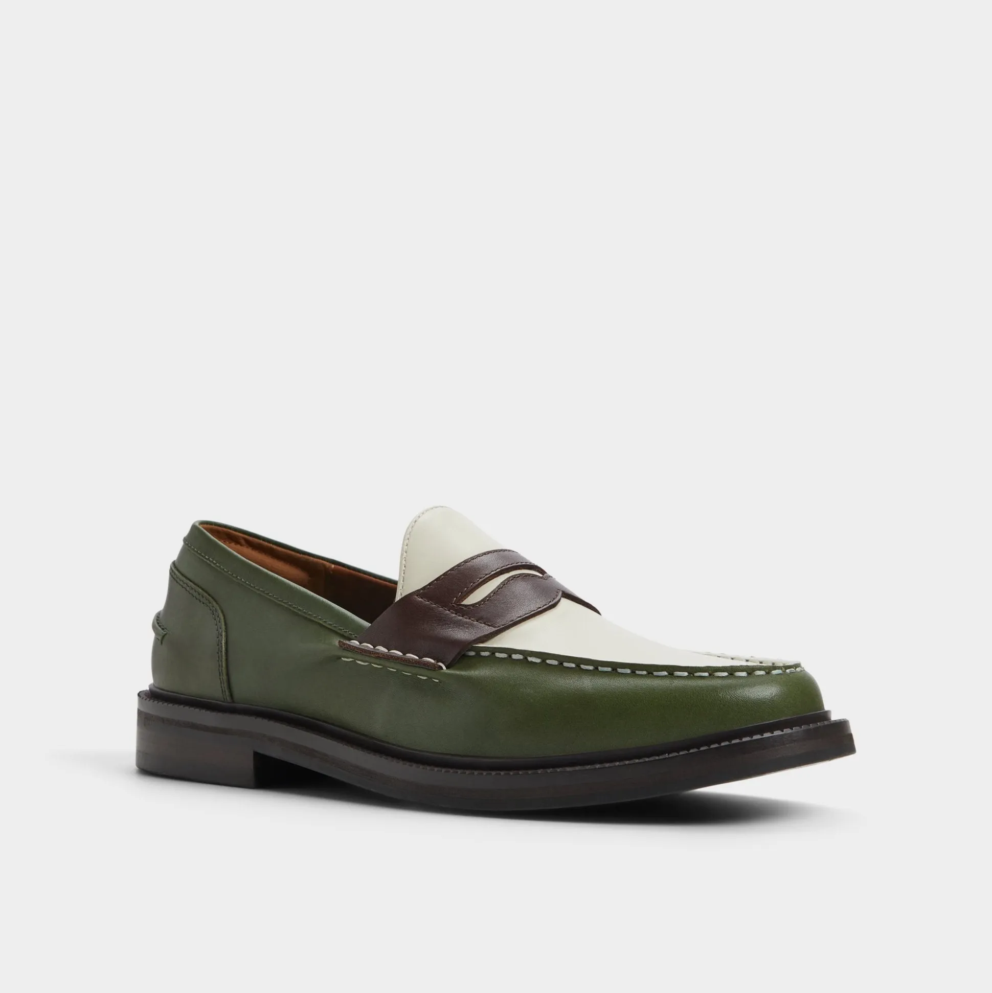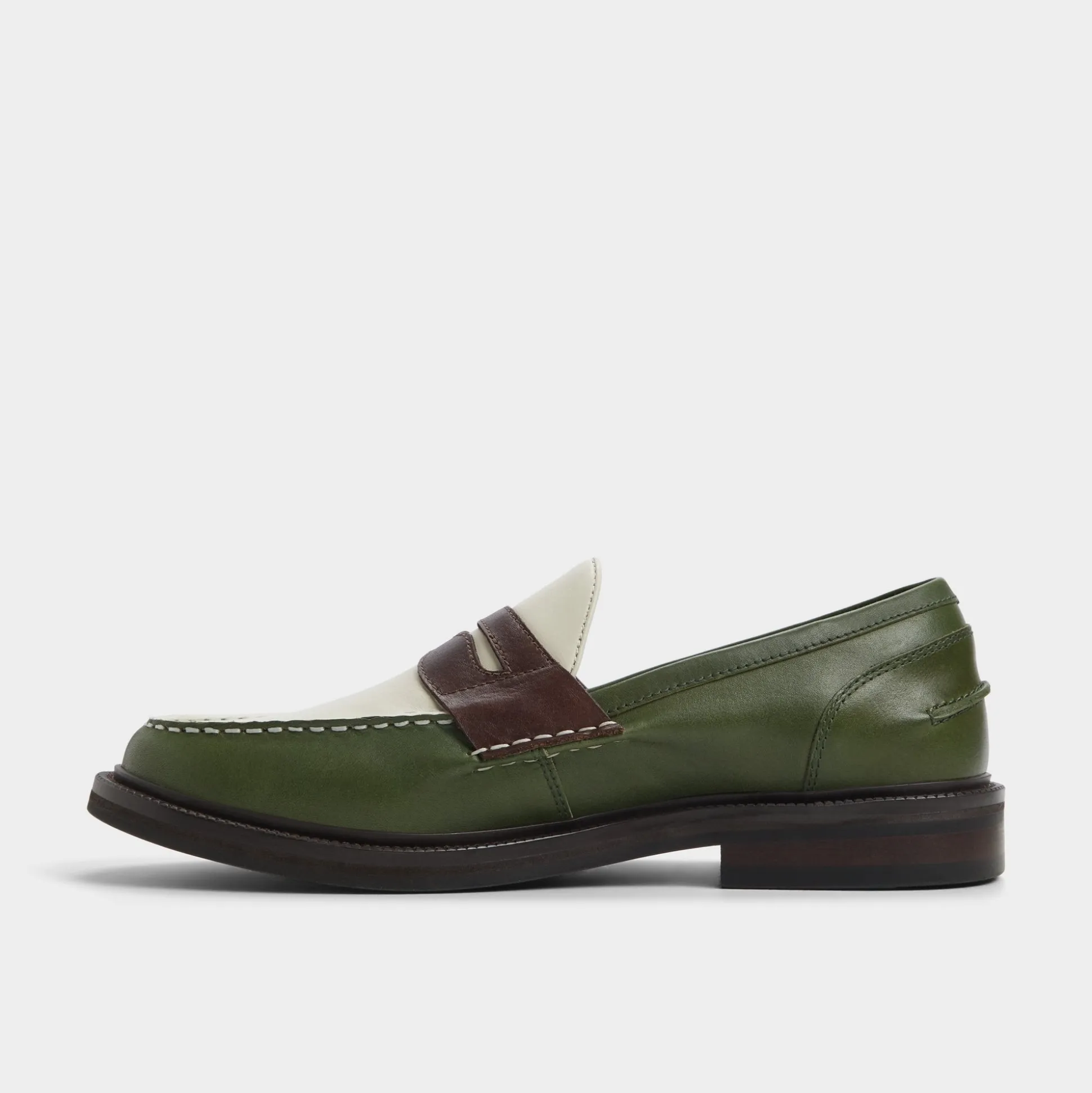 Deep-forest leather meets a cream vamp and chocolate penny strap, with bright piping delivering color-blocking and a stand-out silhouette that travels from boardroom days to after-hours without missing a beat. Team it with navy suiting for client lunches, or roll with cuffed denim at art openings for confident, city-ready polish.