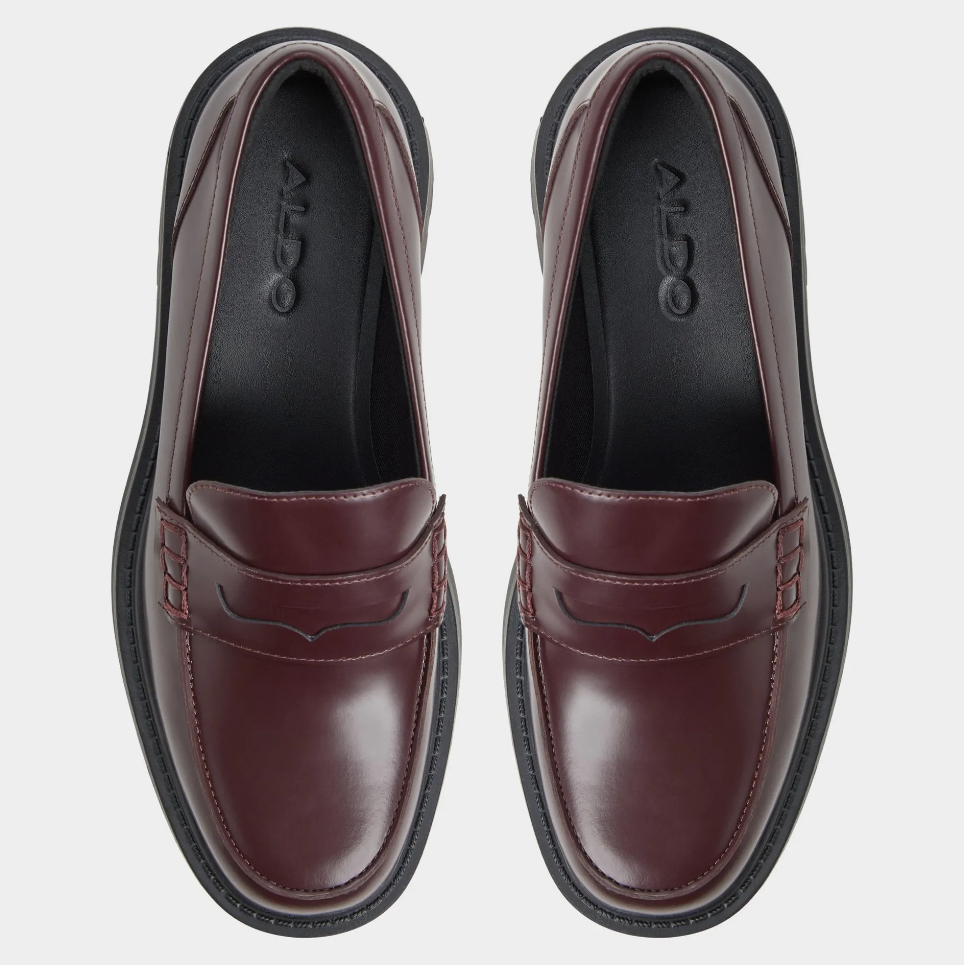 Glossy burgundy leather shapes this refined penny loafer, with a chunky lug platform sole adding stealth height and street-smart grip, transforming it into a power move for long lectures and commutes. Pair with pleated minis for campus coffee runs or ground an oversized blazer set when pitch meetings demand cool confidence.