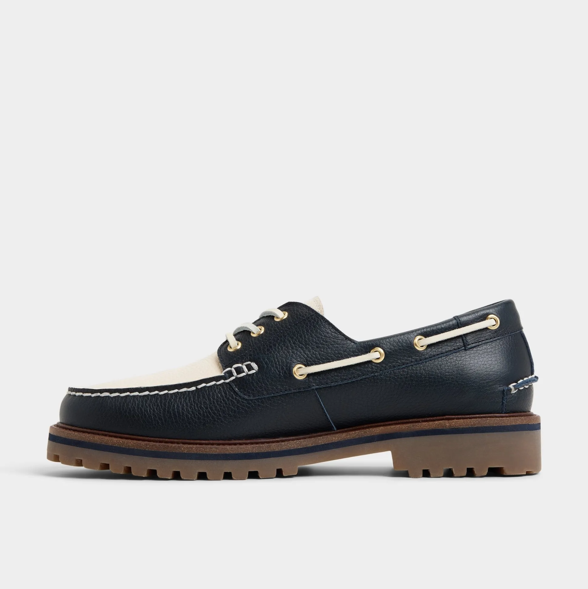 Pebbled navy leather sets the boat shoe apart, with deep-cut lug soles and metal eyelets that fuse rugged function with city-ready polish, while a supple, full-grain upper keeps comfort steady from dockside to downtown. Team it with cuffed chinos for seaside brunches or anchor faded jeans for road trips, the tread grips wet decks and city pavements.