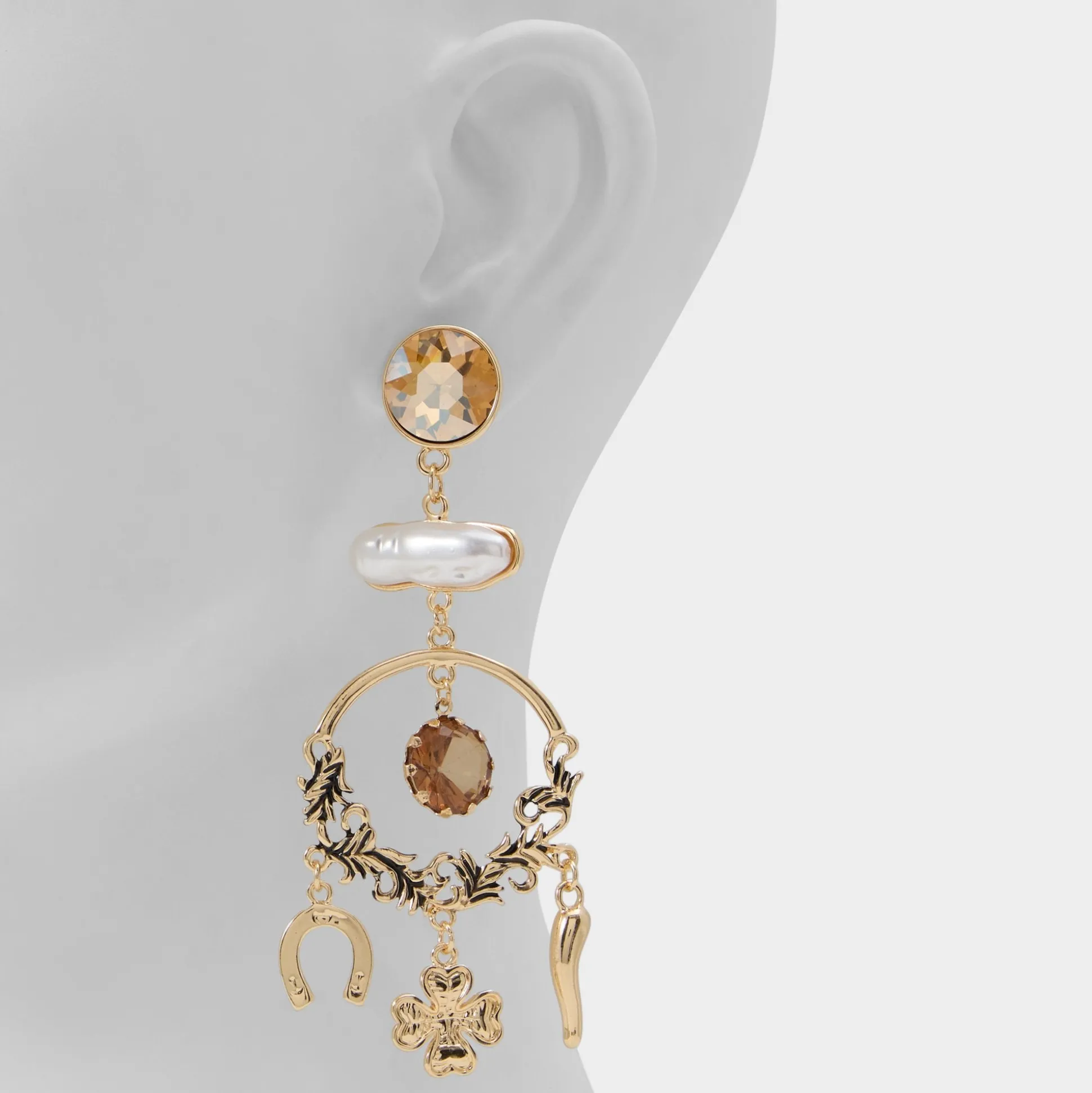 Golden chandelier hoops featuring horseshoe, clover, and chili charms create good vibes beneath baroque pearls and smoky crystals, catching the light as you move. Frame them with a satin slip for rooftop birthdays, or top a cozy knit on campus coffee runs to keep the glow going.