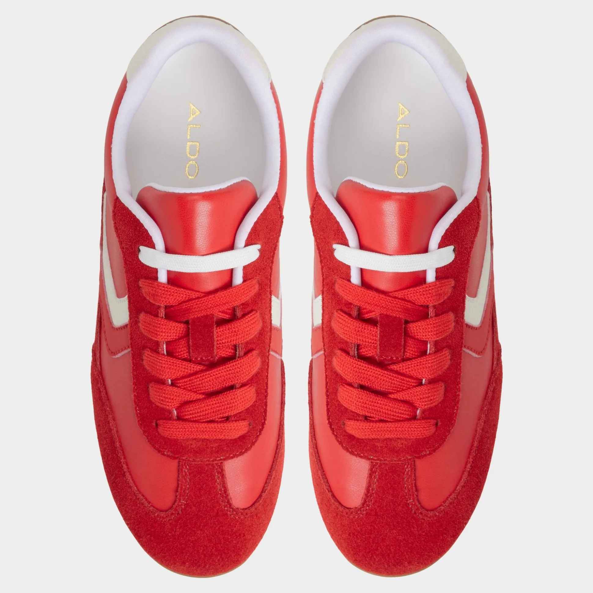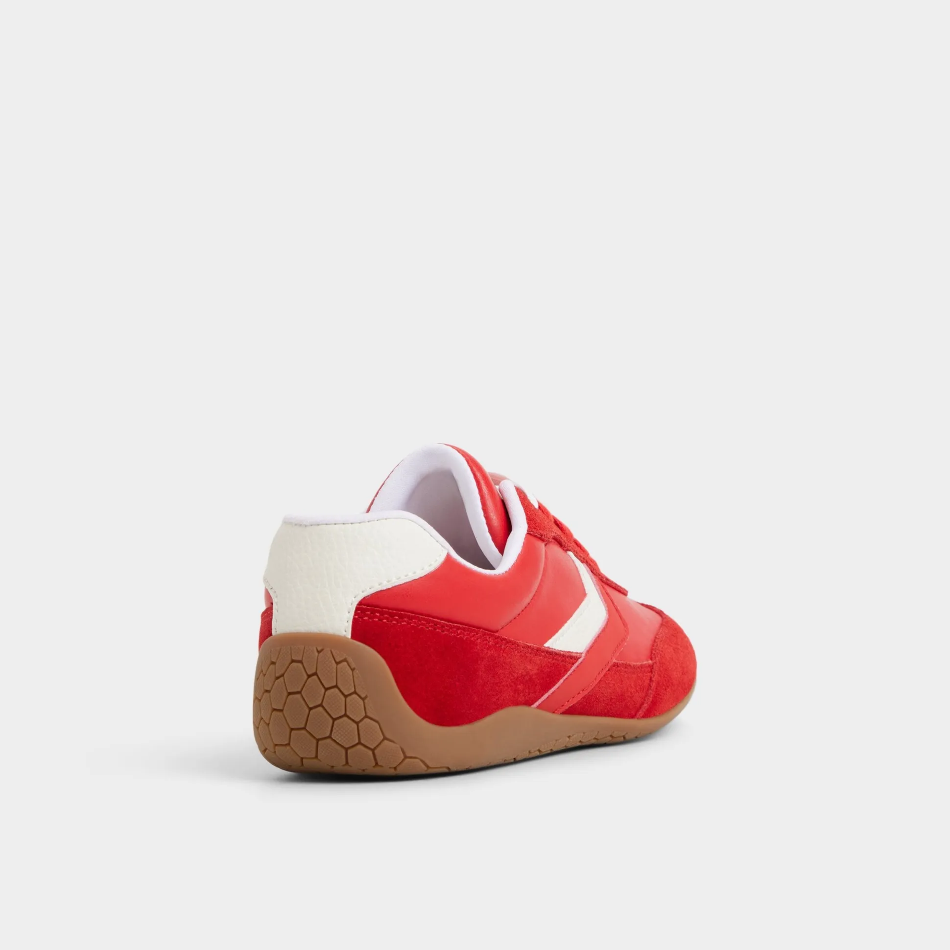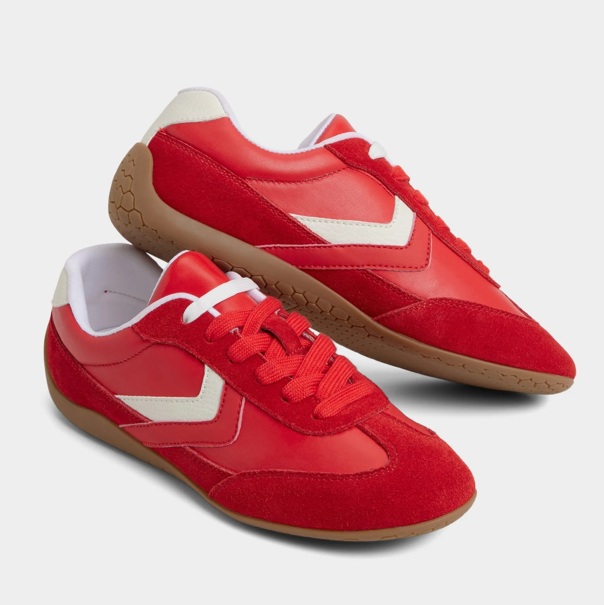 Punchy scarlet suede collides with sporty fabric panels as a crisp chevron stripe flashes across the side on top of a cushioned cupsole that softens every errand sprint and playlist-powered detour. Pair with bike shorts for coffee commutes or swap in wide-leg trousers when after-work hangs call for laid-back polish.