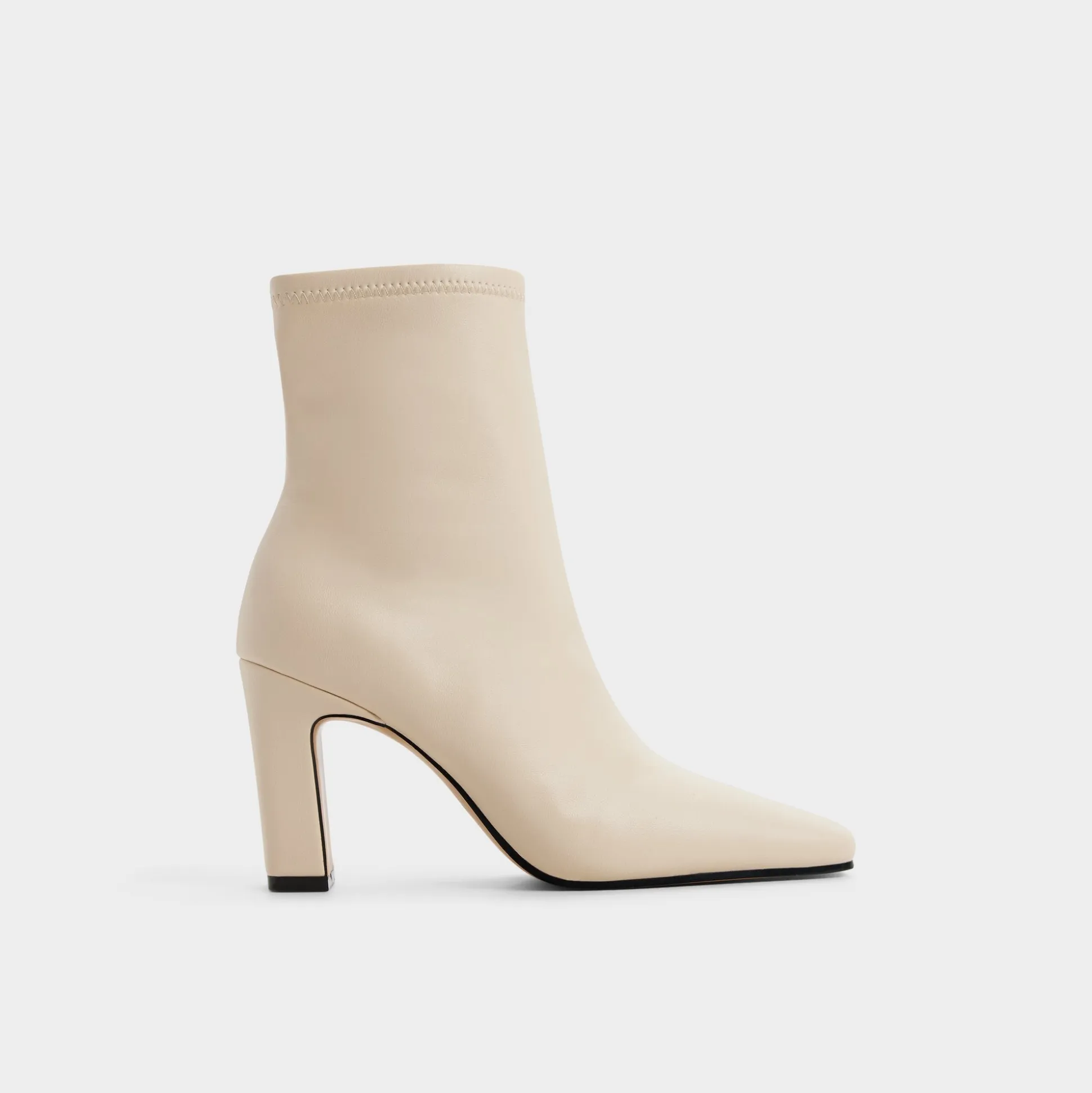 A sleek leather sock-fit ankle boot in moonlit cream features a sculpted block heel with a subtle curve, balancing height and stability, while the slip-on shaft offers instant polish. Pair with cropped wide-leg trousers for office brainstorms, or slip under a slinky mini when gallery openings hit after-dark.