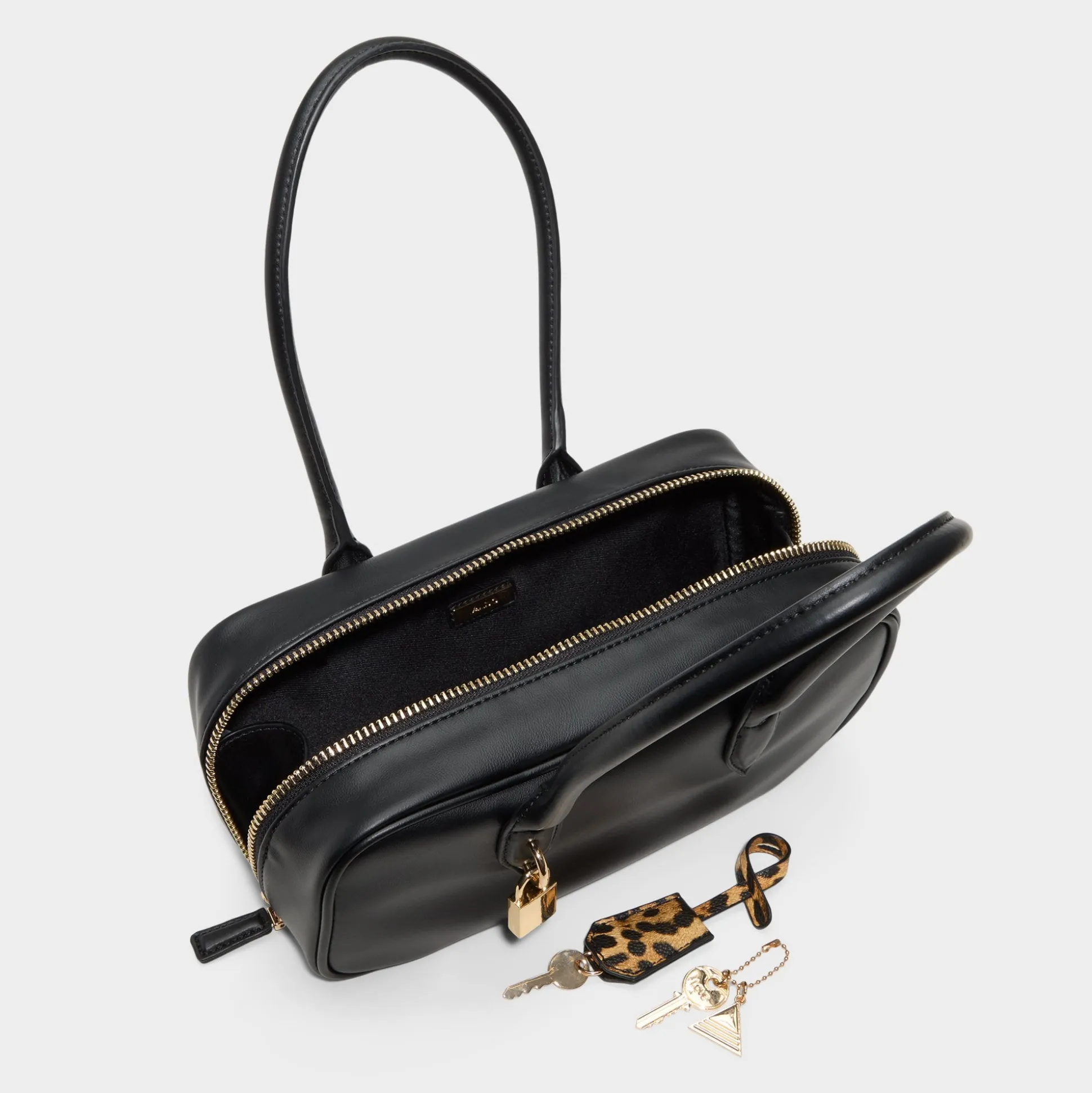 Smooth black leather shapes a slim rectangular satchel, its gleaming padlocks and wild leopard key charms stealing the scene while a zip-secure interior keeps essentials neatly in place for city days that shift from desk to after-hours. Carry it through morning meetings with a blazer, or sling it to after-hours with a sleek dress for a quietly edgy finish.