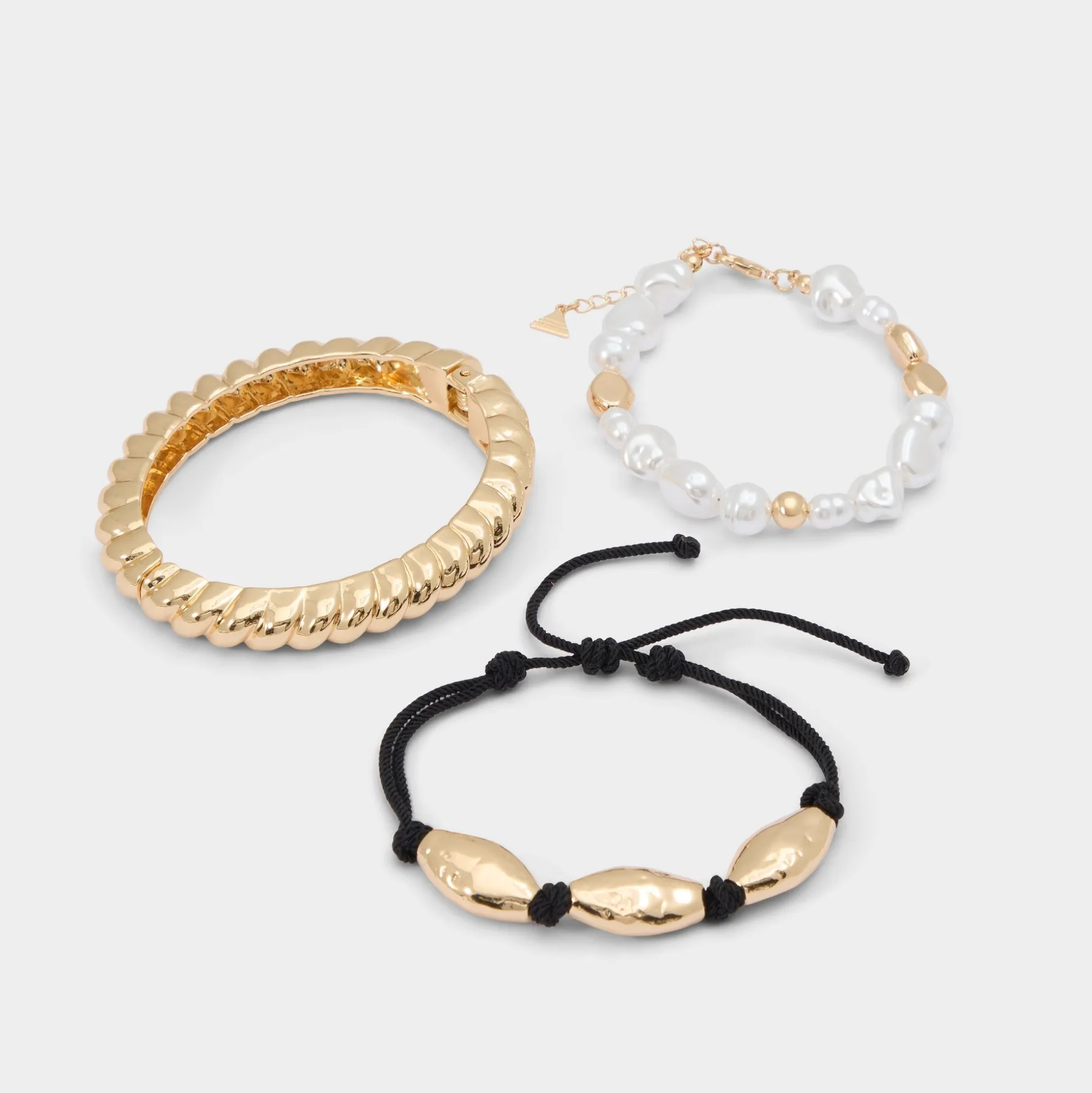 Three distinct bracelets-a ribbed gold bangle, pearly bead strand and adjustable cord with polished nuggets-arrive pre-layered, giving wrists instant texture play and day-to-night shine. Layer the trio beside a blazer cuff for presentation mornings, or let the pearls shimmer with a satin cami at rooftop drinks.