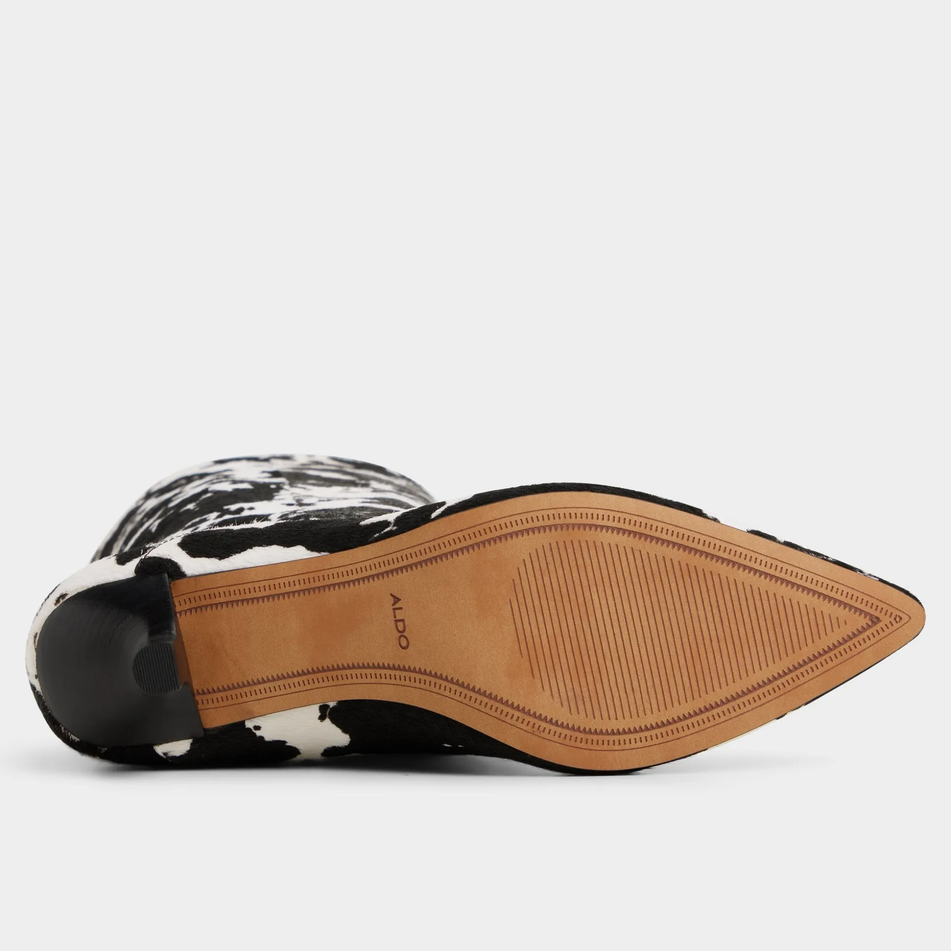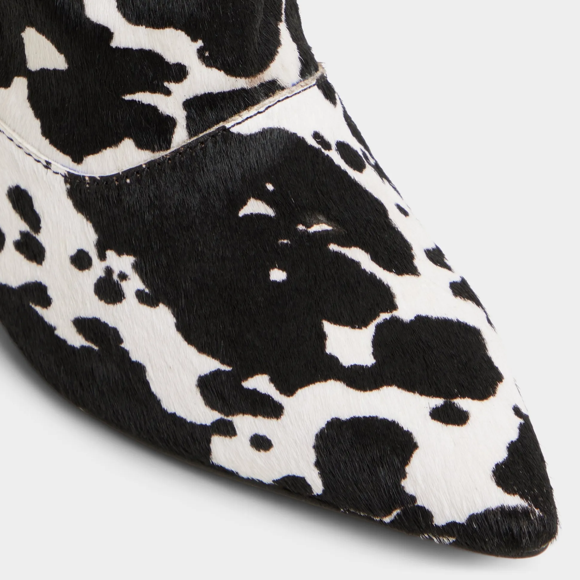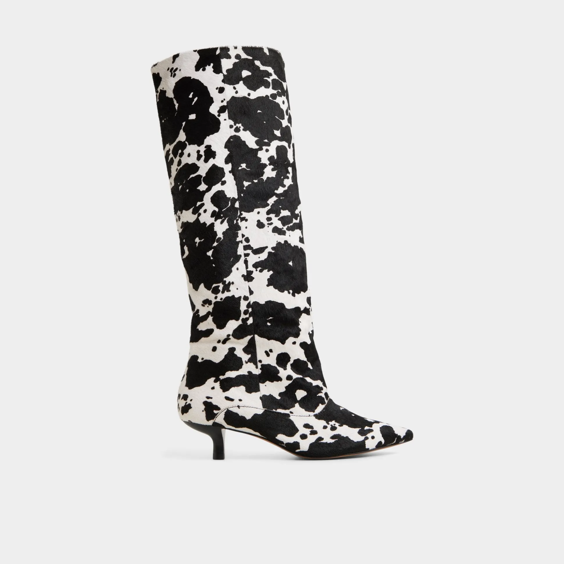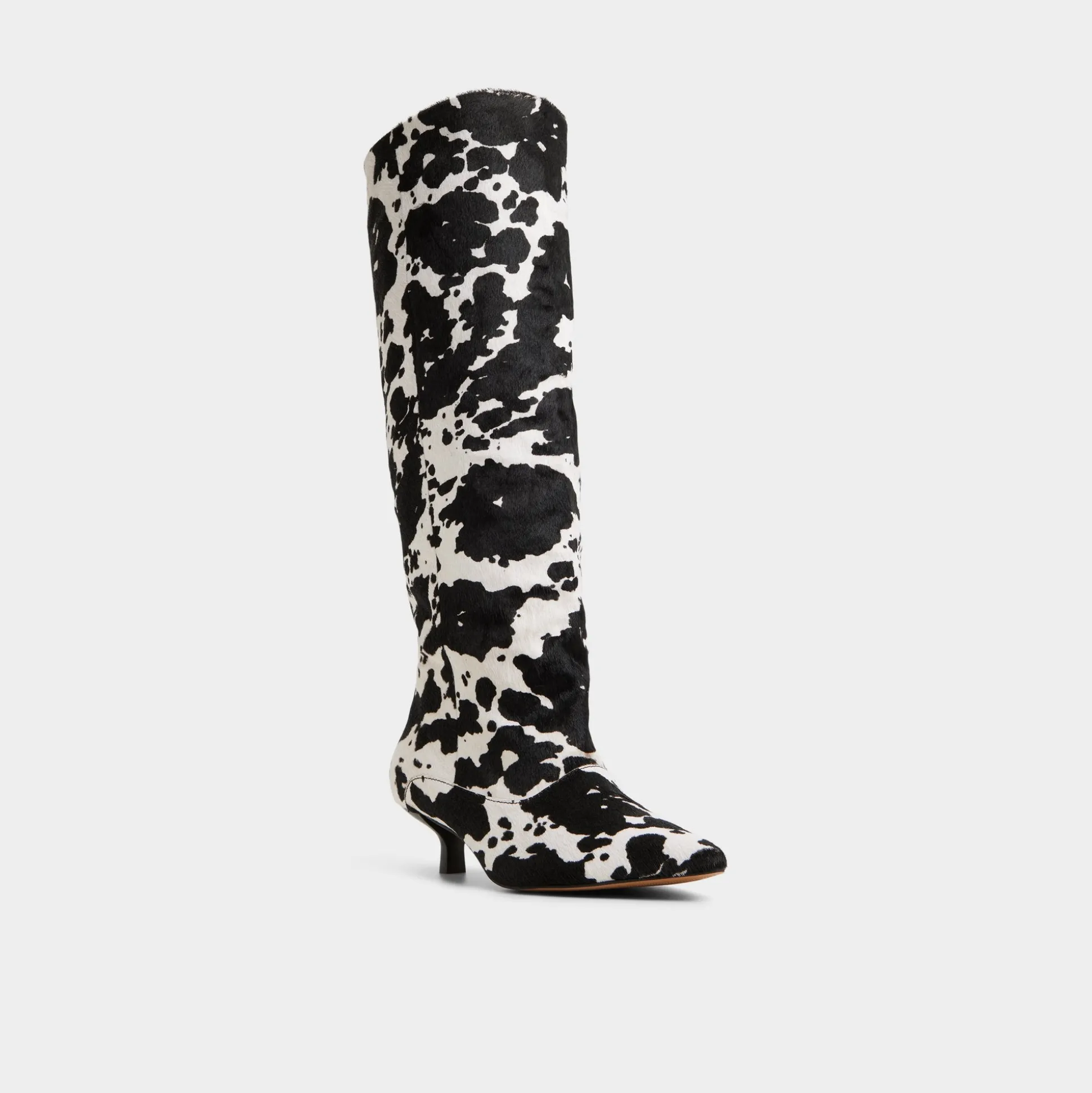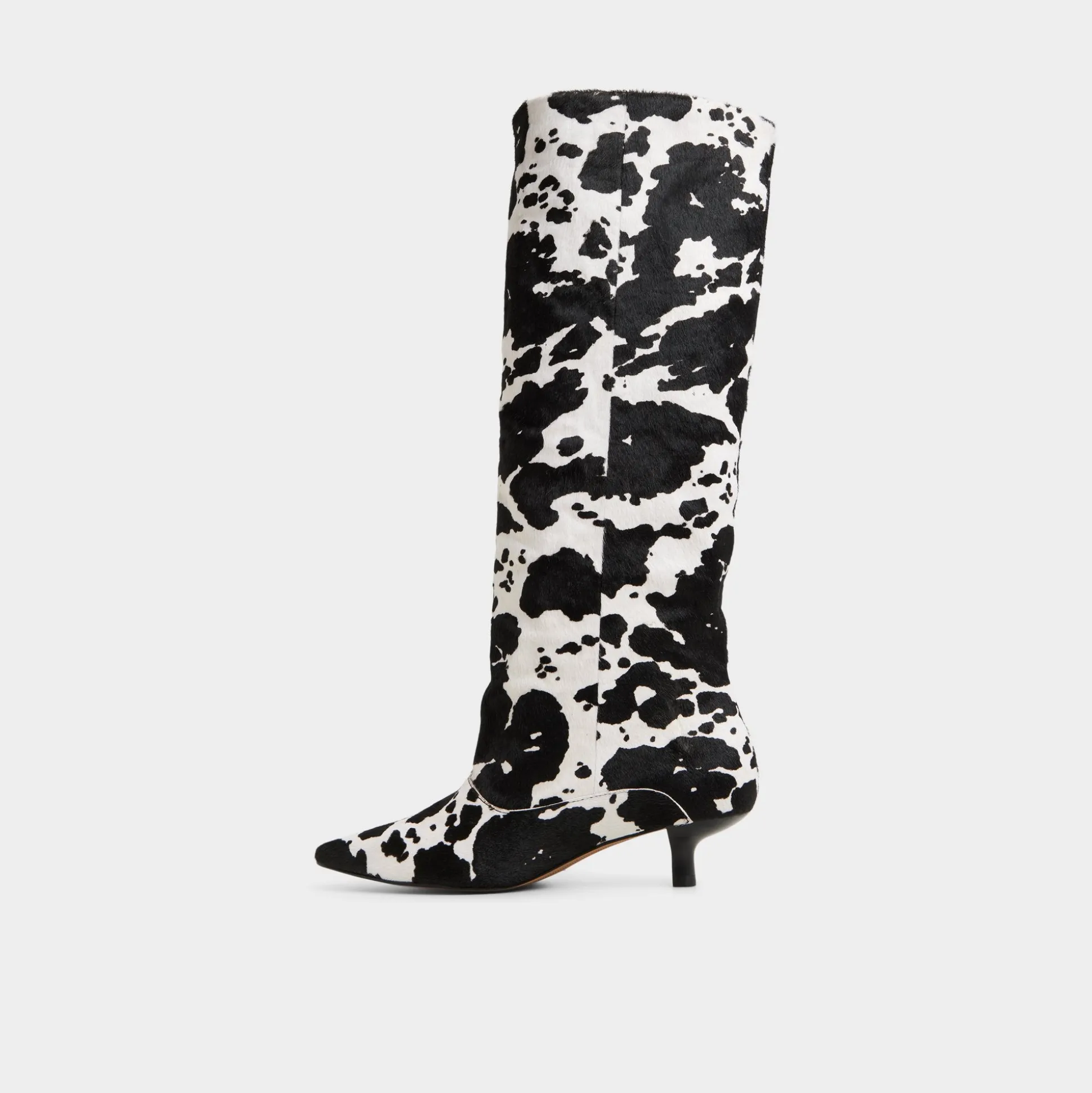 Cow-print faux fur wraps the knee-high shaft while kitten heel and pointy toe keep it bold yet easy. Pair with micro skirt for rooftop album drops or swap into dark-slim denim when gallery hops stretch past midnight.