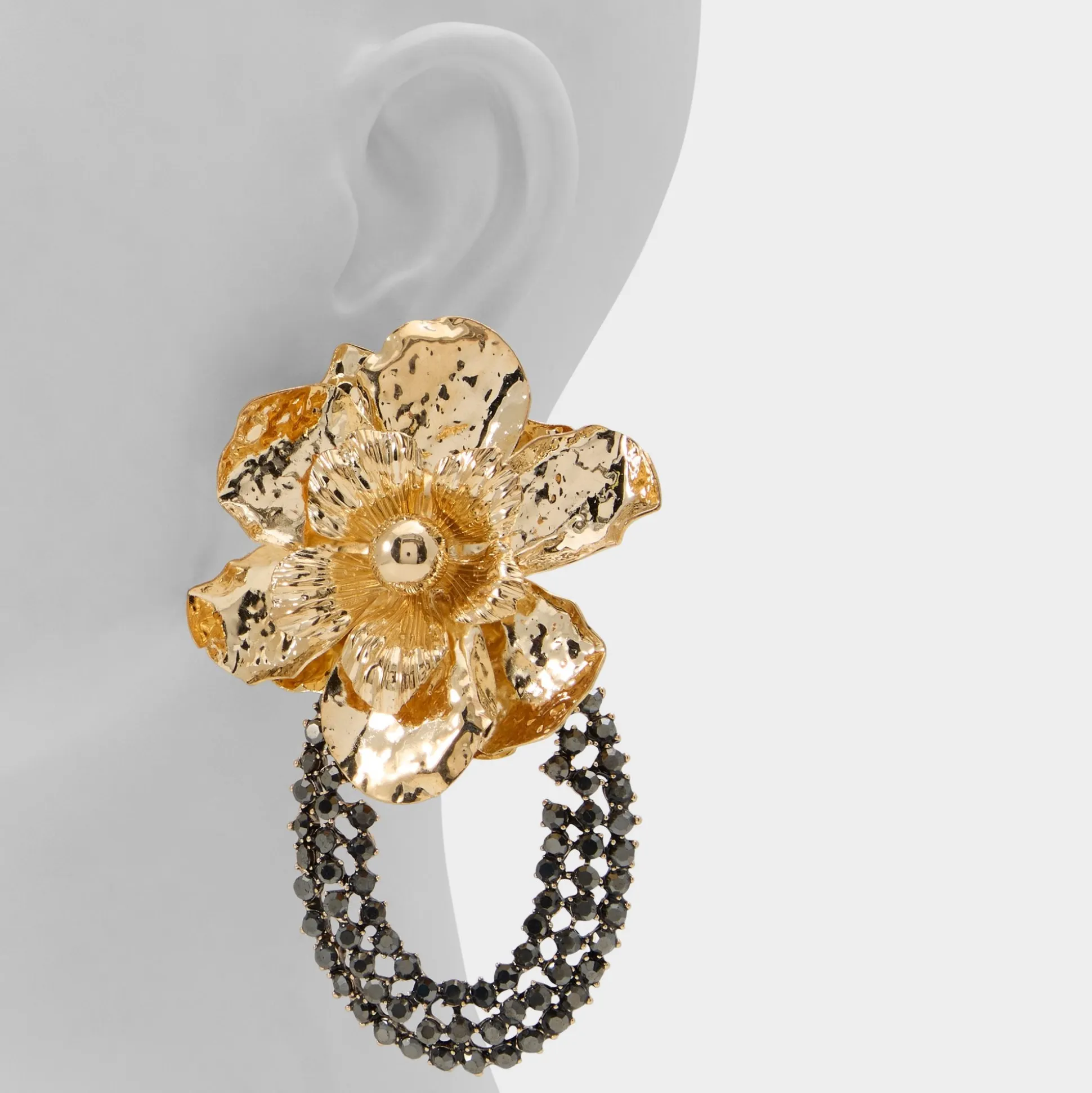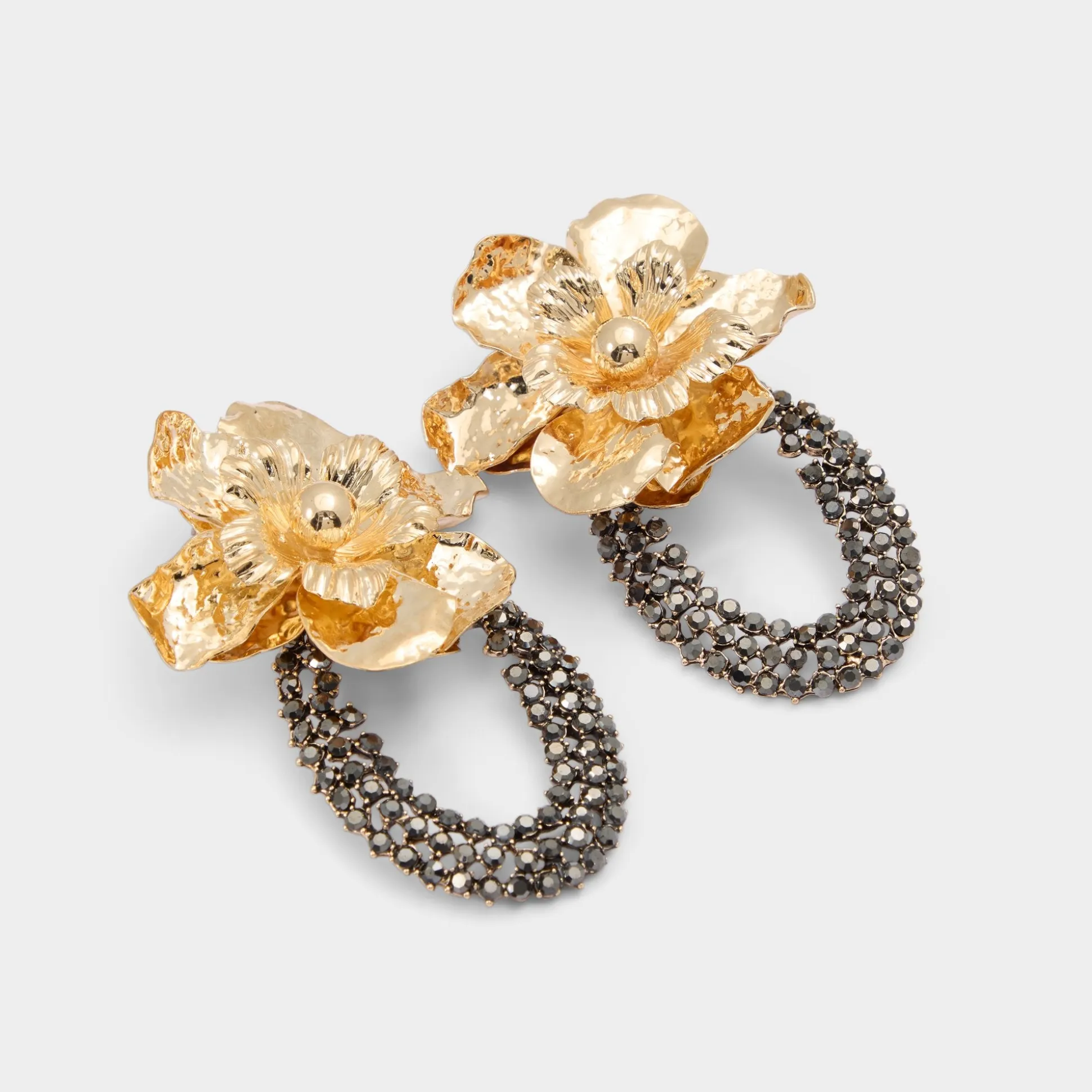 Hammered gold blooms catch flickers of light, anchoring oval loops of midnight glass beads into a sculptural pair that feels like garden romance in motion. Frame silk slips for a wedding moment or elevate a vintage tee with leather pants for late night gigs, letting the blooms frame the face with easy, confident glow.