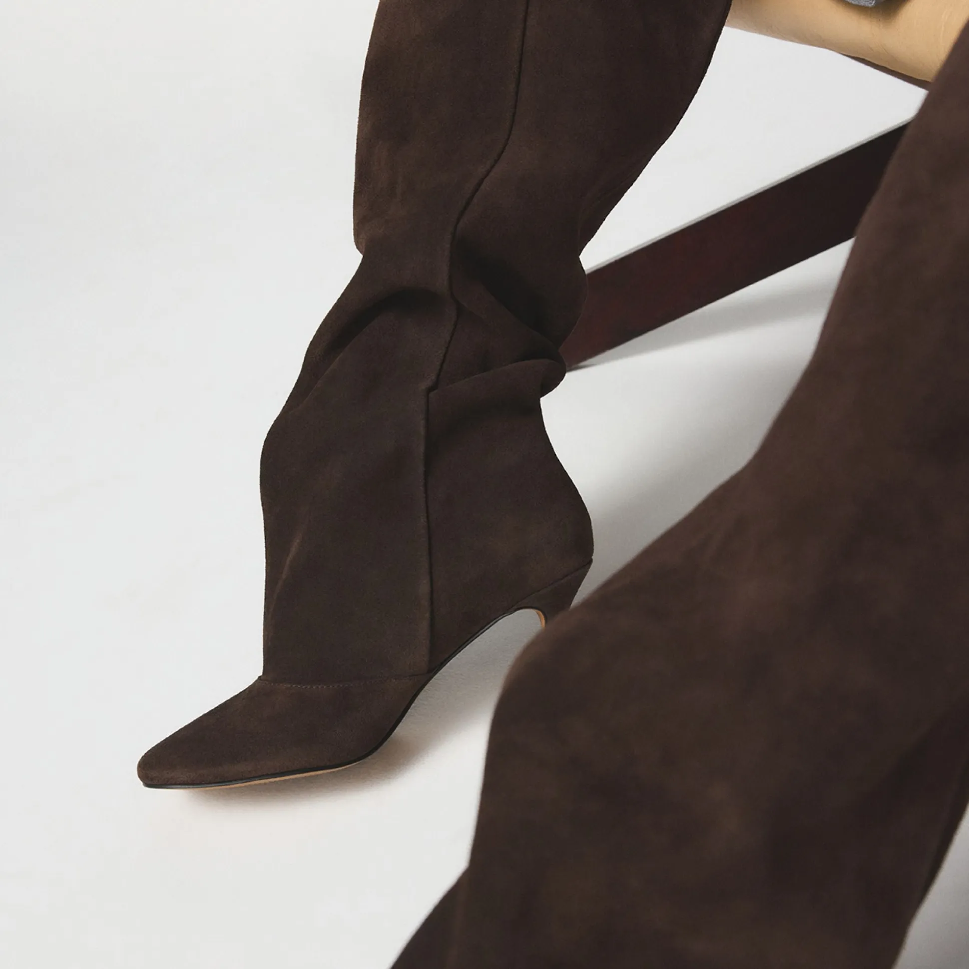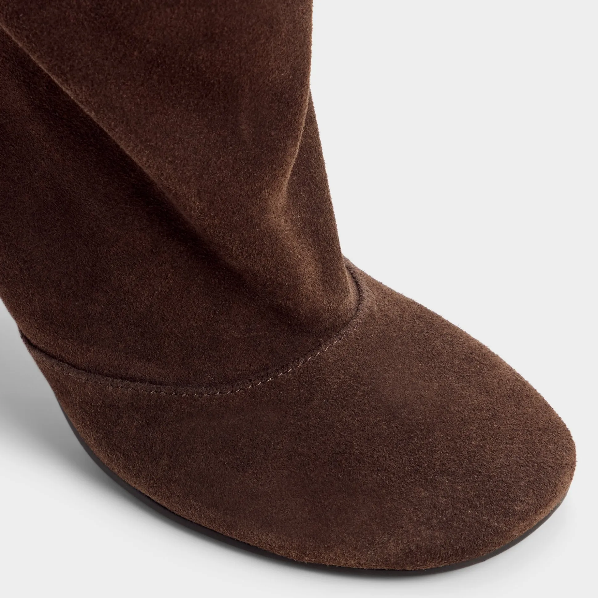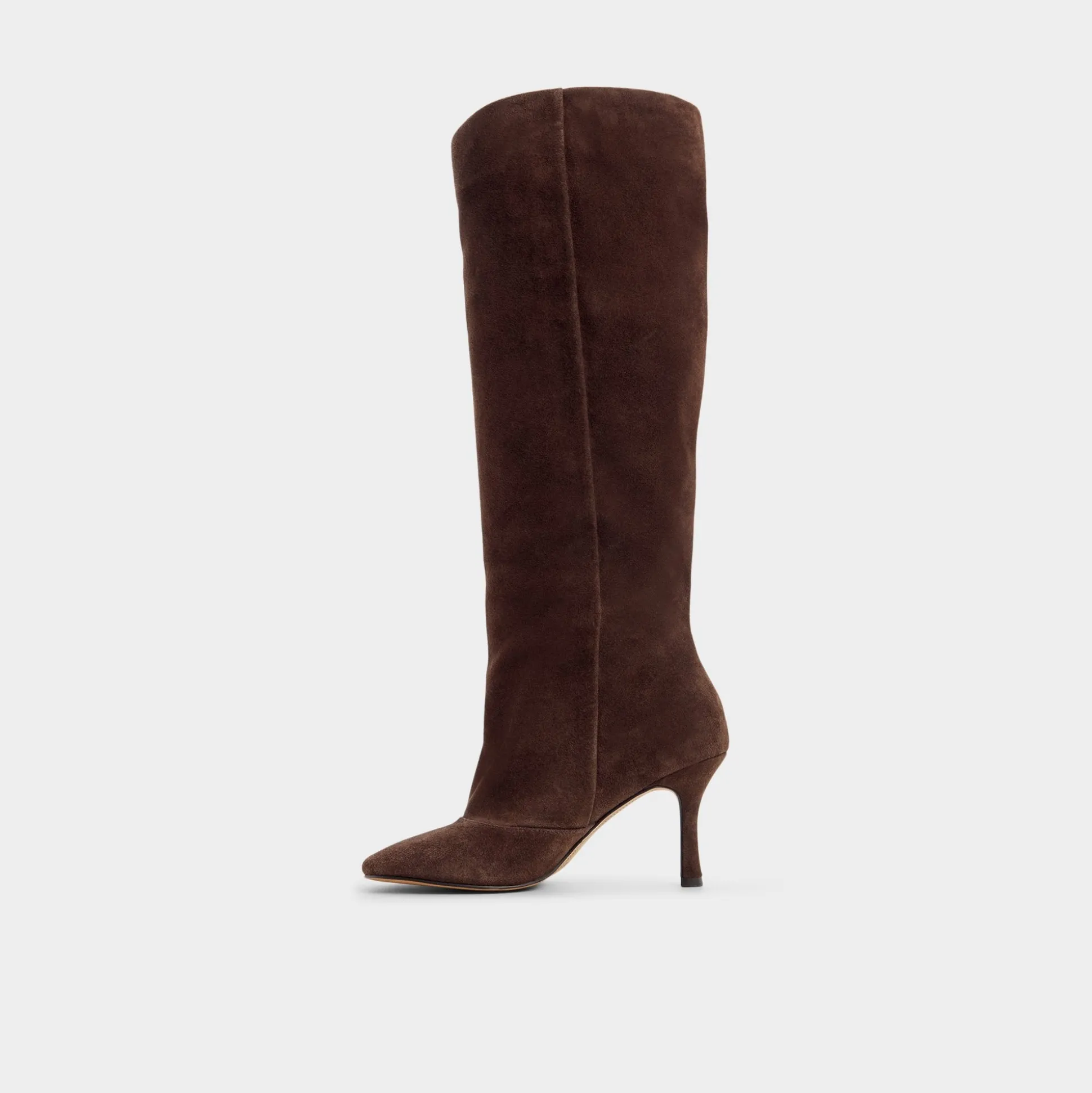 Chocolate suede rises knee-high in a sleek line, finished with a poised stiletto heel that lengthens the leg and hugs you with smooth, confident lining. Pair with cropped denim for city errands, or glam up with a satin midi as evenings bloom into rooftop conversations.
