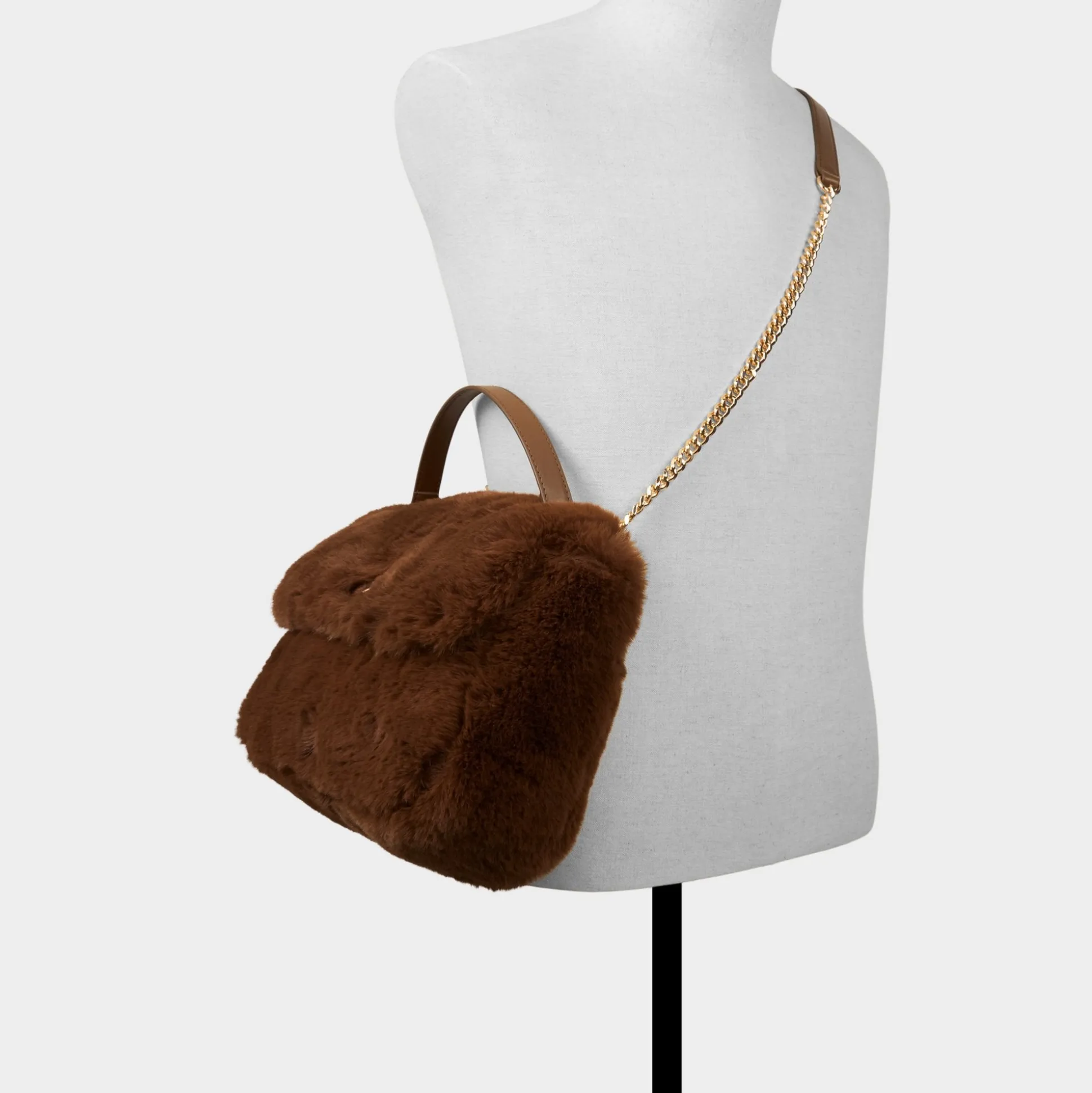 Plush mocha faux fur wraps this shoulder bag in instant warm-and-fuzzy glam, complemented by gleaming gold hardware and a leather-topped chain strap that keeps its flap silhouette polished yet easygoing on chilly nights. Sling over ribbed dresses for fireside cocktails or tuck against velvet blazers at holiday parties for touchably soft polish.