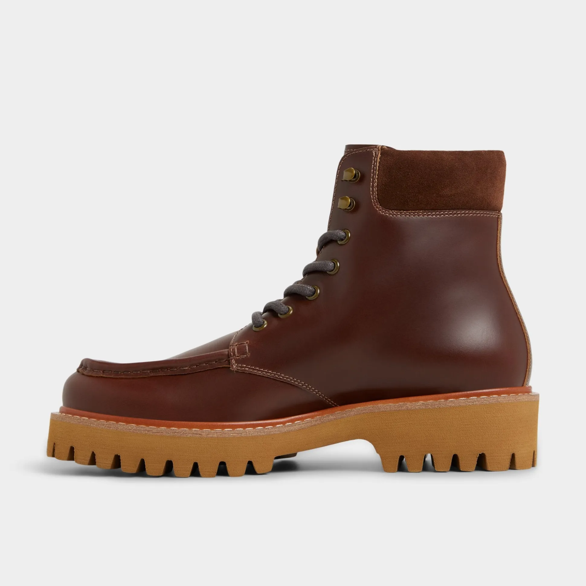 Chestnut leather meets a suede collar on this moc-toe boot, while the oversized gum lug sole grips city streets yet feels unexpectedly light, letting you roam from morning coffees to late-night plans without slowing down. Anchor cuffed selvedge denim for brunch rides or sharpen corduroy trousers on casual-office Fridays-the rugged edge reads confident, not try-hard.