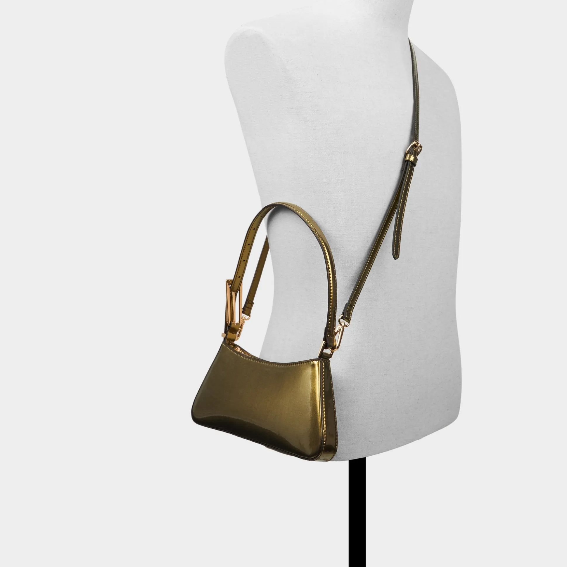 Molten-metal shine elevates this shoulder bag, hugging close under your arm as tonal stitching sculpts a sleek silhouette and a discreet zip keeps essentials secure, turning city moments into a small, radiant statement. Carry it with a silky slip for rooftop parties or sling it over denim after hours, finishing outfits with a confident, wearable glow.