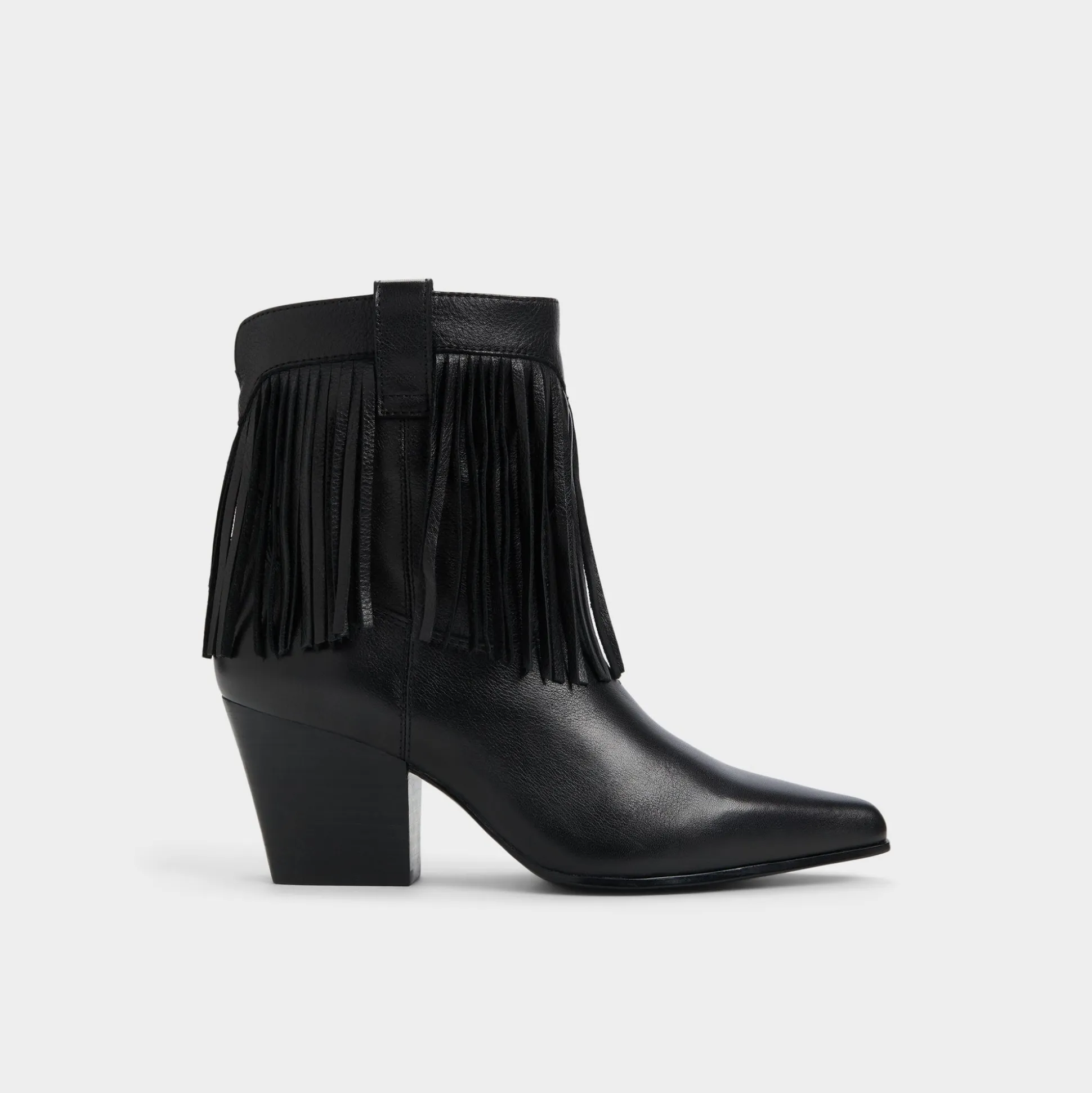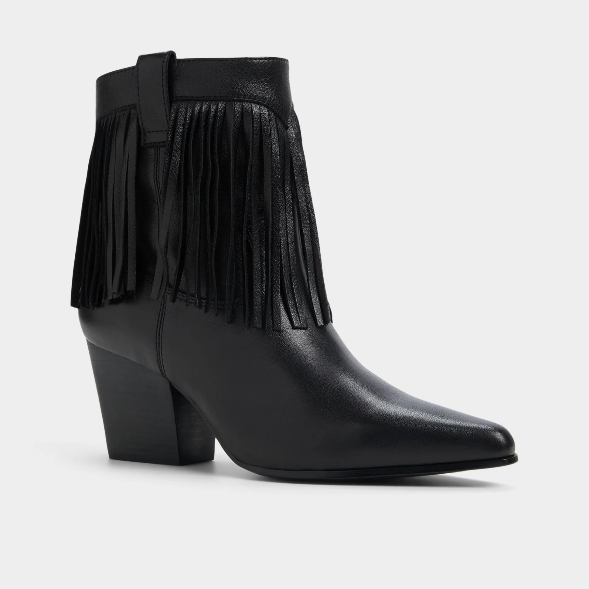 Fringe-trimmed supple black leather blooms around a pointed toe block heel, blending Western swagger with city polish in a statement silhouette that moves with you from street-ready errands to after-dark moments. Pair with cropped flares for record-store Saturdays, or swap in a swishy midi when festival nights call for extra rhythm.