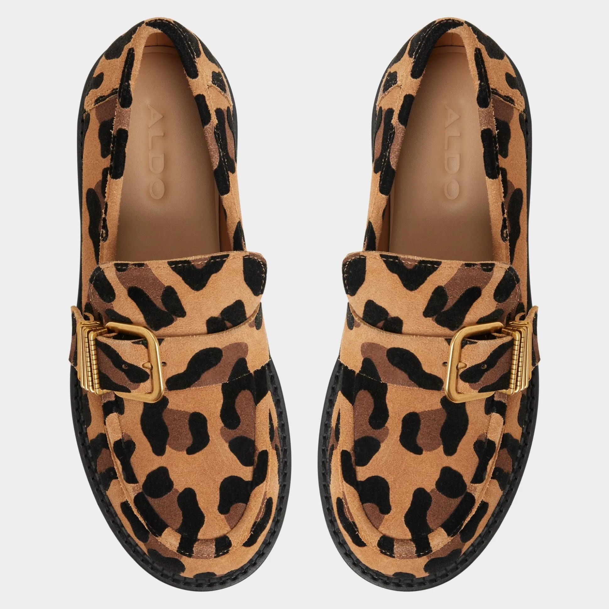 Leopard-print leather reshapes the classic loafer with a sculpted, chunky sole and a vintage-gold buckle that adds weight, edge, and quiet confidence from morning meetings to evening gallery crawls. Pair with tailored pants for boardroom polish or slip under a floaty midi for a city-night stroll.