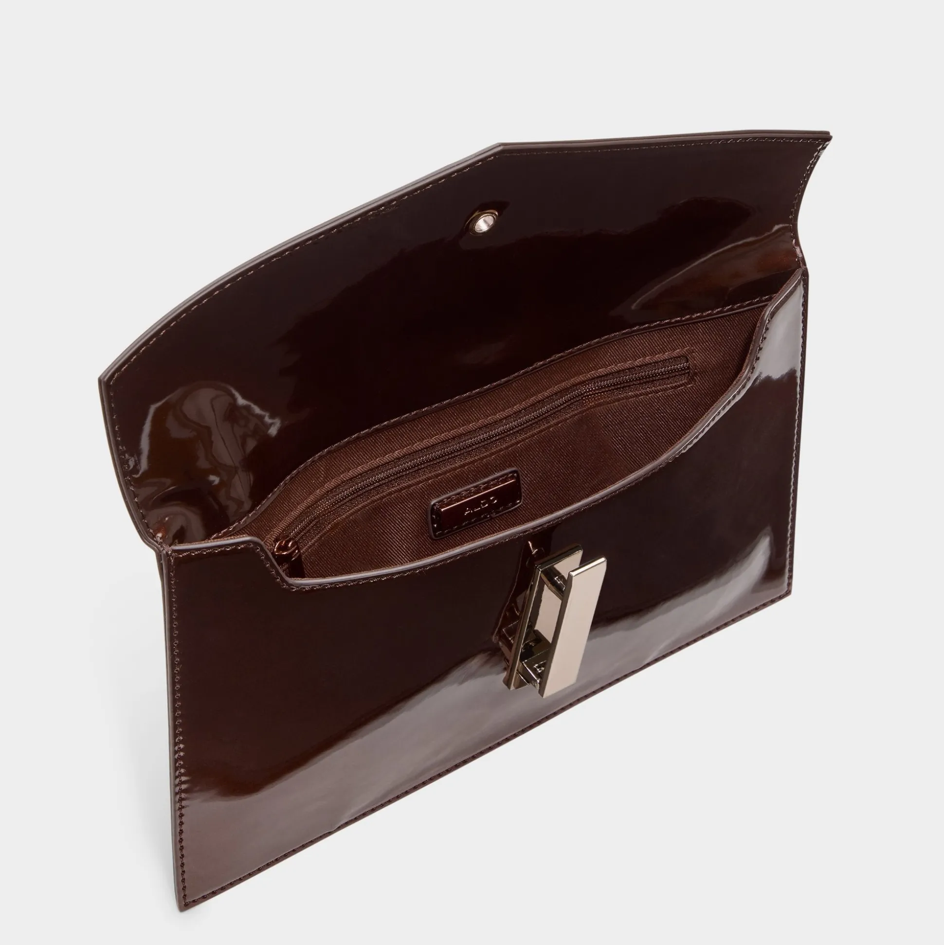 Espresso patent gloss brightens a curved envelope silhouette, with a sculptural silver bar snap revealing just enough space for the essentials, and a refined, architectural profile that feels instantly polished for evenings and rooftop dinners. Carry it under a satin blazer for rooftop dinners, or sling it over a knit midi and boots for artsy gallery afternoons.