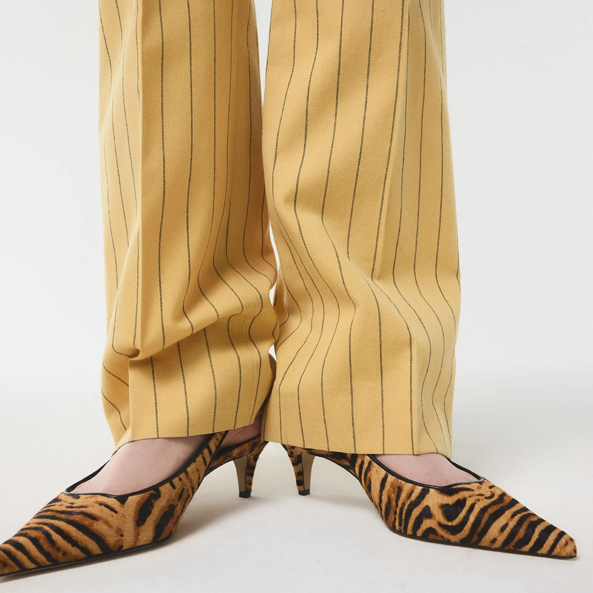 Tiger-print haircalf cloaks razor-pointed toes in a sleek silhouette, while elastic slingbacks keep the look easy from city sidewalks to after-dark dinners as you glide through morning meetings, coffee runs, and sunset strolls. Pair with tailored trousers for Monday briefs, or slip under a midi dress for rooftop drinks as dusk turns electric.