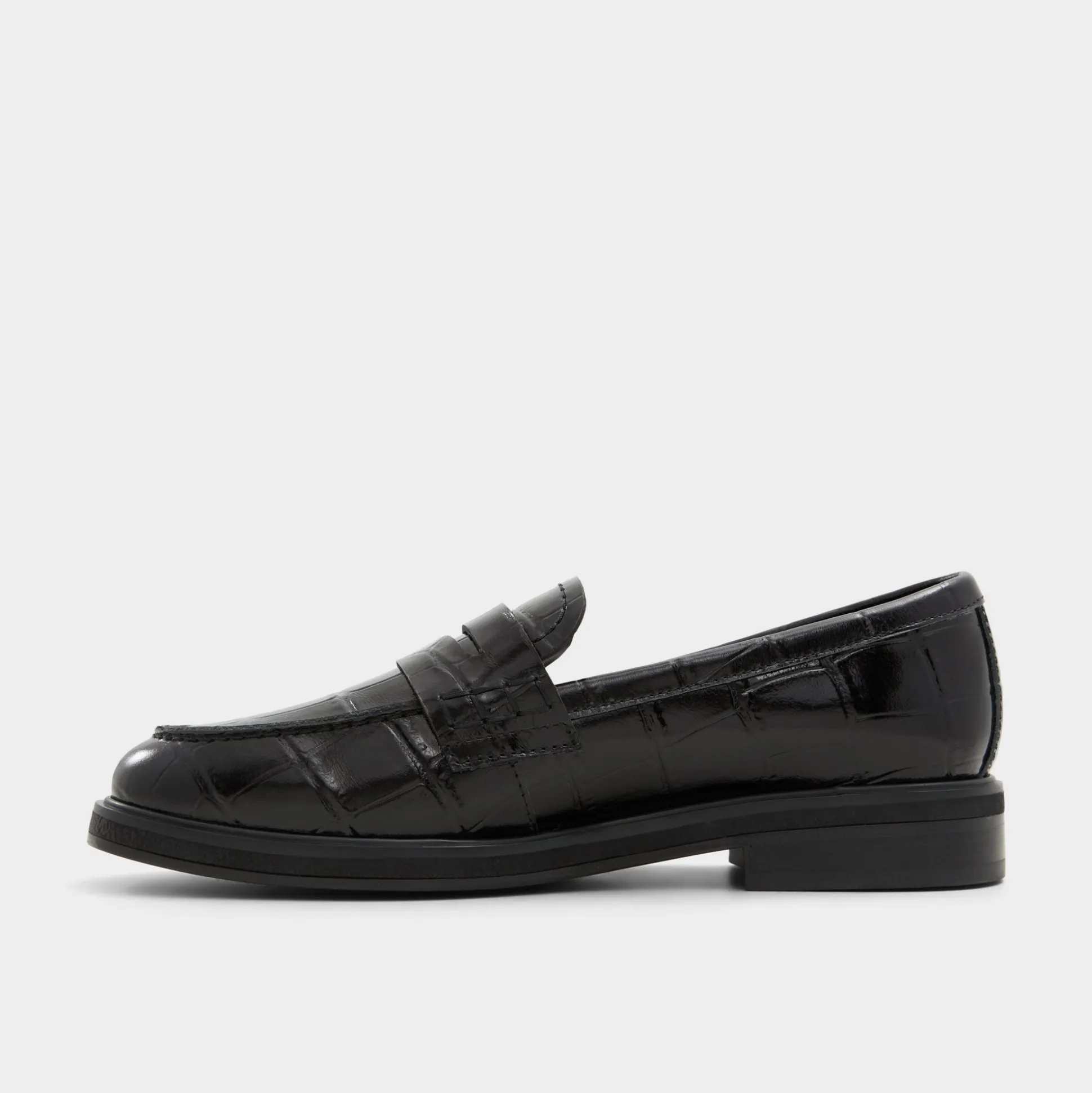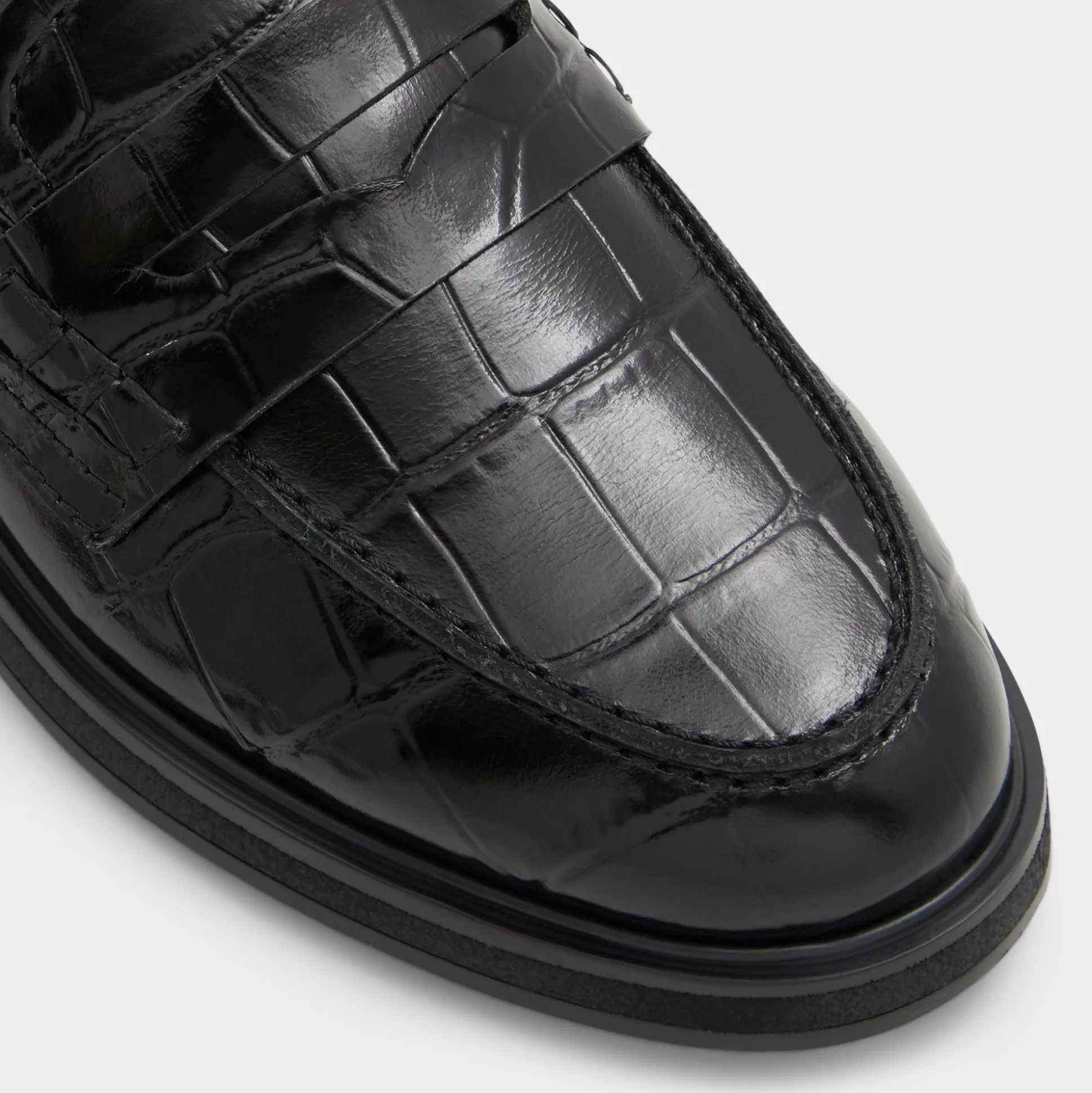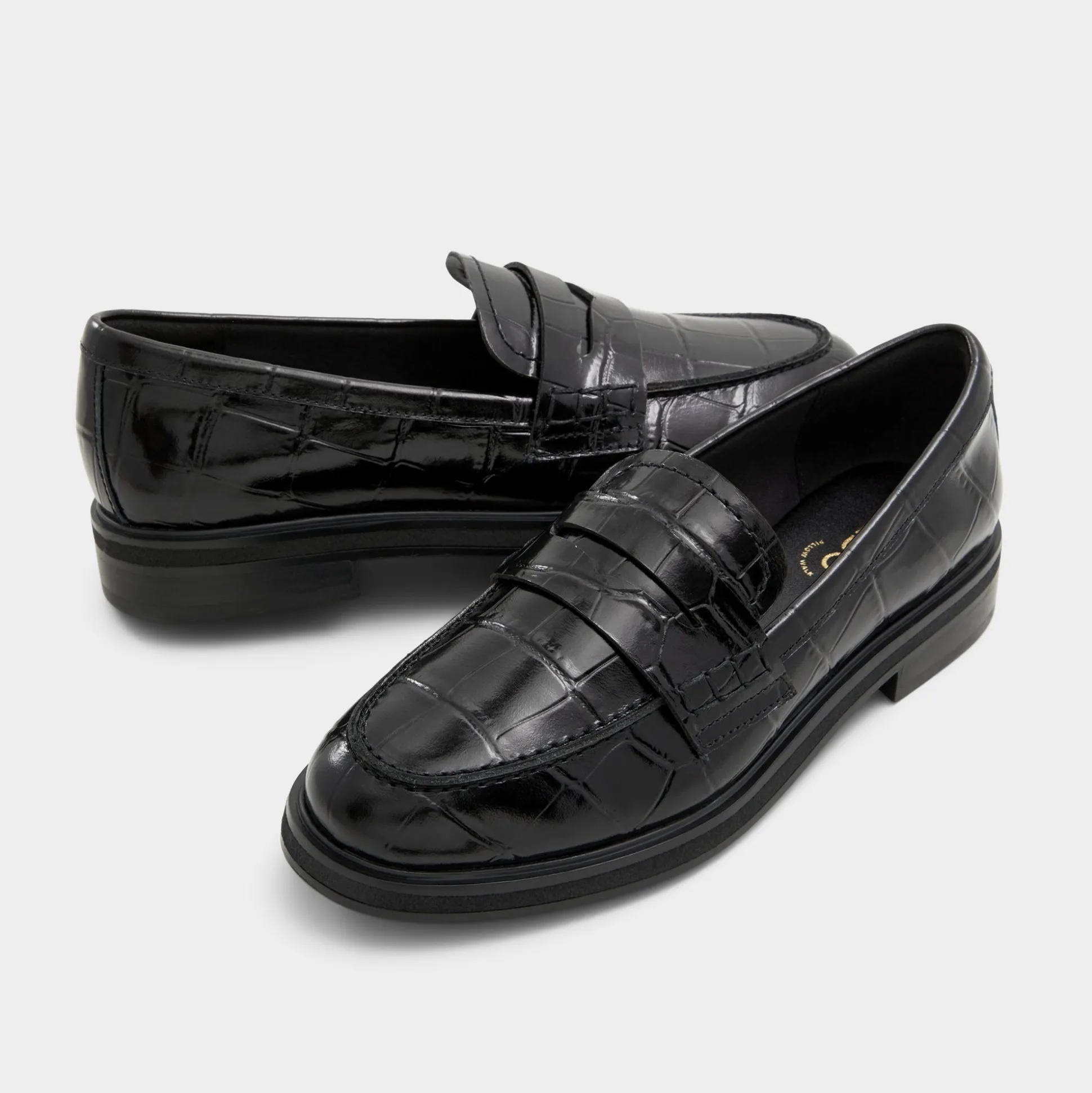 Glossy croc-embossed leather turns this penny loafer into a quiet power move, and the cushioned cup sole keeps strides easy so you can glide from subway stairs to strategy sessions without missing a beat. Pair with sharp pleated trousers for stake-out meetings, or swap in cropped denim when gallery drinks run past curfew.