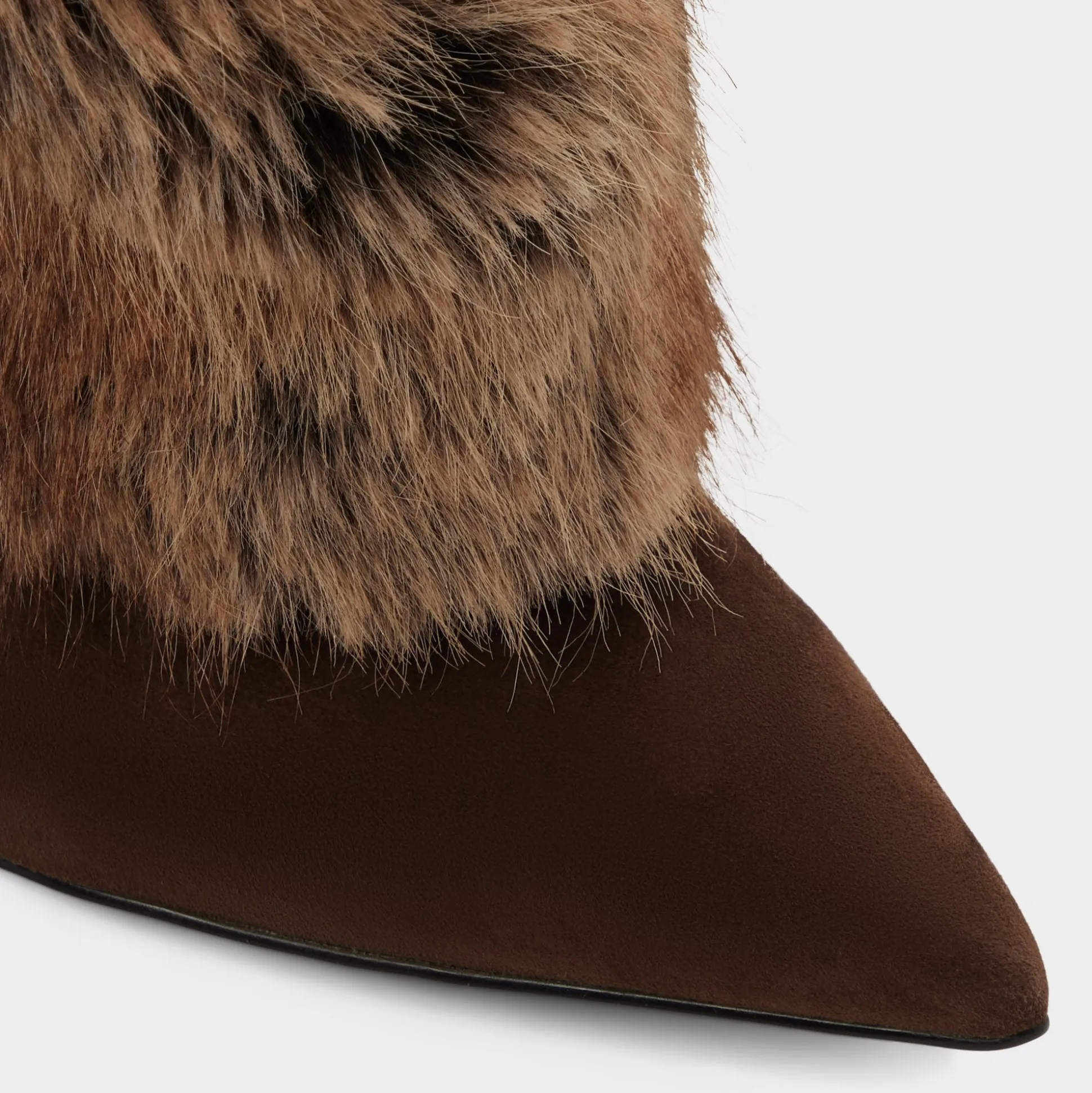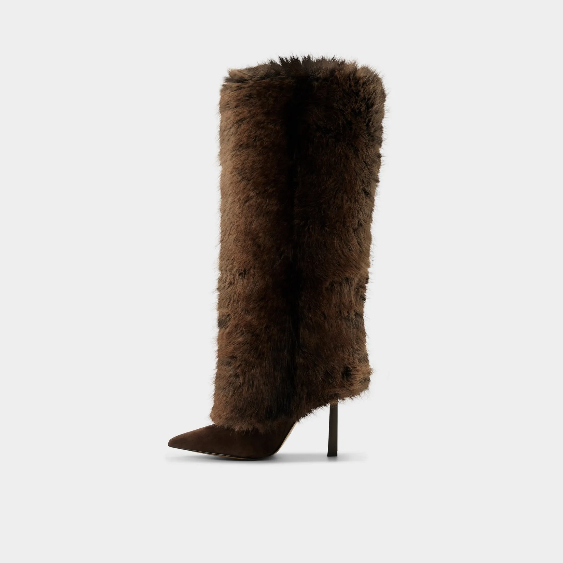 A plush runway-tall column of faux fur wraps this pointy-toe knee boot, while the suede vamp and slim stiletto keep things sleek, turning every sidewalk breeze into a personal photobooth. Pair with leather shorts for late-night gallery hops, or ground a sweaterdress when apres-ski cocoa turns into terrace cocktails.