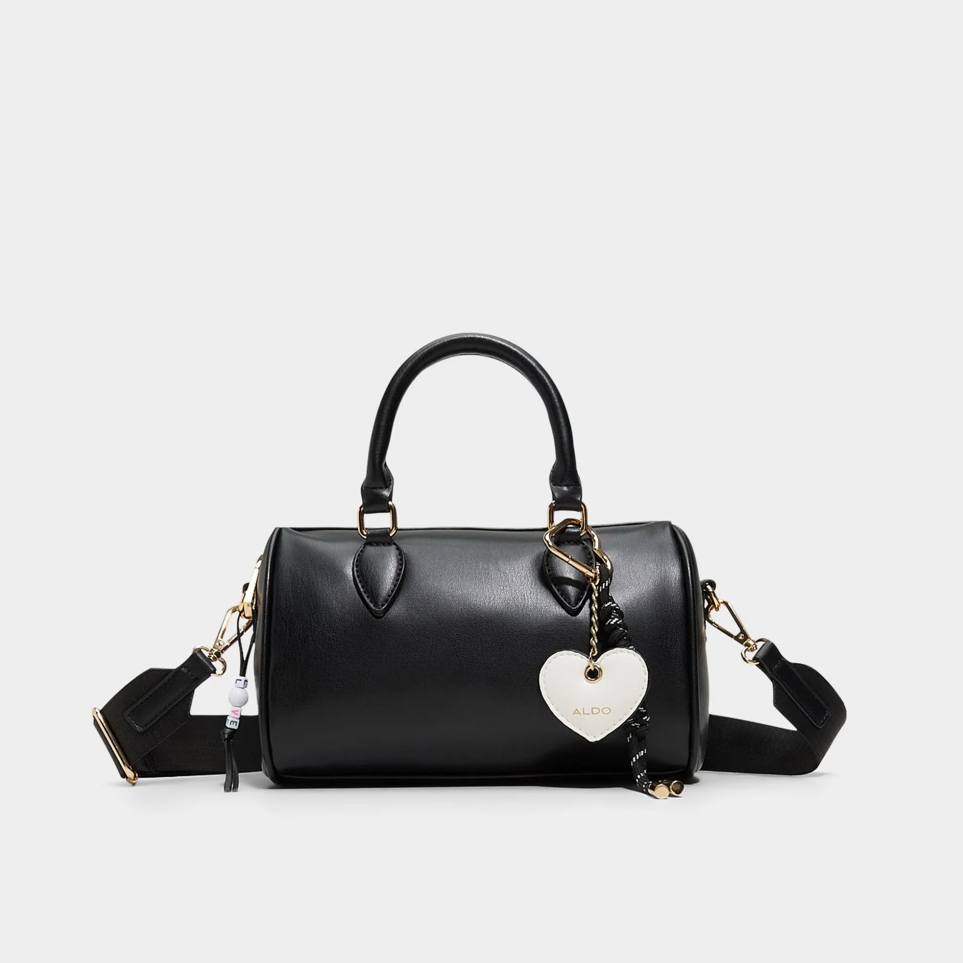 Black barrel bag with a convenient top handle and removable heart-shaped ornament. The perfect romantic accessory for Valentine’s Day plans—timeless style meets festive charm in one versatile piece.