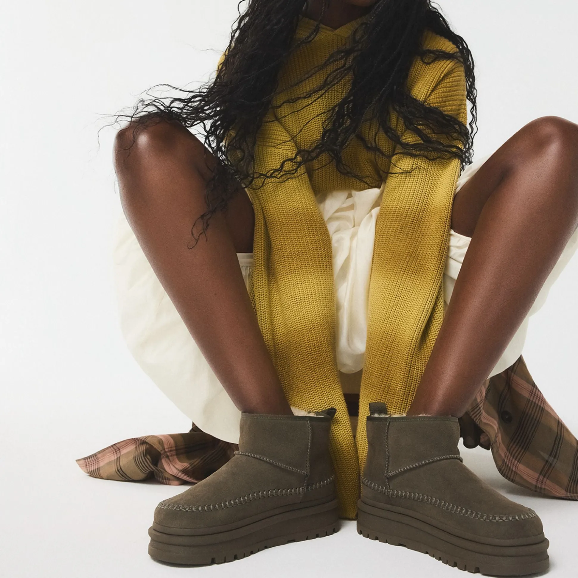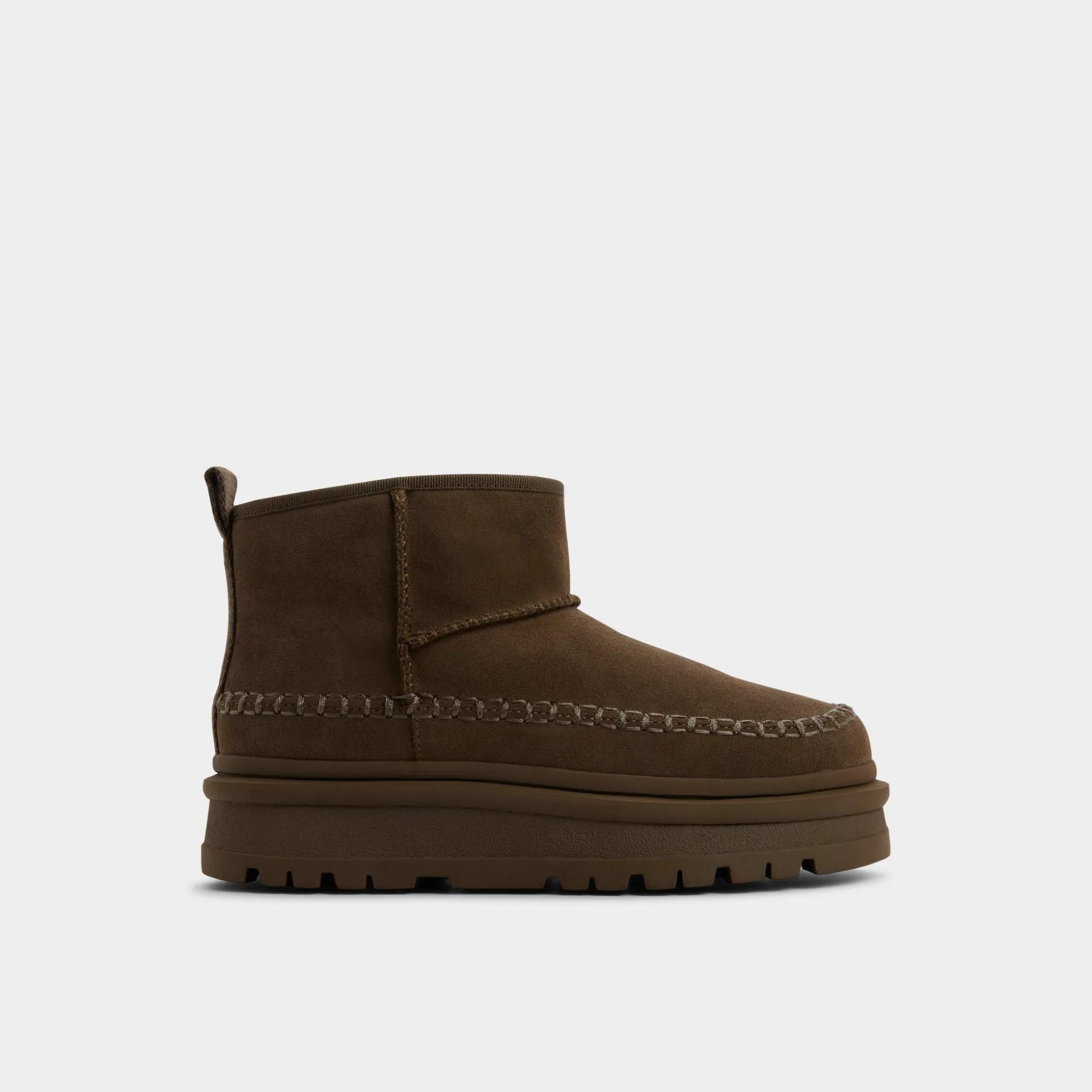 Earthy suede with contrast whipstitch surrounds a plush faux-fur interior, while the chunky lug flatform offers steady lift for cafe detours and dog walks even on frosty pavements. Pair with relaxed joggers on errand mornings, or swap in ribbed tights and a sweater dress for casual coworker catch-ups.