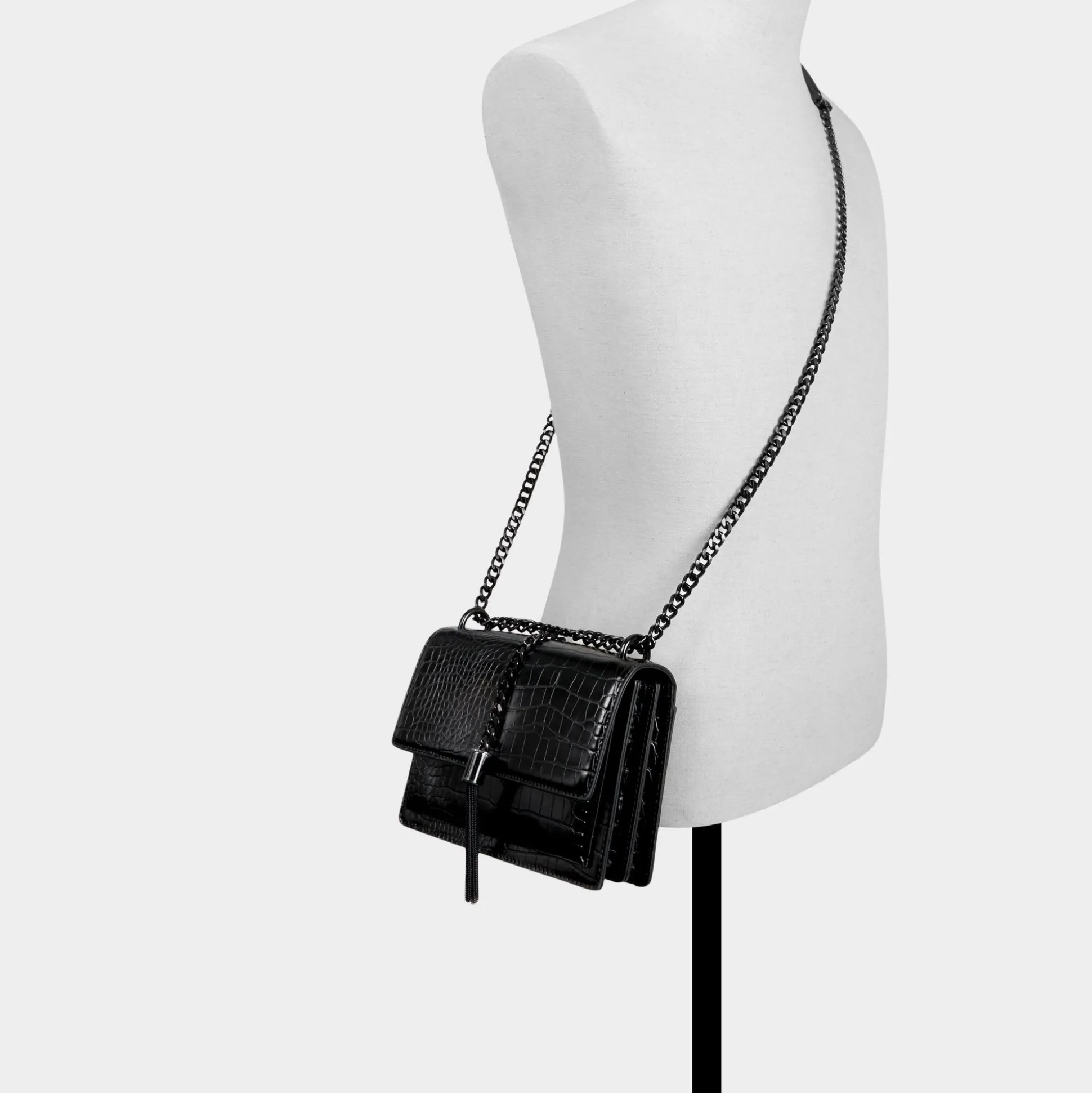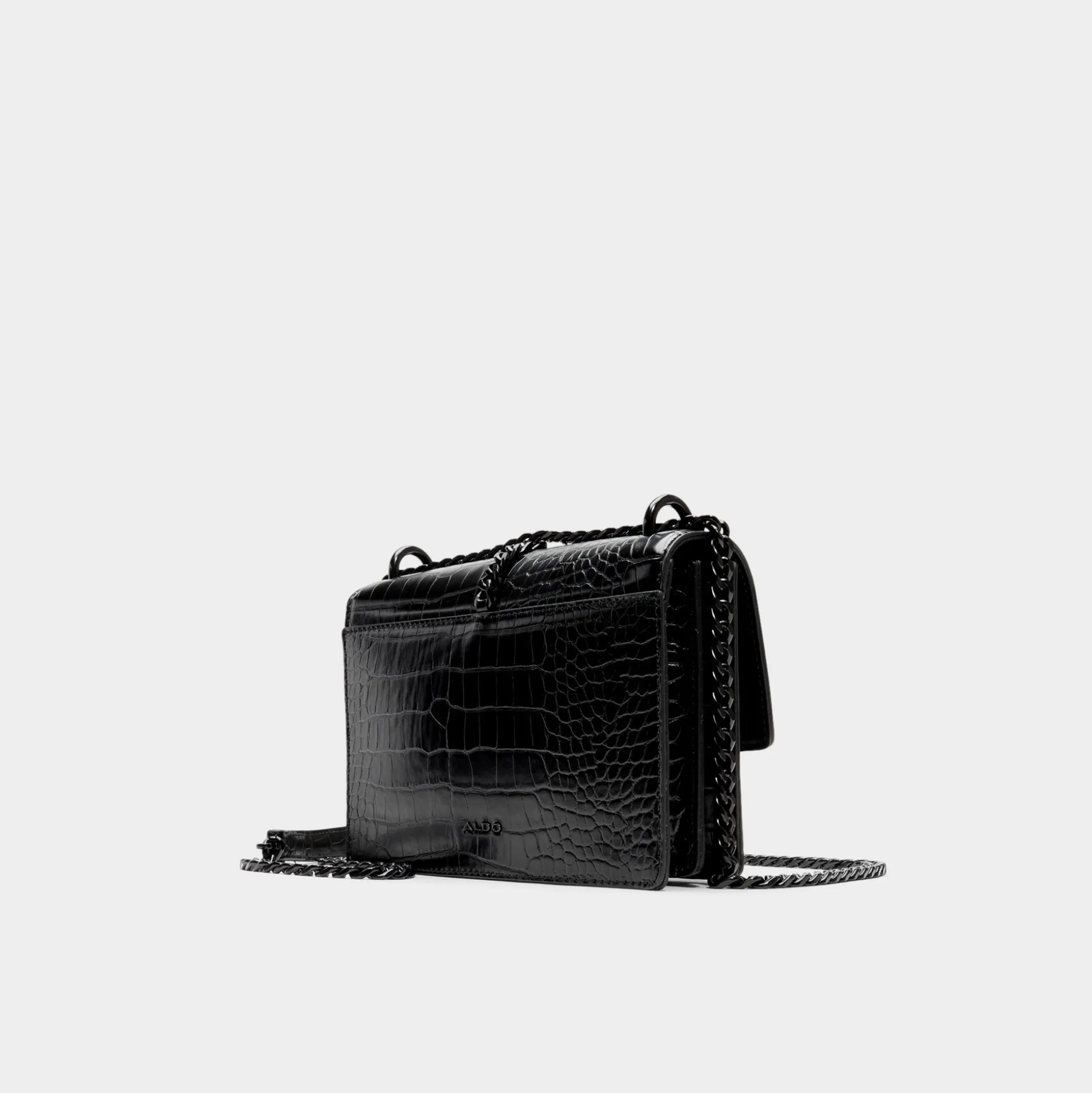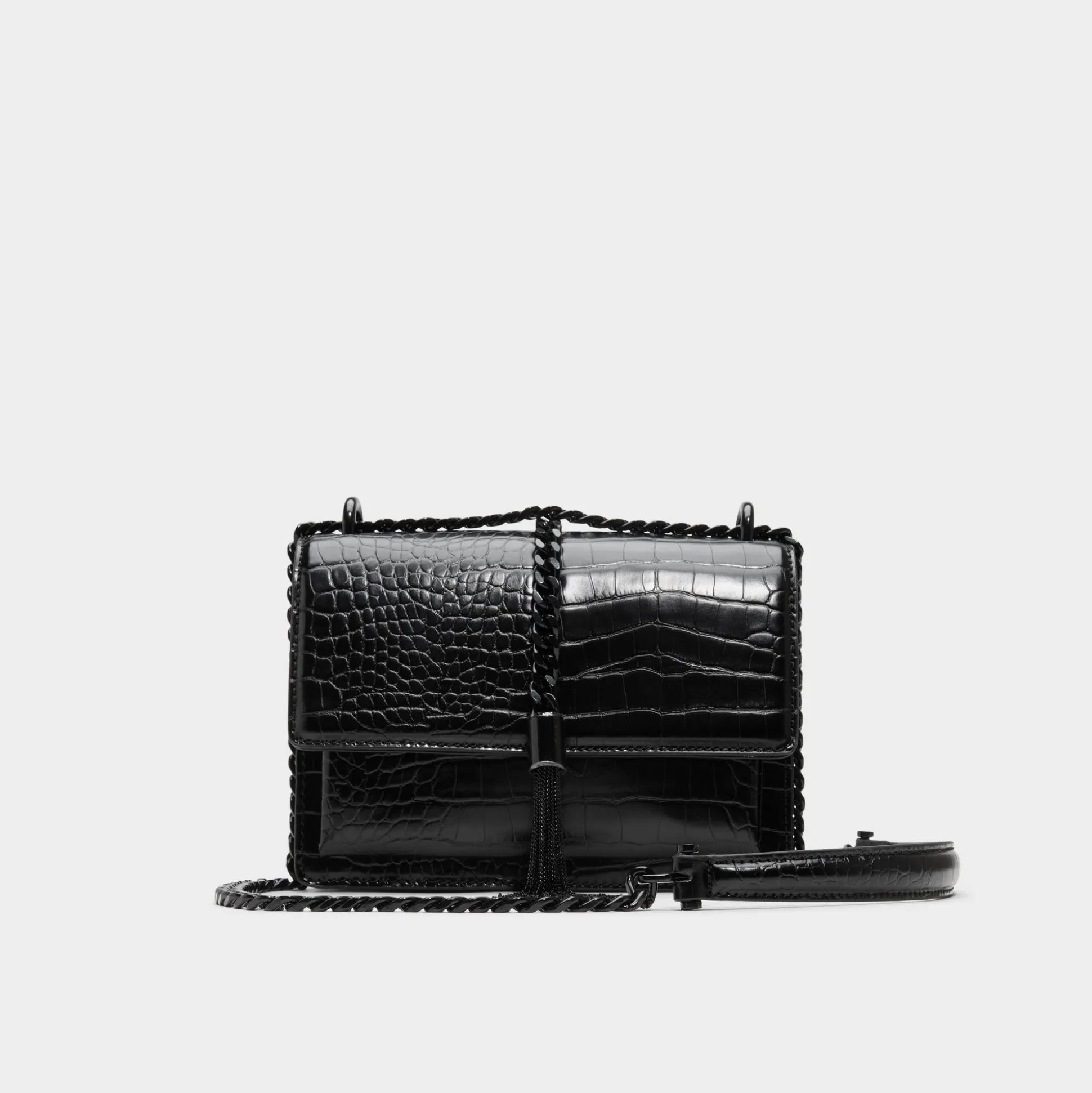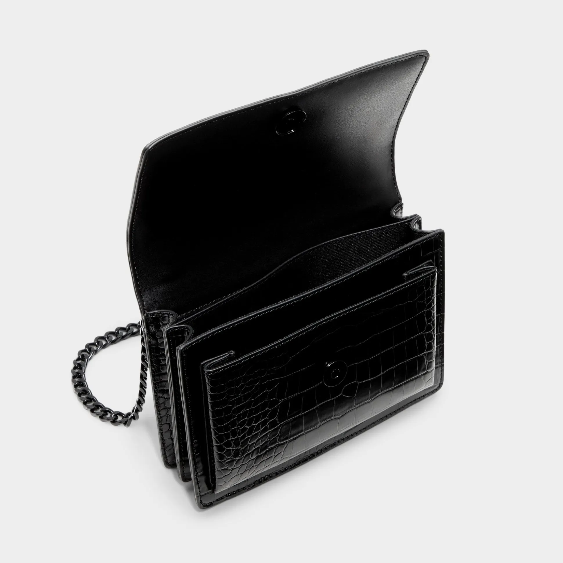 Glossy midnight croc emboss pairs beautifully with twisted rope-chain edging on this structured crossbody, where the rope-chain is the hero feature and tonal black hardware keeps essentials sleek from first espresso through last encore. Sling it over slip dresses for rooftop dates, or tuck inside oversized blazers during gallery strolls to seal city polish.