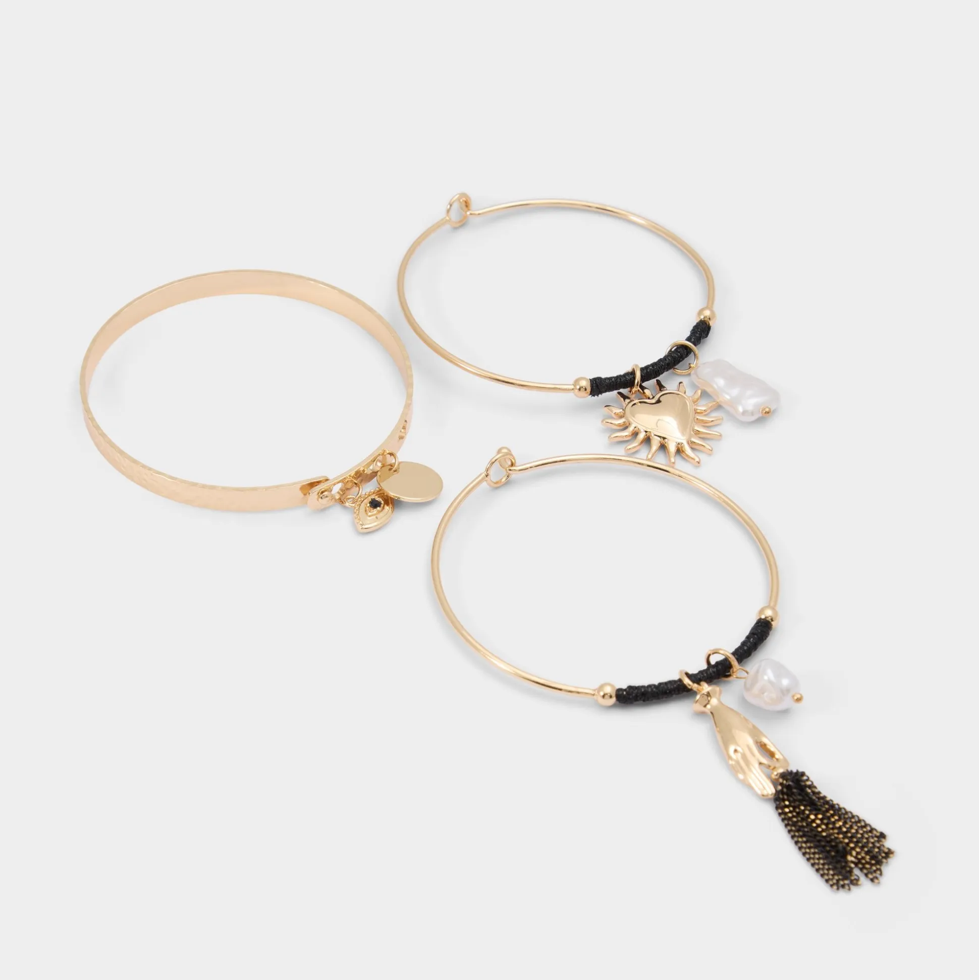 Three bangles, a cuff, and two hoops, carry glinting sun and heart charms, turning wrist flicks into sparkle and elevating a simple stack from daytime errands to after-hours shine. Layer them with a breezy romper for beach strolls, or stack a single hoop against a crisp blouse for office sparkle.