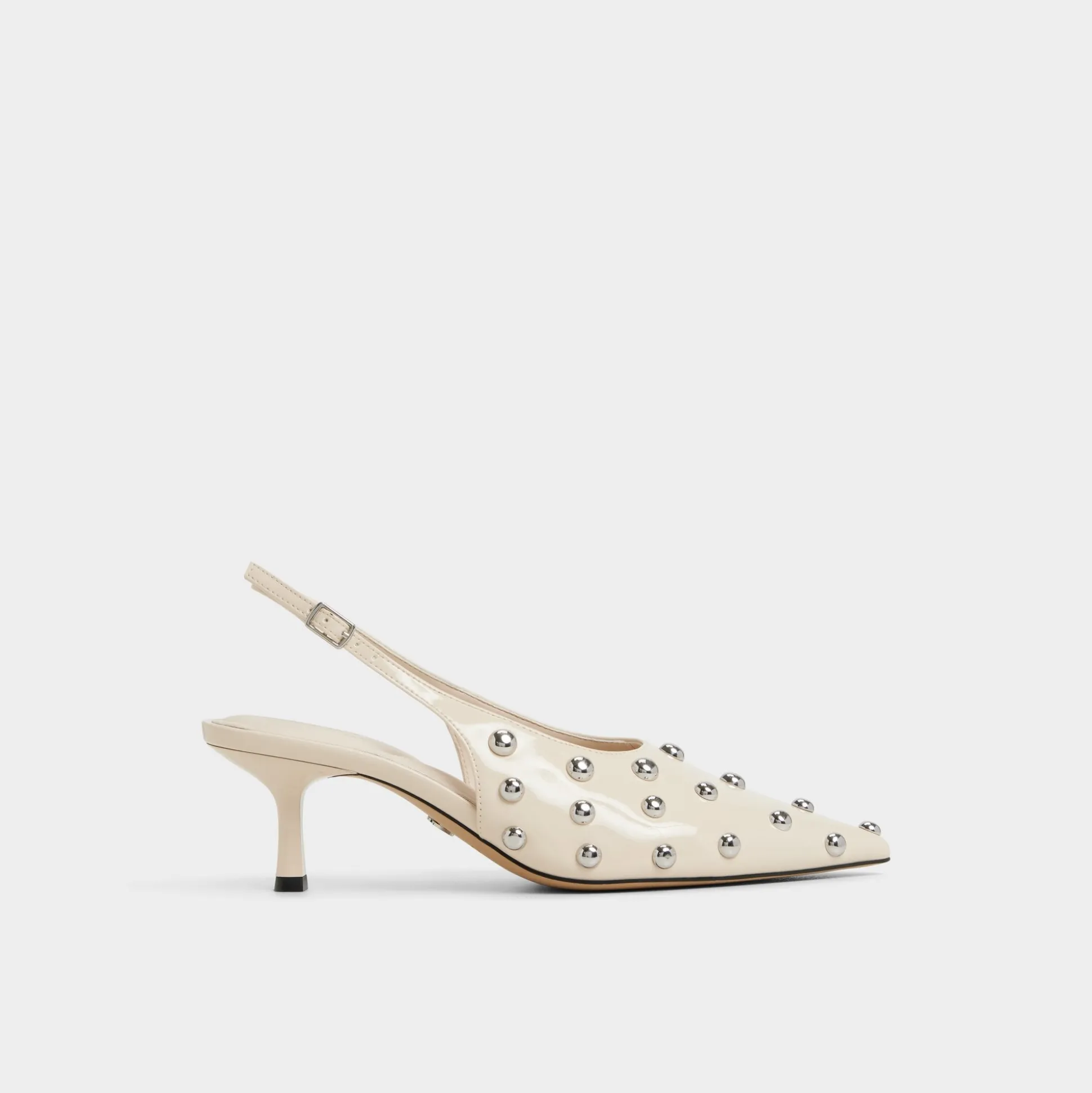 Glazed patent leather with silver studs catches city lights, while a sculpted kitten heel and slingback buckle keep it poised yet easy, letting you stride with rebellion and no wobble. Pair with cropped tailoring for meetings, or swap in a sleek slip dress for rooftop cocktails.