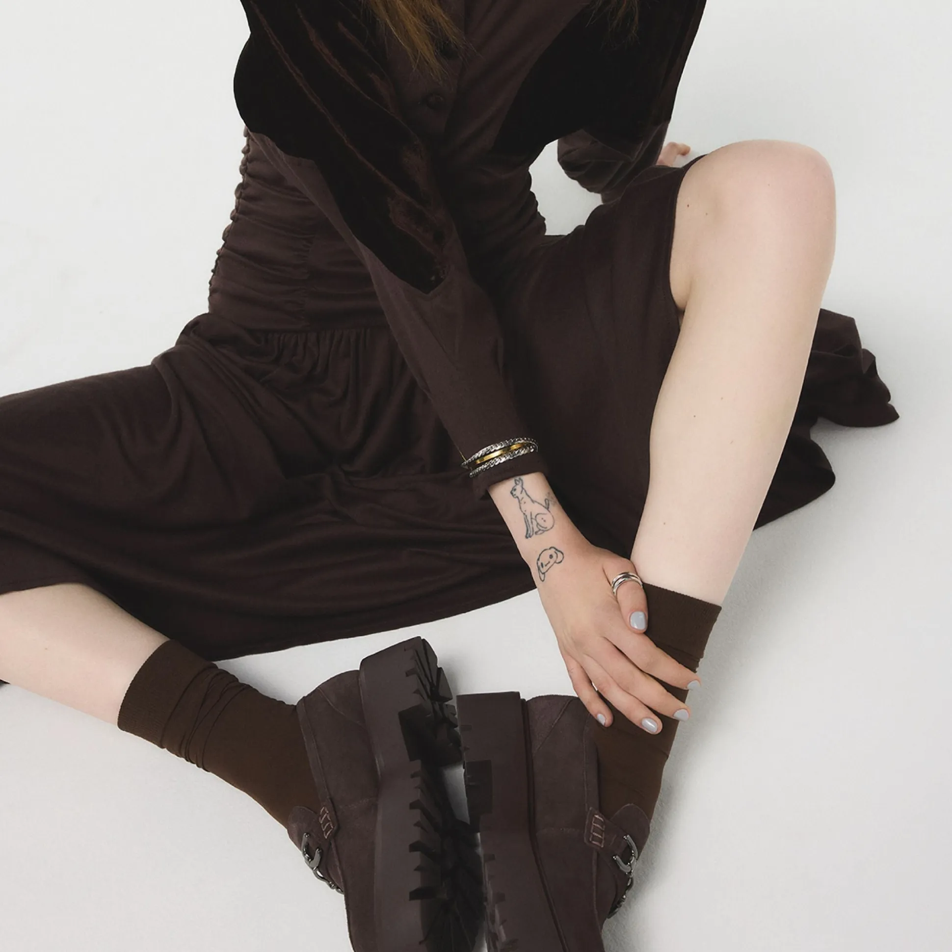 Plush coffee-brown suede meets a bold lug platform, giving the classic loafer extra altitude and that satisfyingly sure step you want when morning brainstorms blur into sidewalk detours, all while keeping underfoot calm. Ground pleated trousers for office catch-ups, or swap into cropped denim when record-store strolls call for easy swagger.