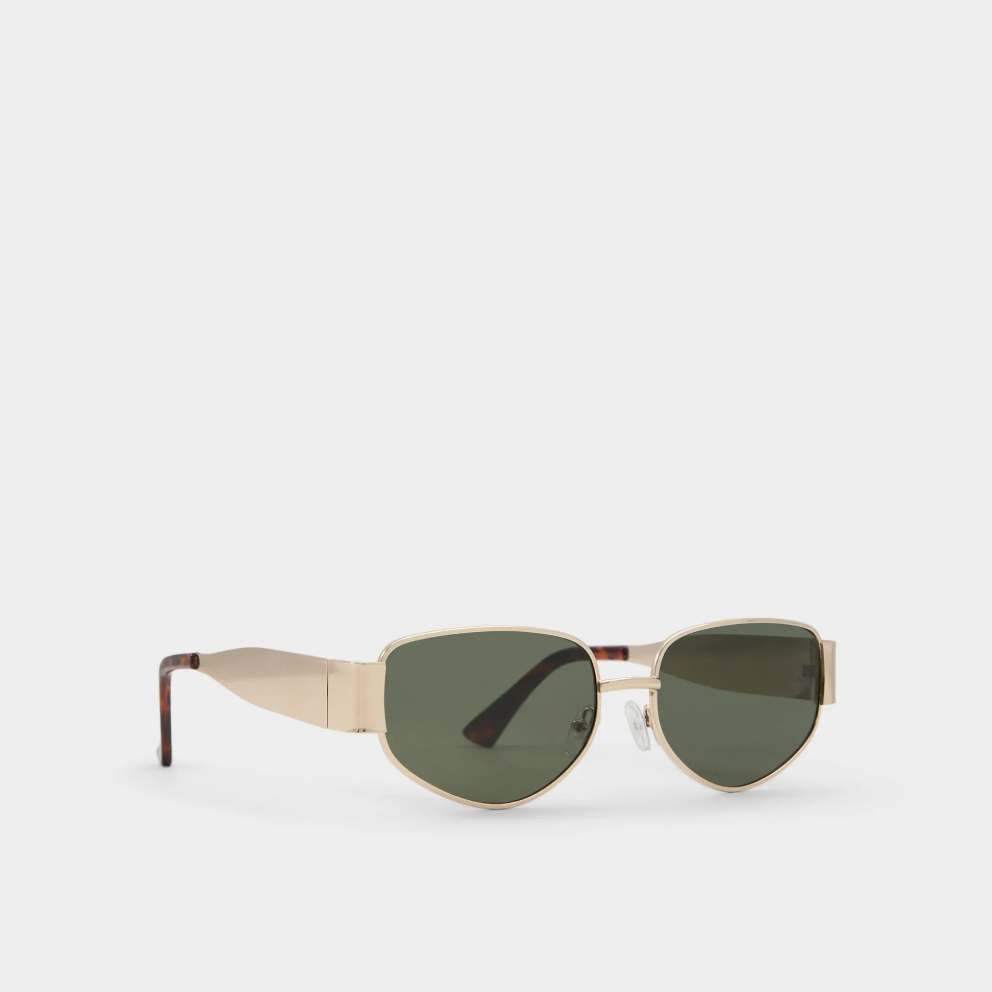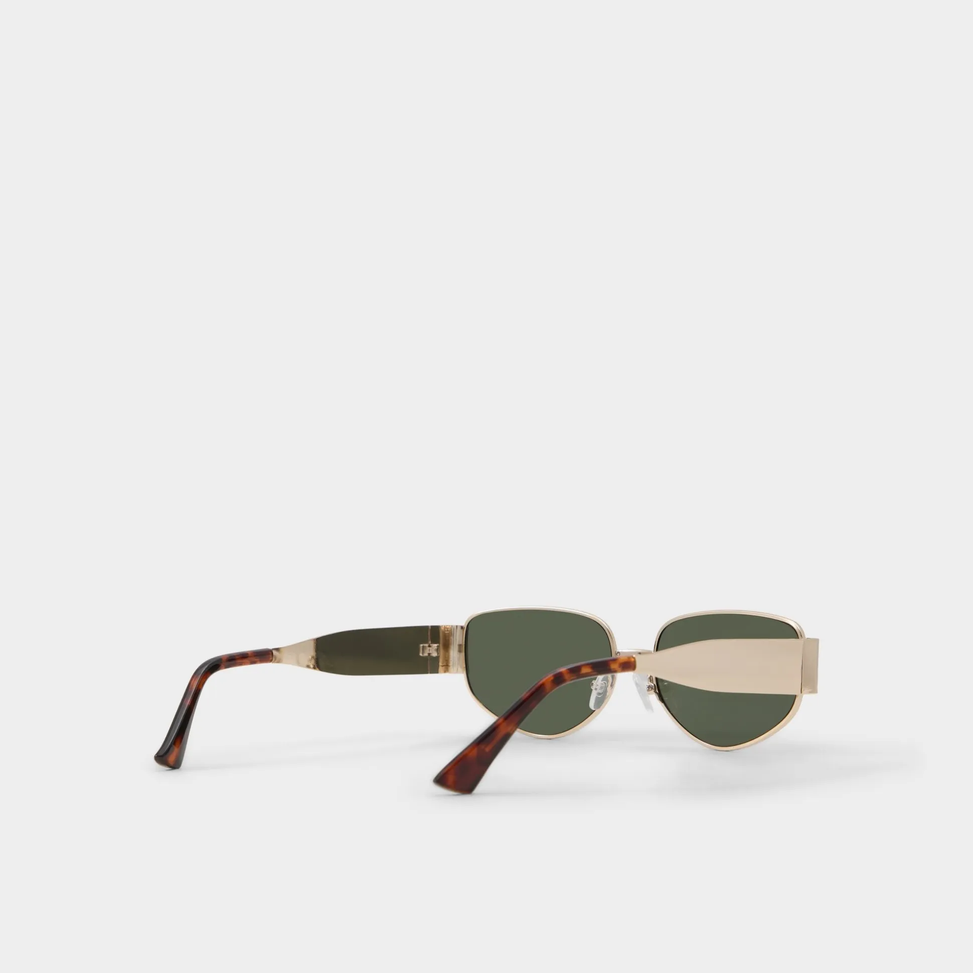 Gold-tone metal frame shapes these glasses into a square silhouette featuring a double bridge and rich olive lenses that catch light beautifully. Wear them with a slip dress for date-night glow or pair with denim and blazer for effortless city errands.