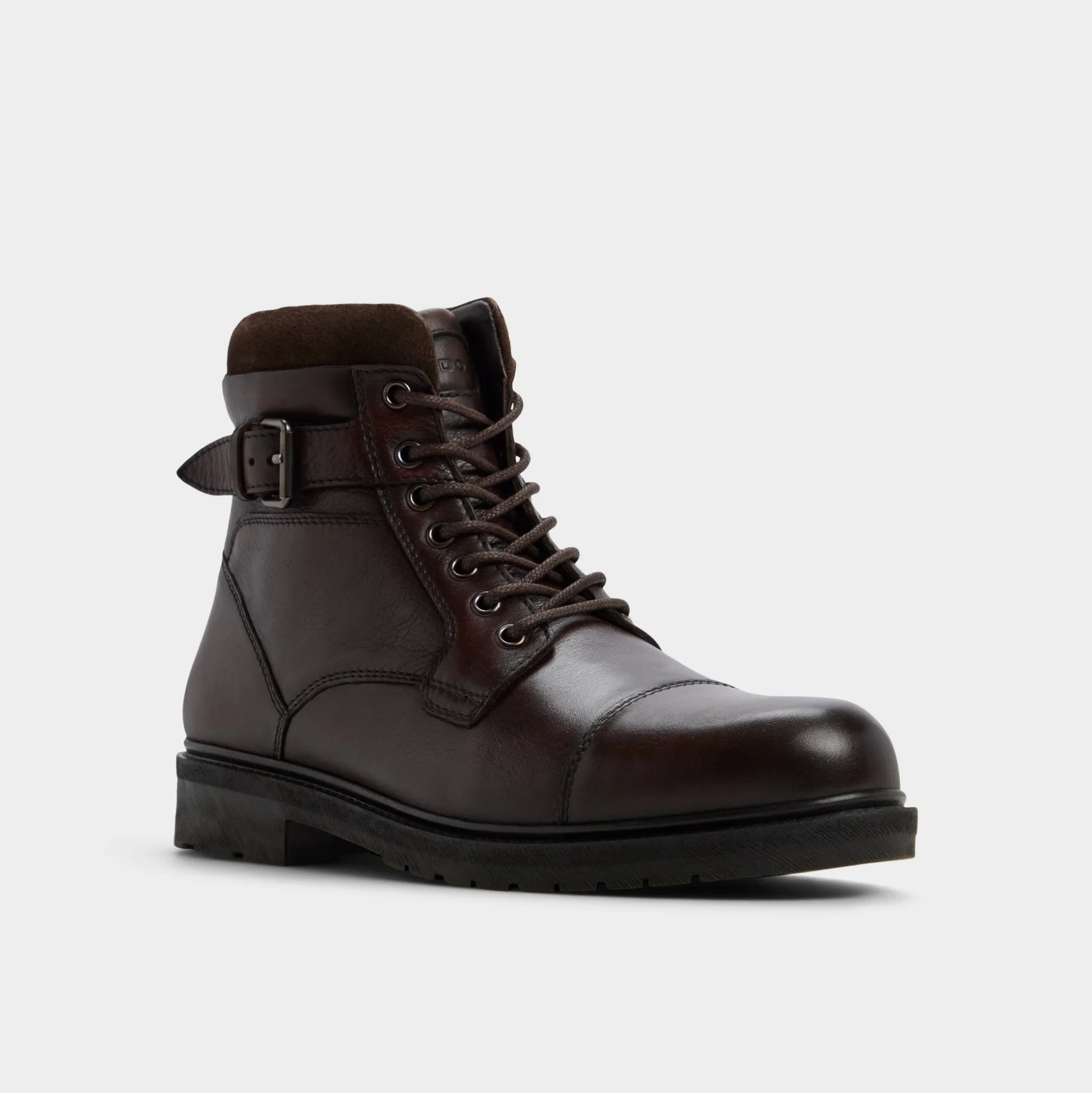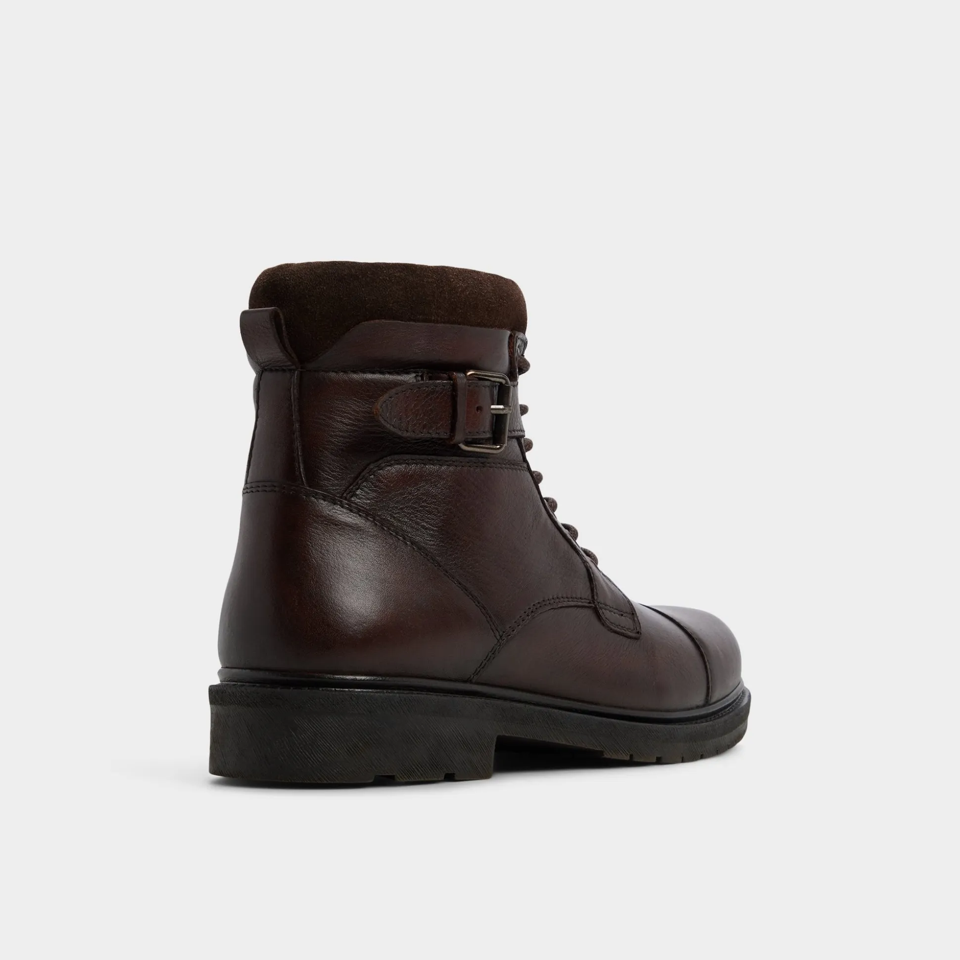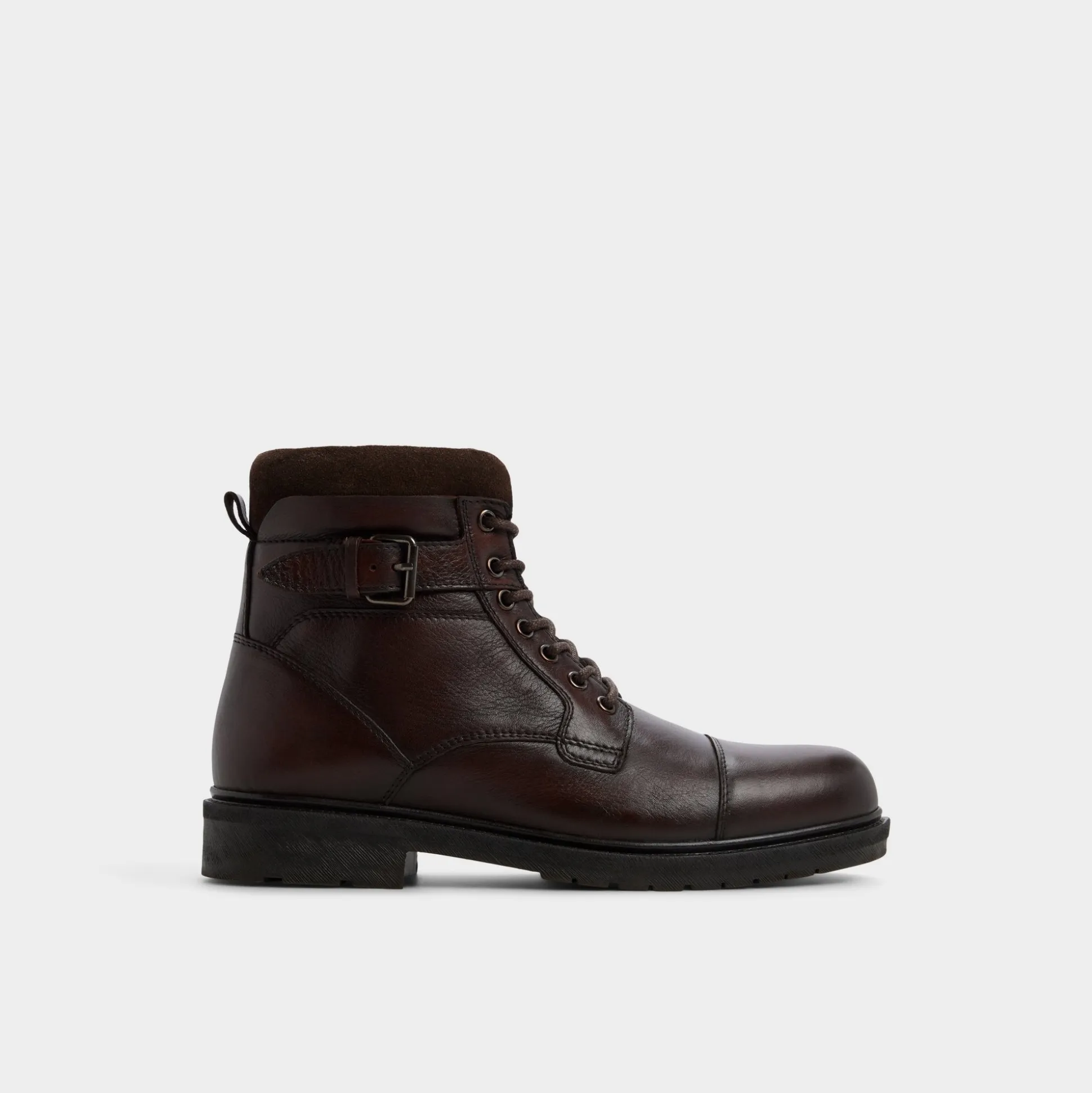 Espresso leather meets a textured wool collar and functional buckle strap, giving this cap-toe boot street-ready attitude, while a lugged rubber sole grips wet sidewalks and cushioned lining eases winter commutes. Anchor dark selvedge denim for weekend markets or smarten flannel trousers at casual offices-the brown hue fits everywhere.