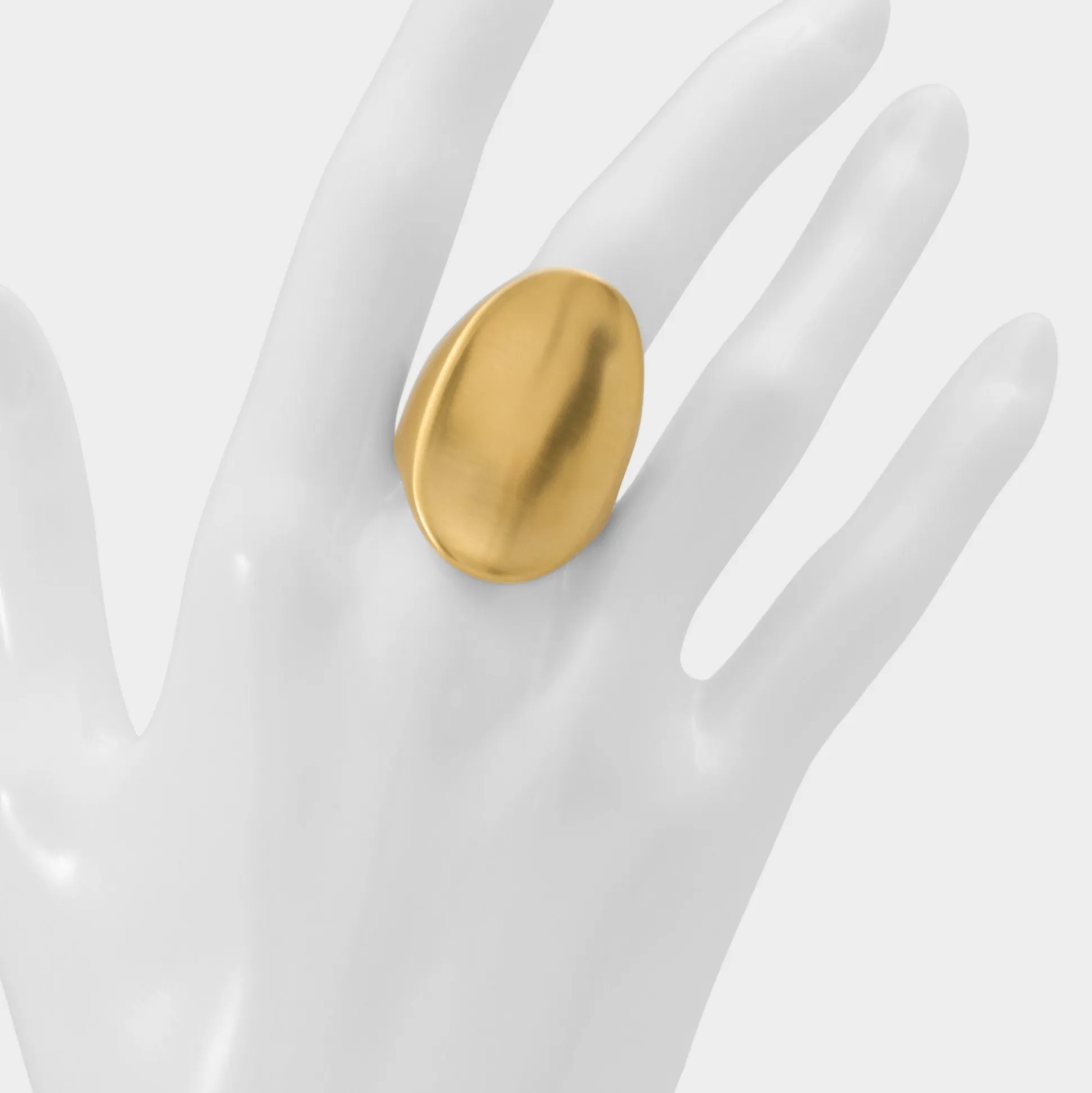 A mirror-smooth dome rises from an asymmetric band, creating an uninterrupted curve that captures the eye. Stack it with rings for errands, wear it solo with slips at gallery openings, and mirror the look with a chain or bracelet as the day shifts to evening.