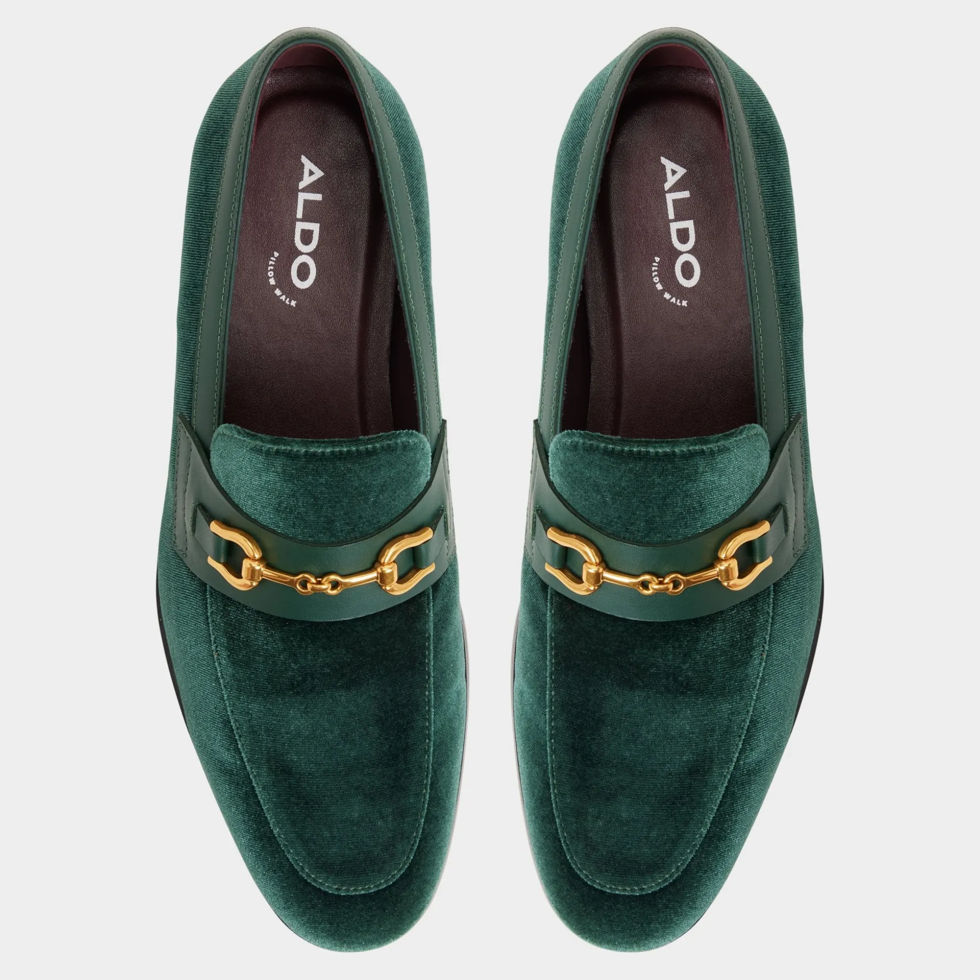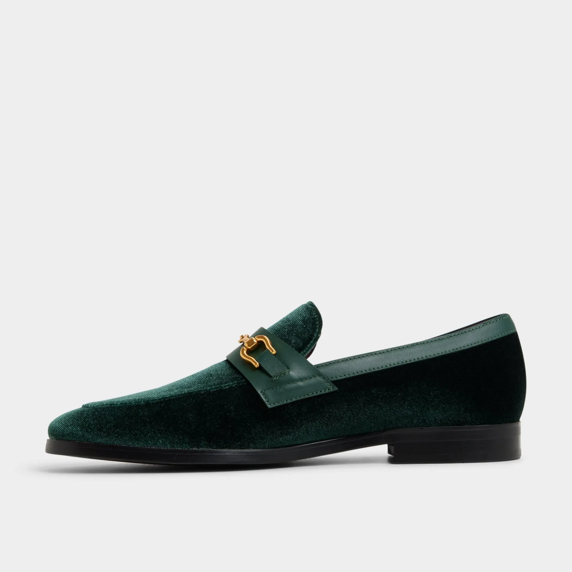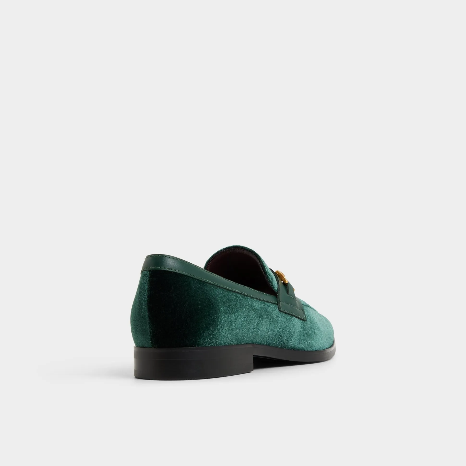 Emerald velvet drapes this slip-on loafer in quiet luxury, while a matte horsebit lends sculpted shine and a low stacked heel steadies every step with effortless poise for days that flow from desk to after-hours. Pair with tailored trousers for a gala-ready moment, or cuffed denim and a lightweight blazer for a versatile city evening.