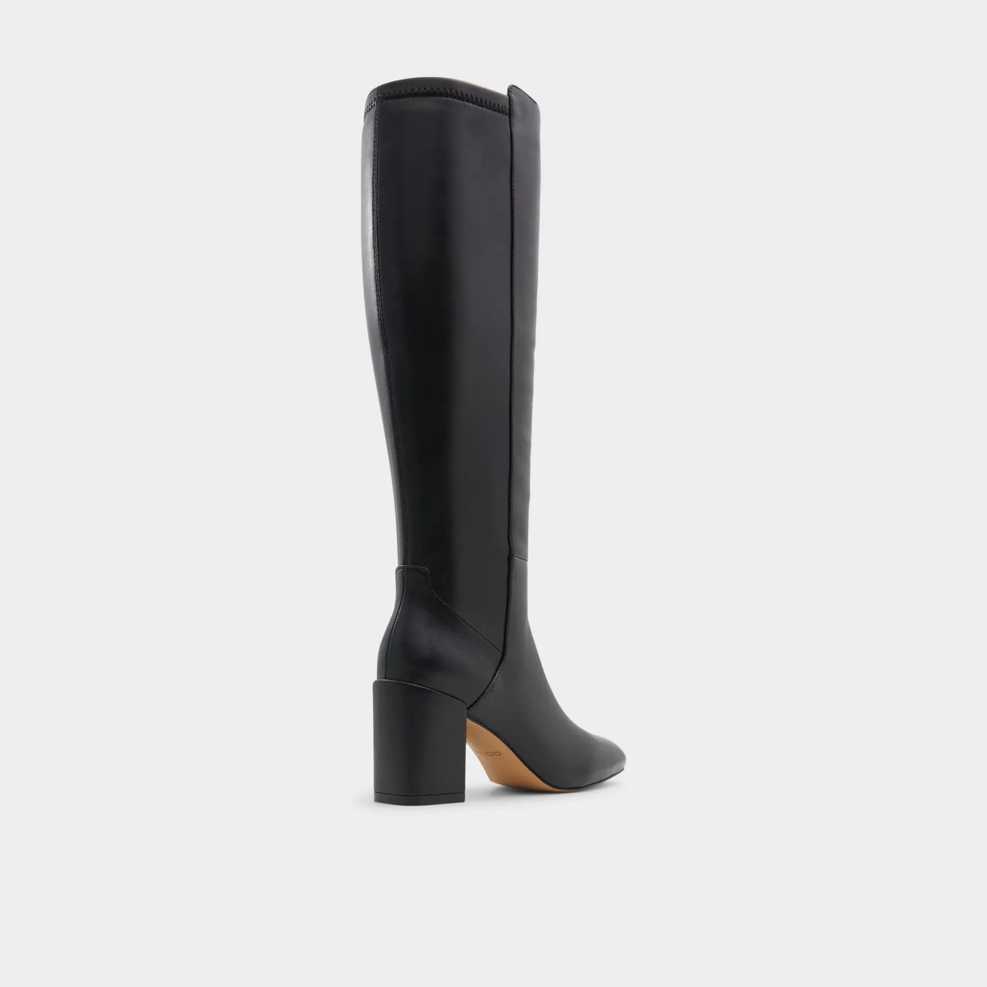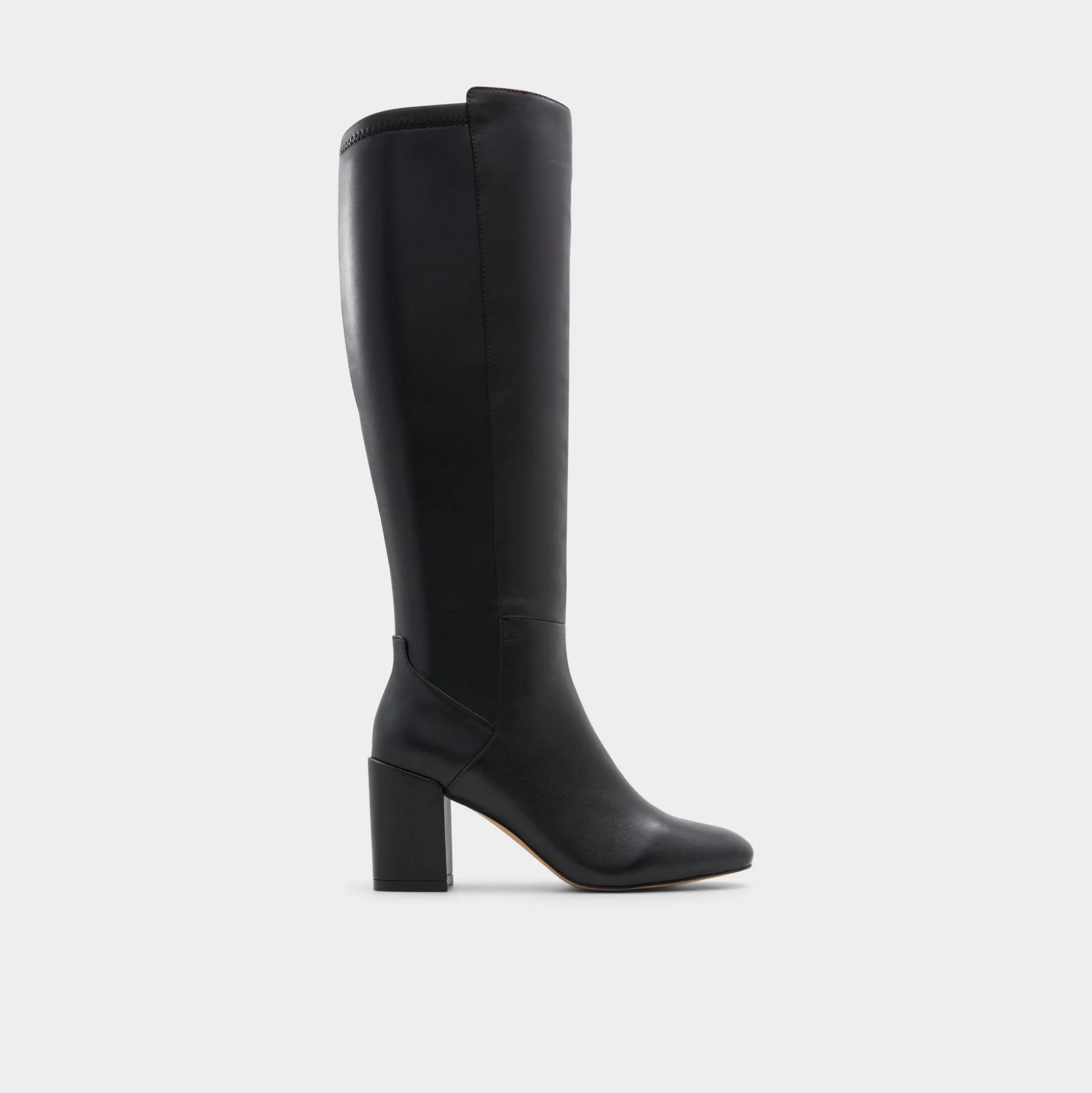 Knee-high black leather hugs the leg in a polished sweep, pairing a chunky block heel with a sleek almond toe for steady lift and city-ready polish. Pair with a ribbed sweater dress for commute mornings, or ground tailored shorts for city errands that demand both polish and ease.