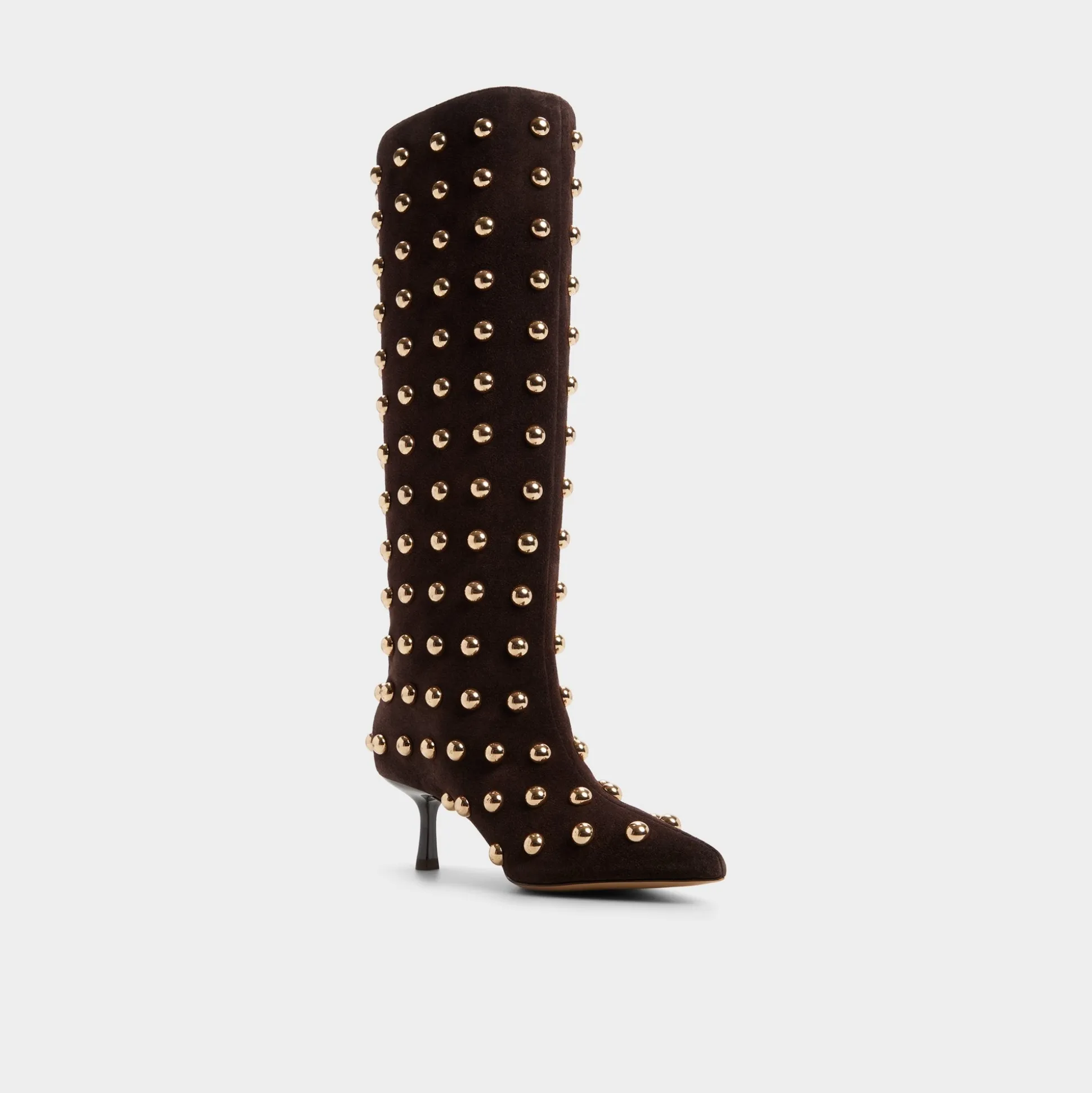 Velvety suede rises to the knee adorned with rows of gleaming gold studs that catch every sidelight, while a sleek kitten heel lets you linger comfortably at exclusive events. Pair with a leather mini for rooftop concerts, or ground a slim turtleneck-and-denim combo when errands call for quiet drama.