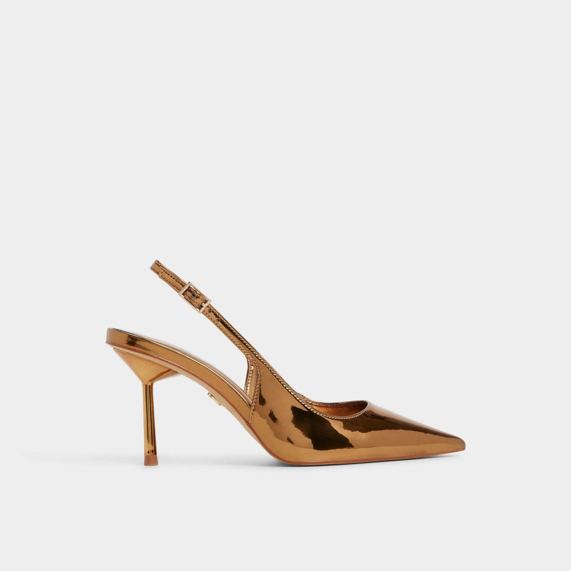 Molten metallic leather covers this razor-sharp point-toe slingback, pairing a slim stiletto with an adjustable buckle to give your stride edge as neon lights sweep every confident step through the city. Pair with sleek suiting for presentation mornings, or swap in a satin mini for nights out.