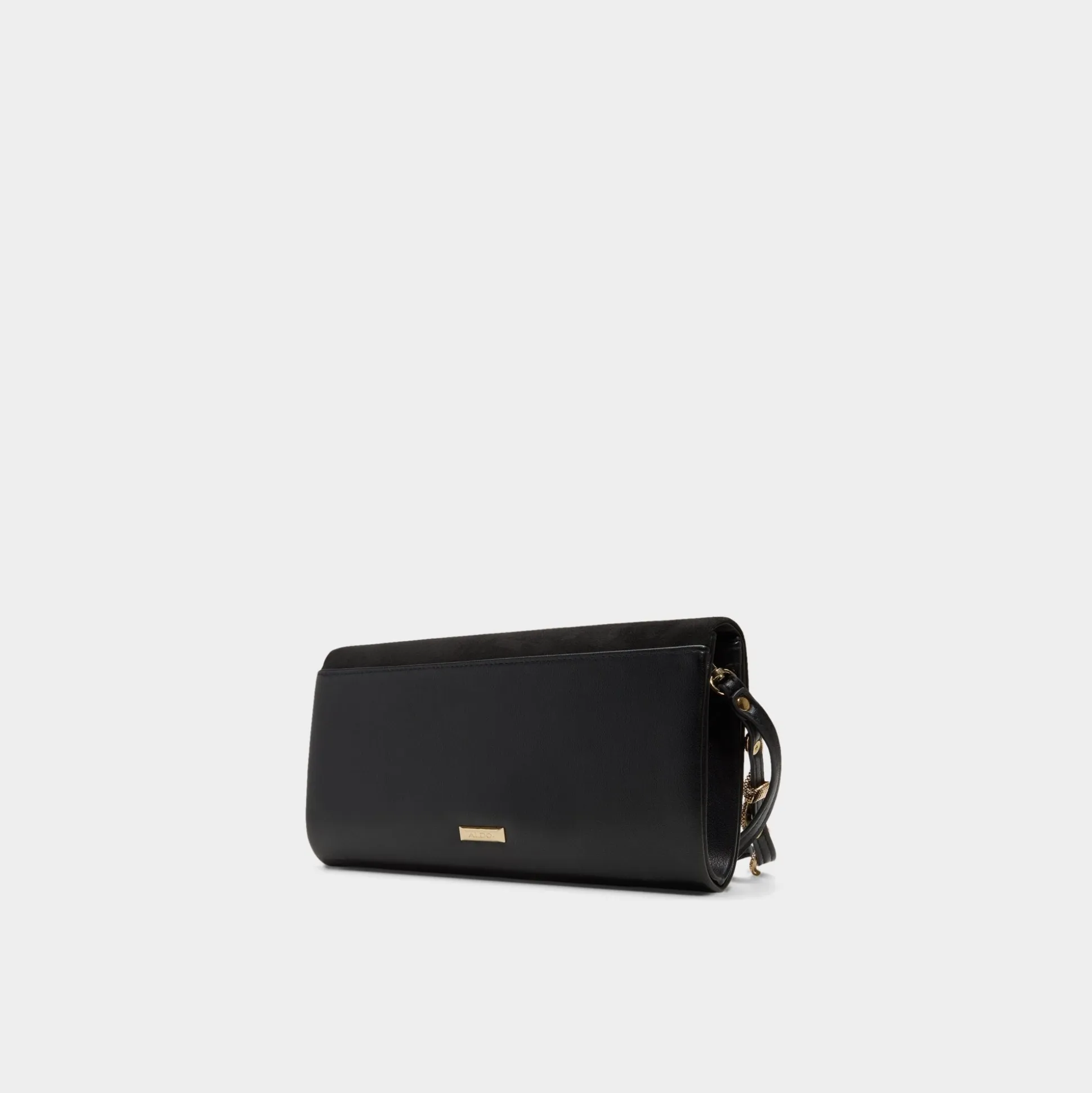 Velvety suede folds into a sharp envelope over smooth black leather, edged in gold with a sculptural snake-link strap that snaps off, flipping the clutch from hand hero to effortless shoulder swing. Carry it with a satin slip at rooftop drinks or sling it over a blazer-and-jeans brunch look, pulling every outfit together with subtle rebel polish.