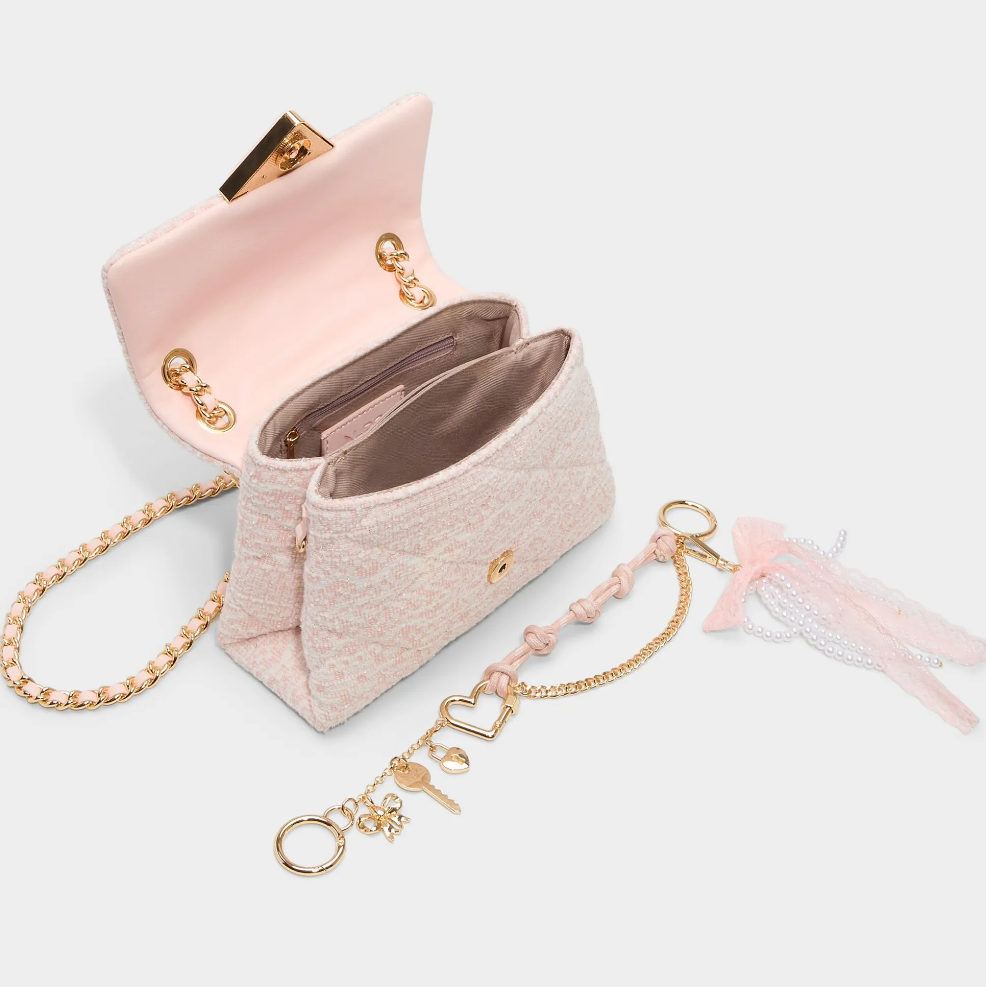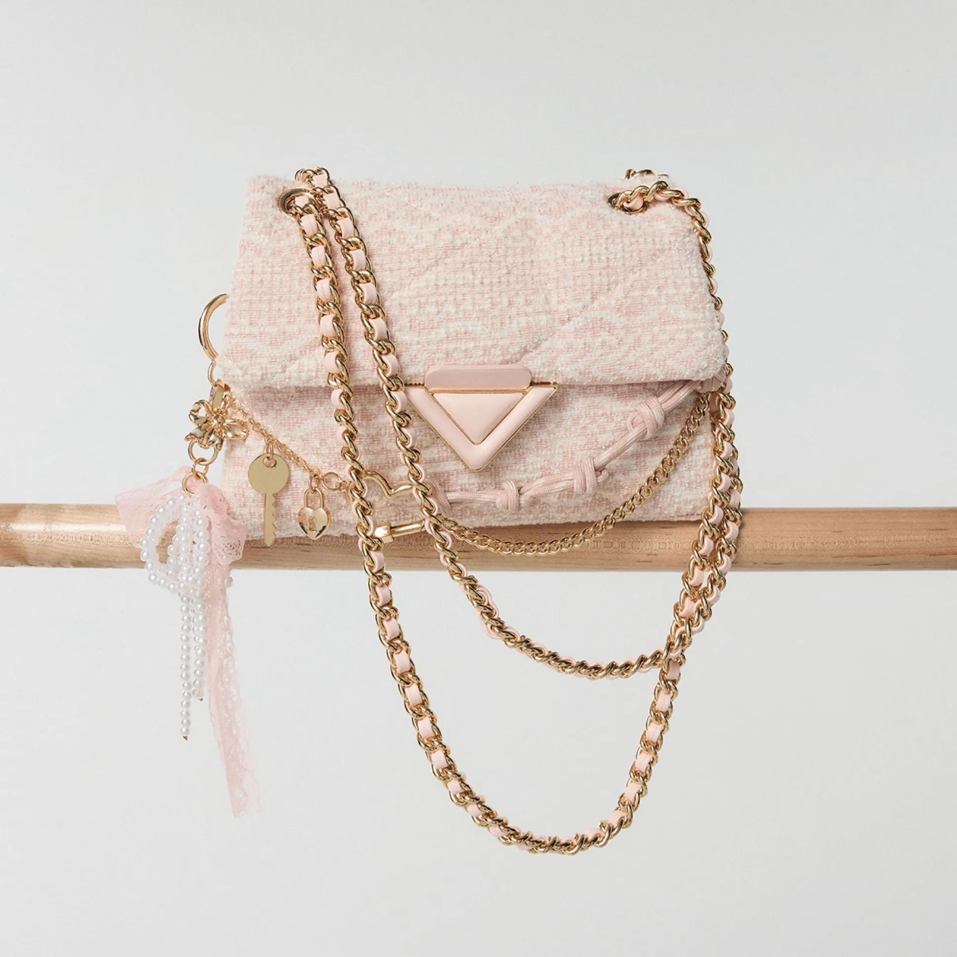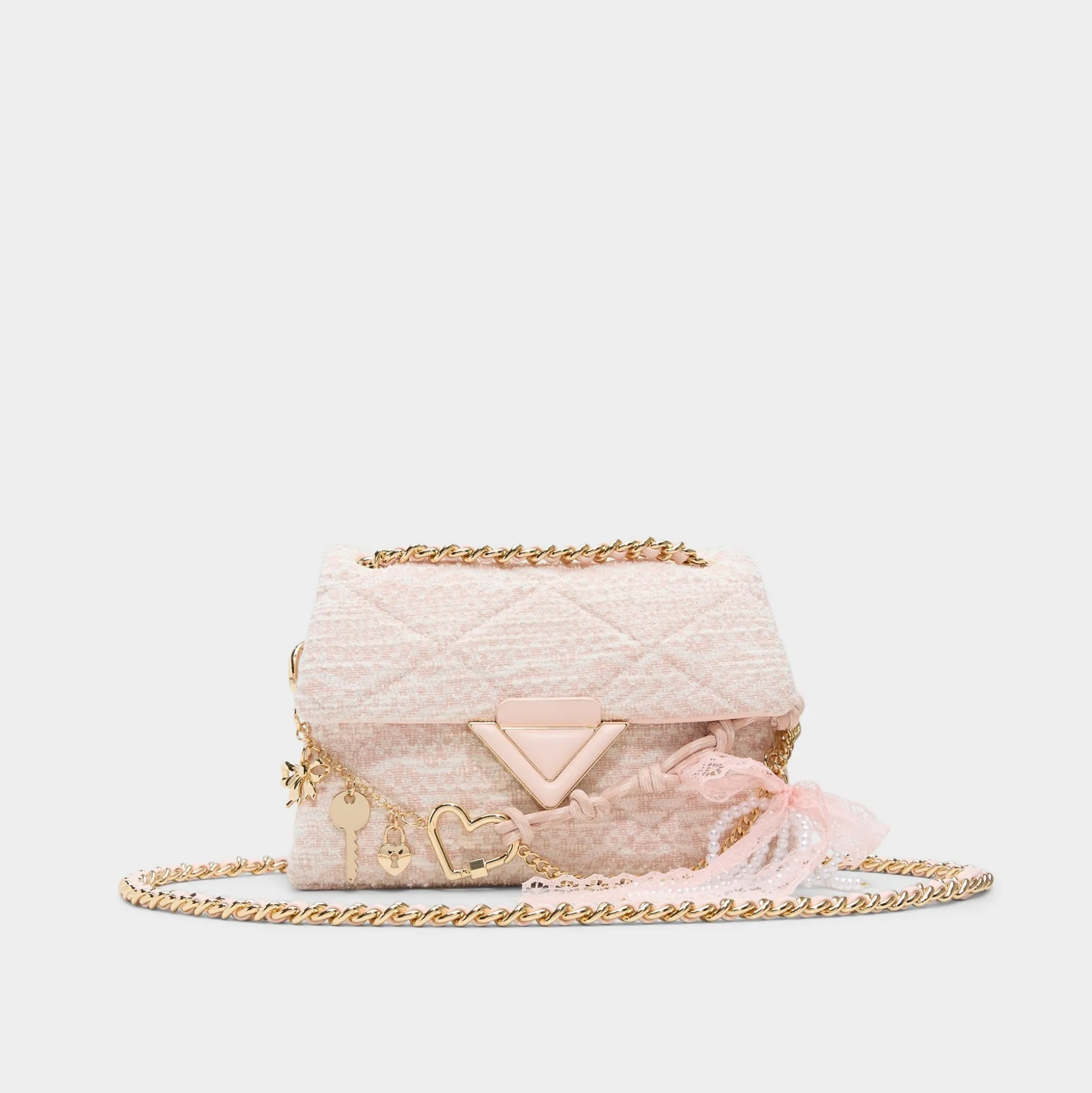 Blush tweed quilting wraps this mini shoulder bag in texture-rich charm, crowned by a gold-tone charm chain and a lacy bow you can untie to swap the vibe from coffee runs to brunch dates. Sling it with a pastel blazer for coffee runs or tuck it under a silky slip for rooftop sunsets to finish the look.